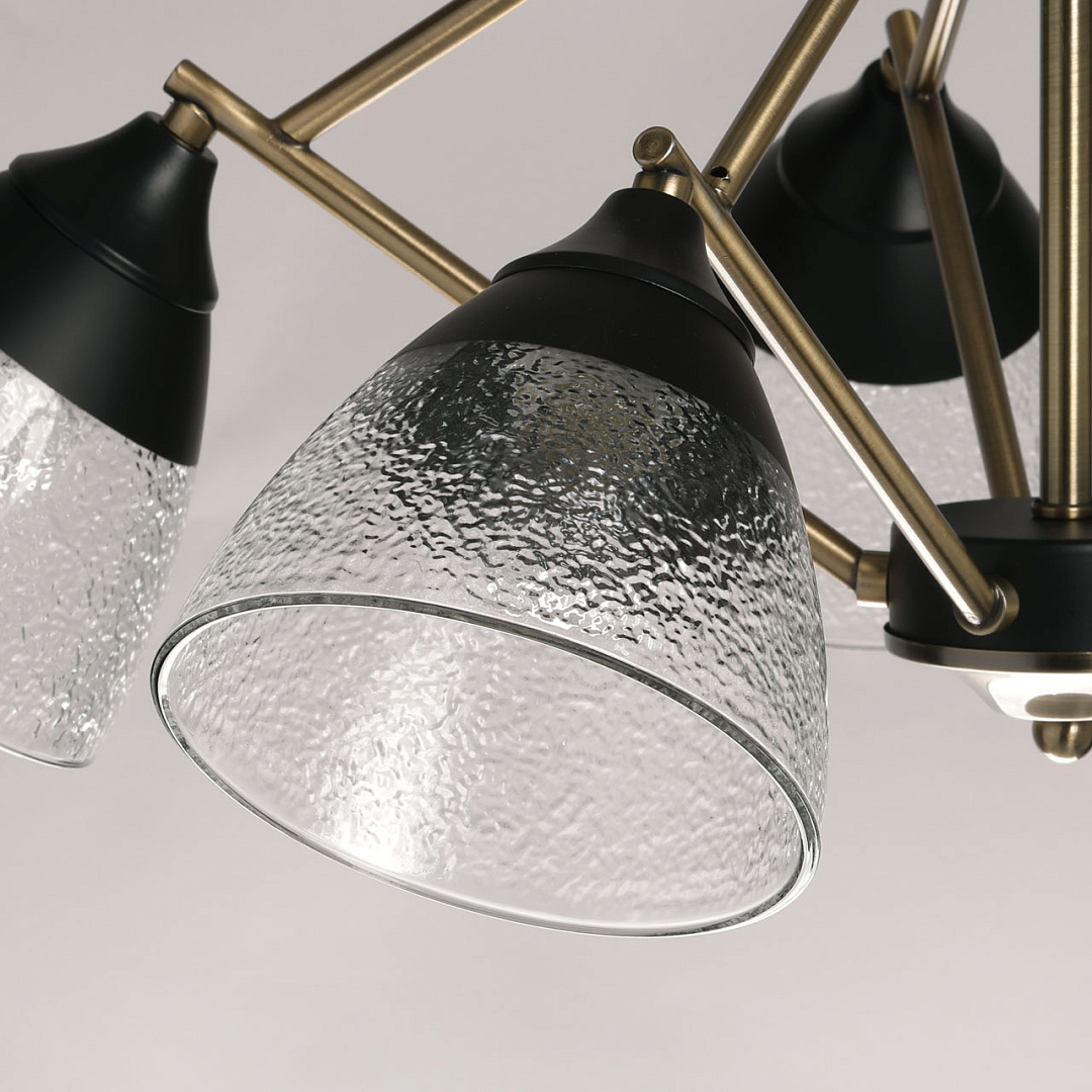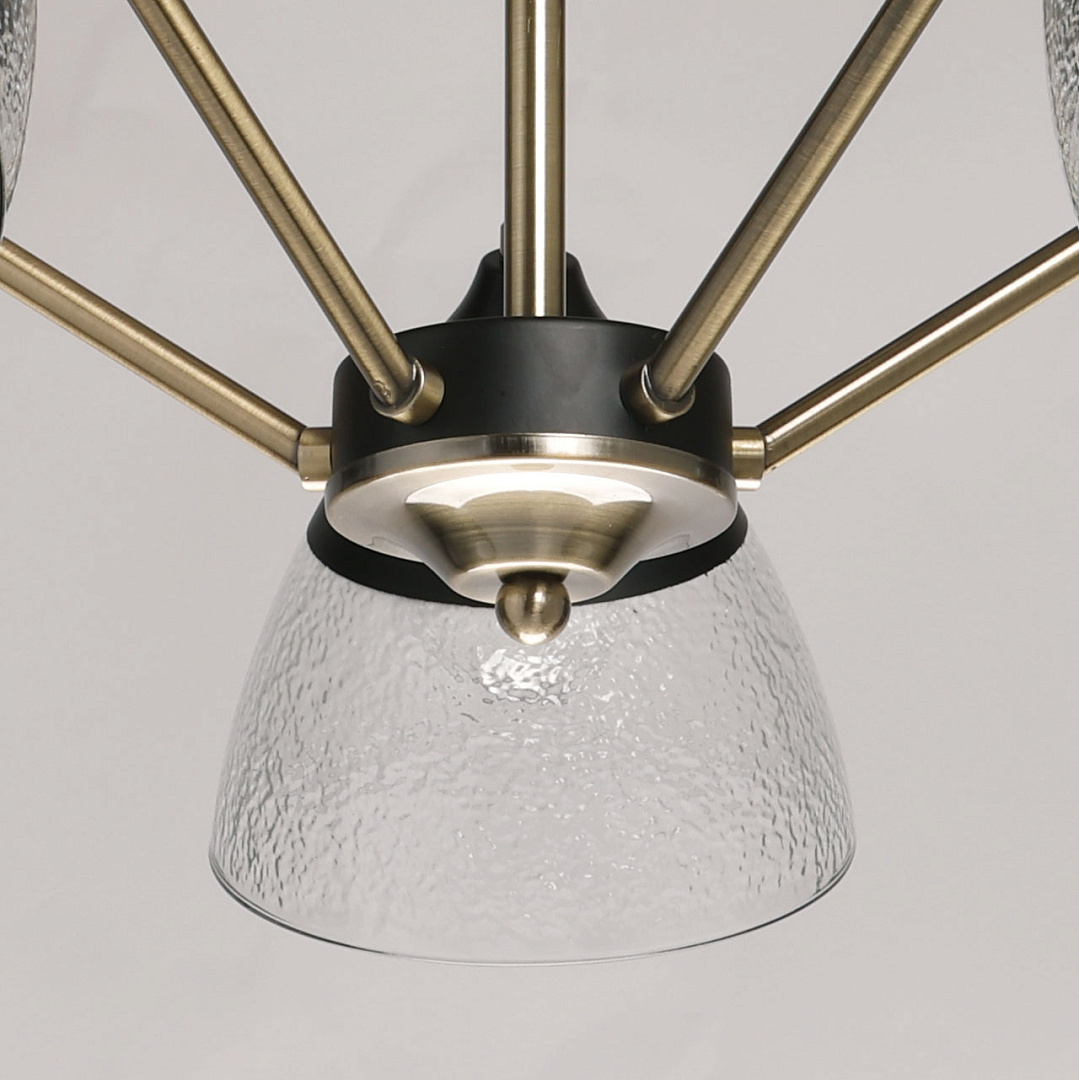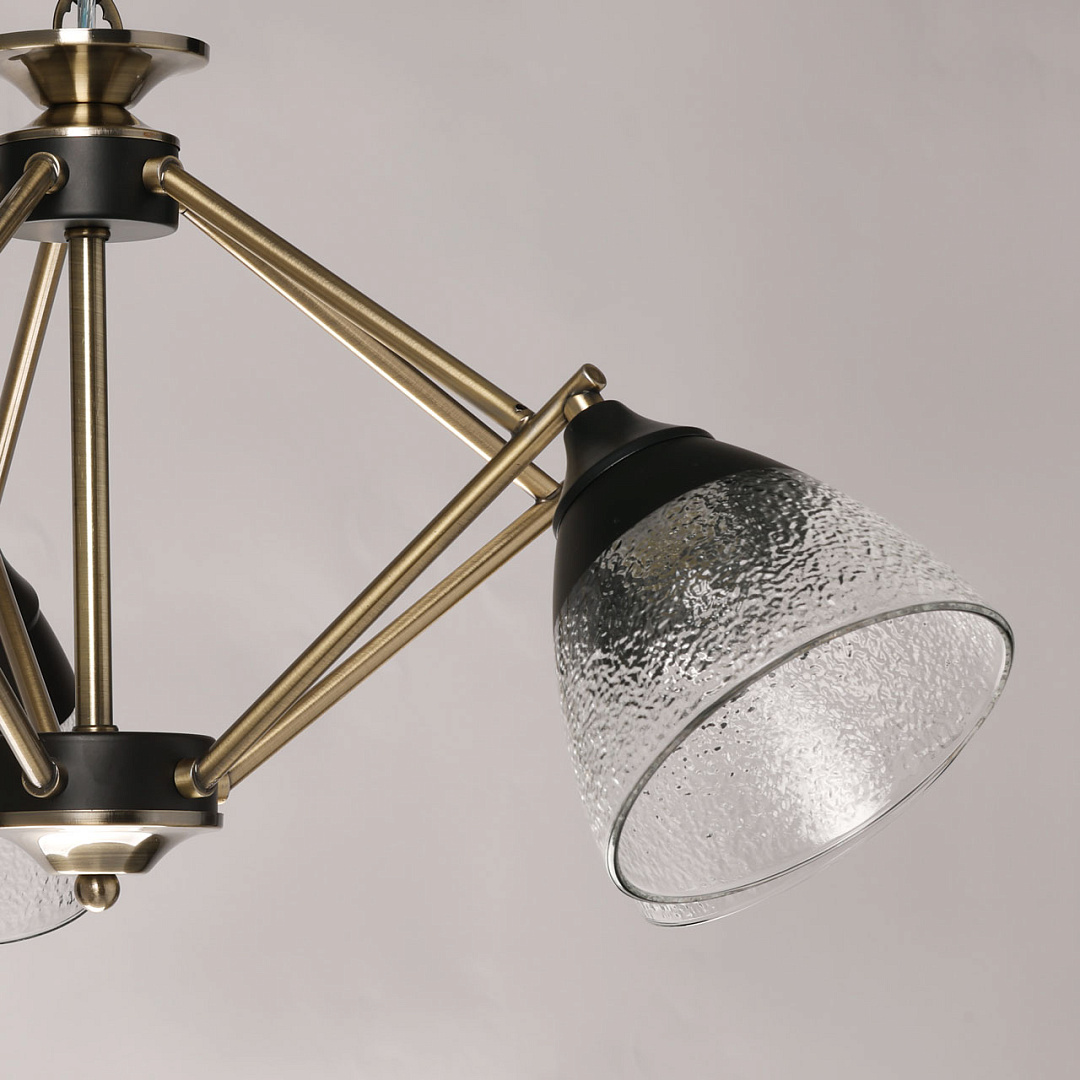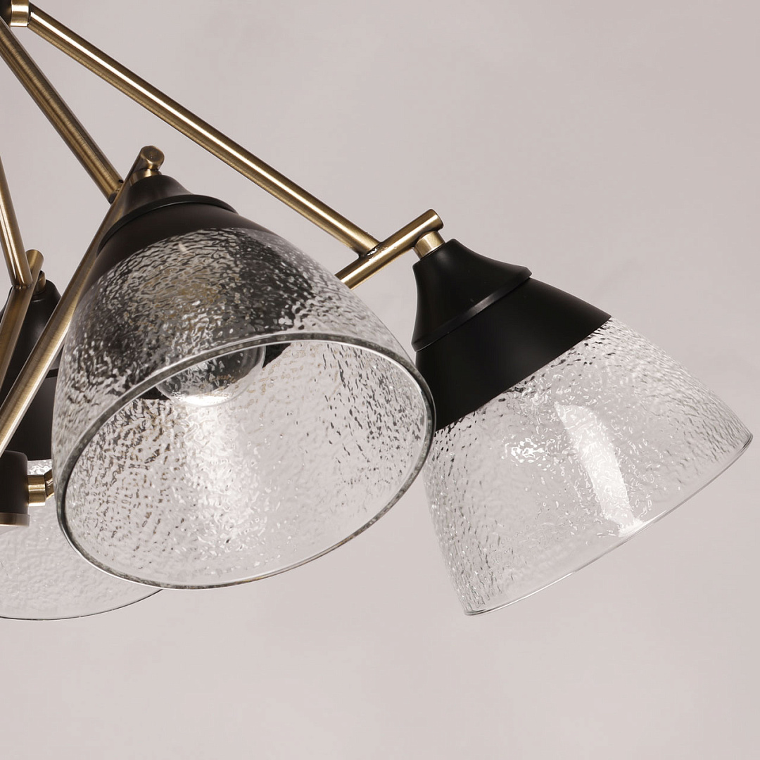 Элементы цвета латуни эффектно контрастируют с черным основанием. Линейный дизайн придает подвесной люстре технологичности. Фактурное стекло плафонов красиво преломляет свет. Плафоны, направленные вниз, хорошо освещают пространство комнаты.  Компактный размер потолочной люстры позволяет сохранить пространство комнаты при стандартном потолке. Заменяемые источники света удобны в эксплуатации.