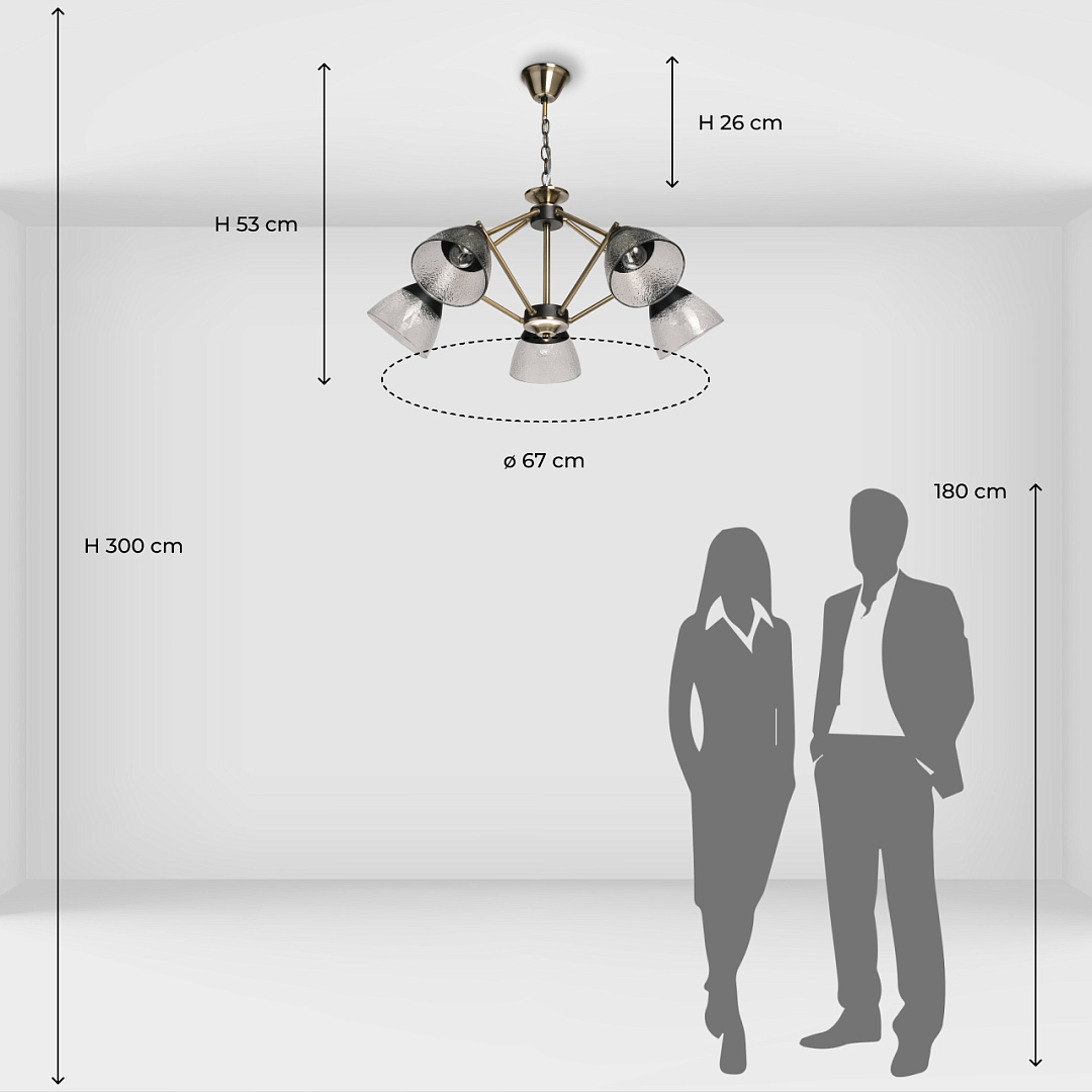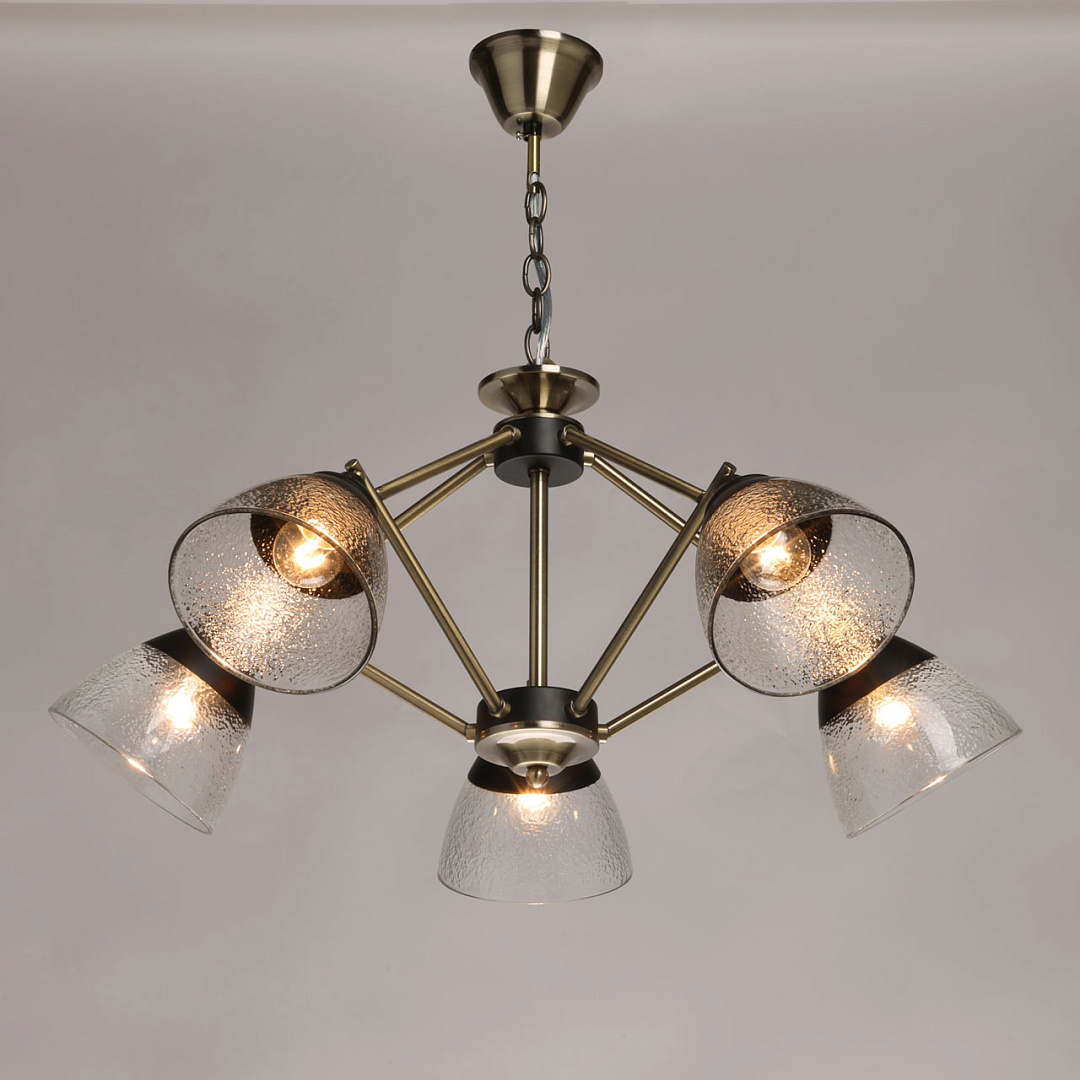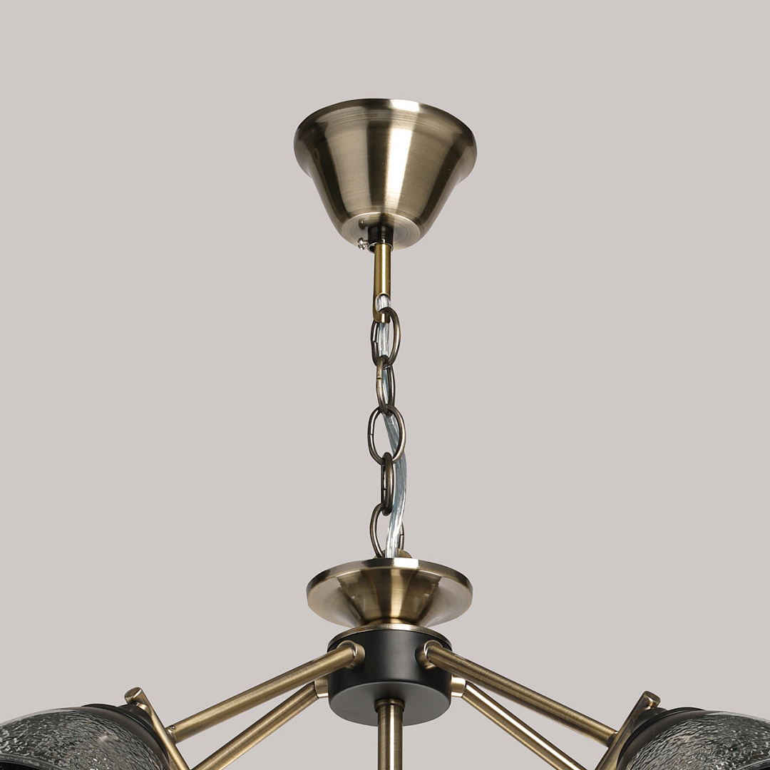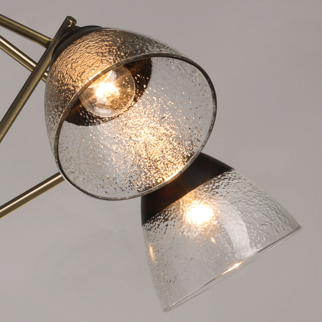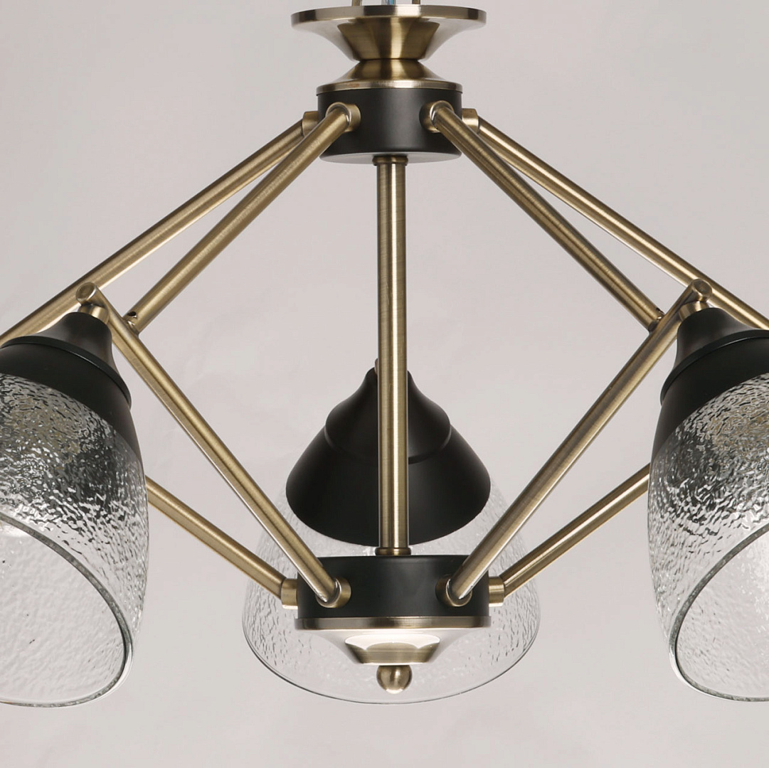 Элементы цвета латуни эффектно контрастируют с черным основанием. Линейный дизайн придает подвесной люстре технологичности. Фактурное стекло плафонов красиво преломляет свет. Плафоны, направленные вниз, хорошо освещают пространство комнаты.  Компактный размер потолочной люстры позволяет сохранить пространство комнаты при стандартном потолке. Заменяемые источники света удобны в эксплуатации.