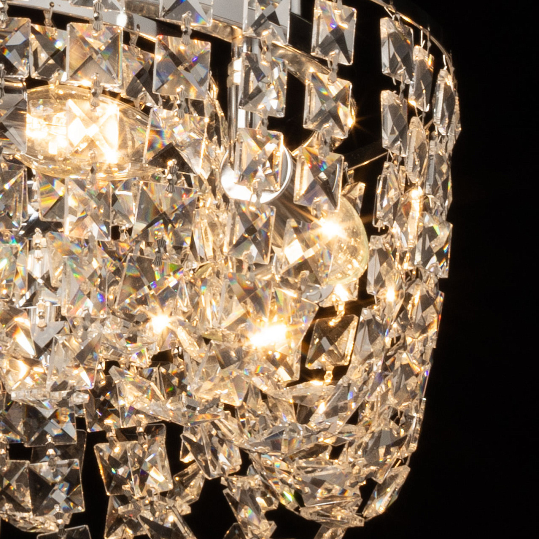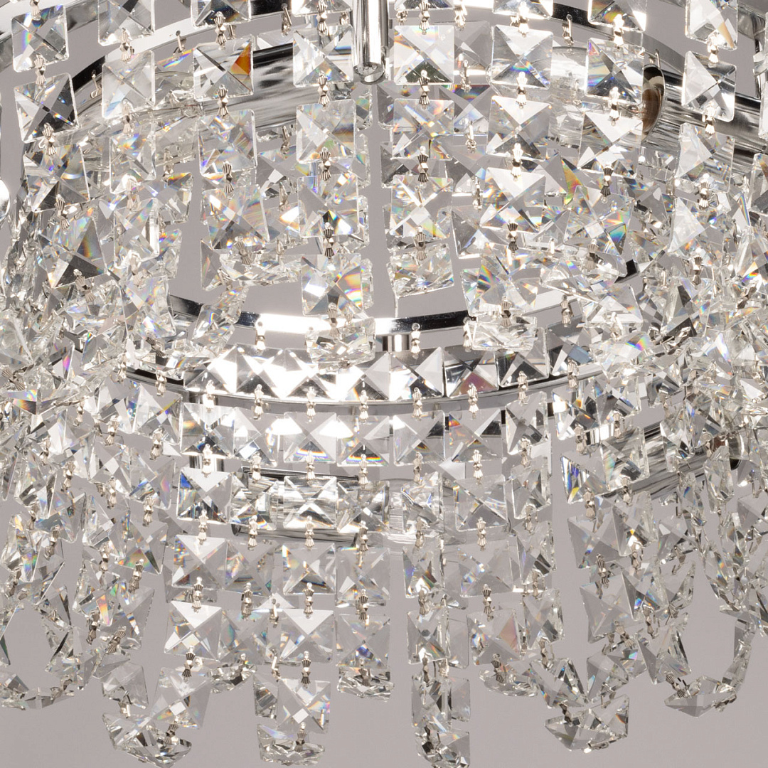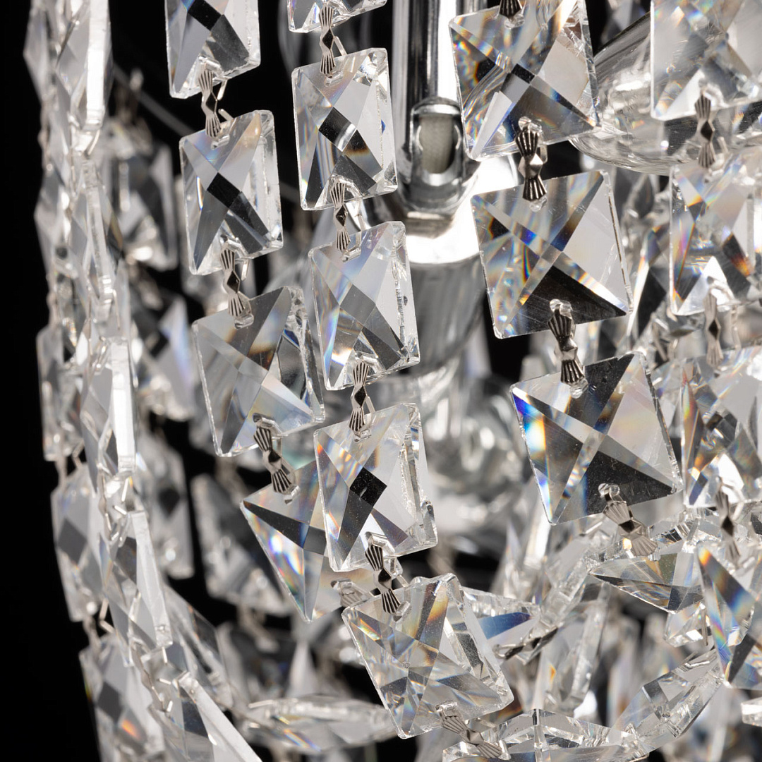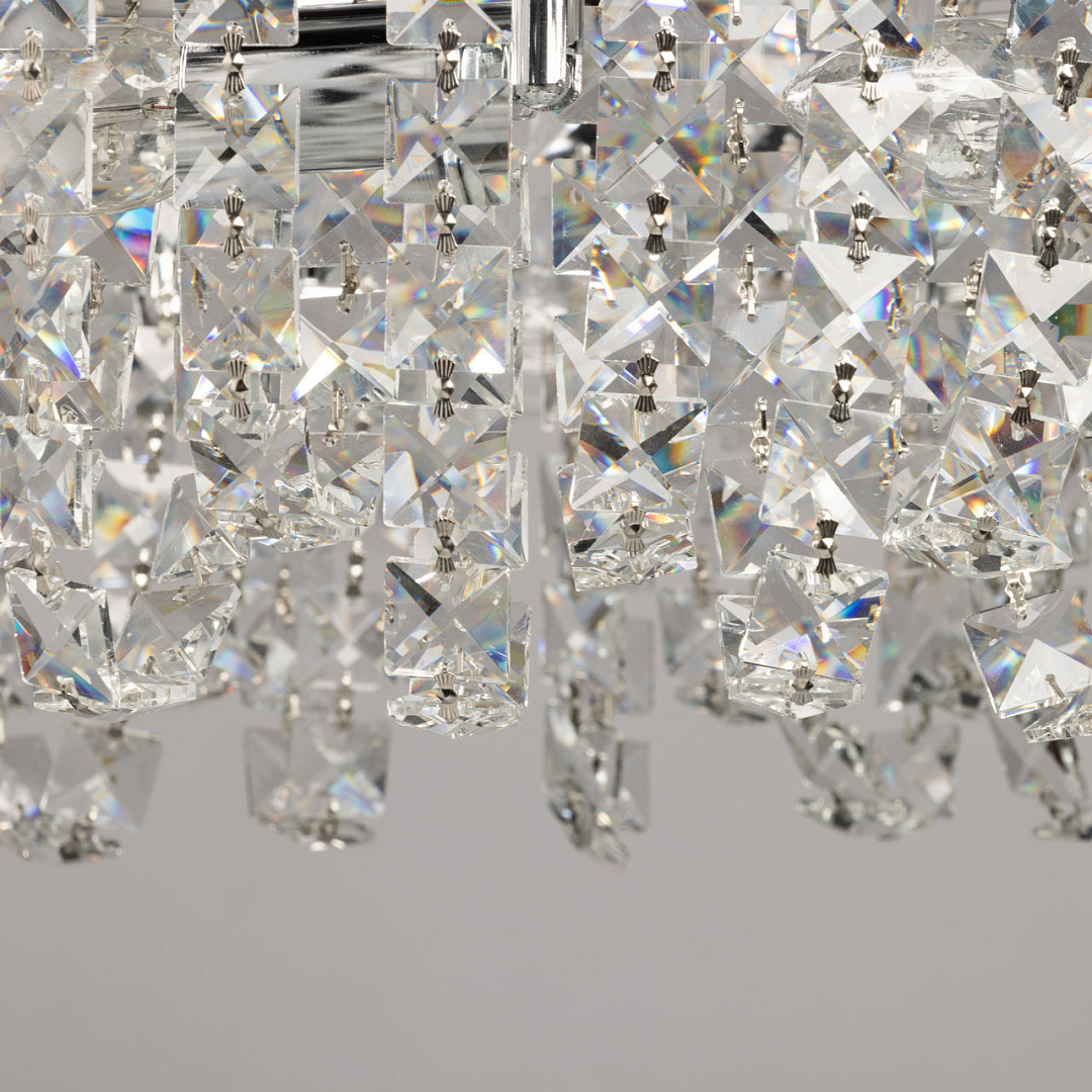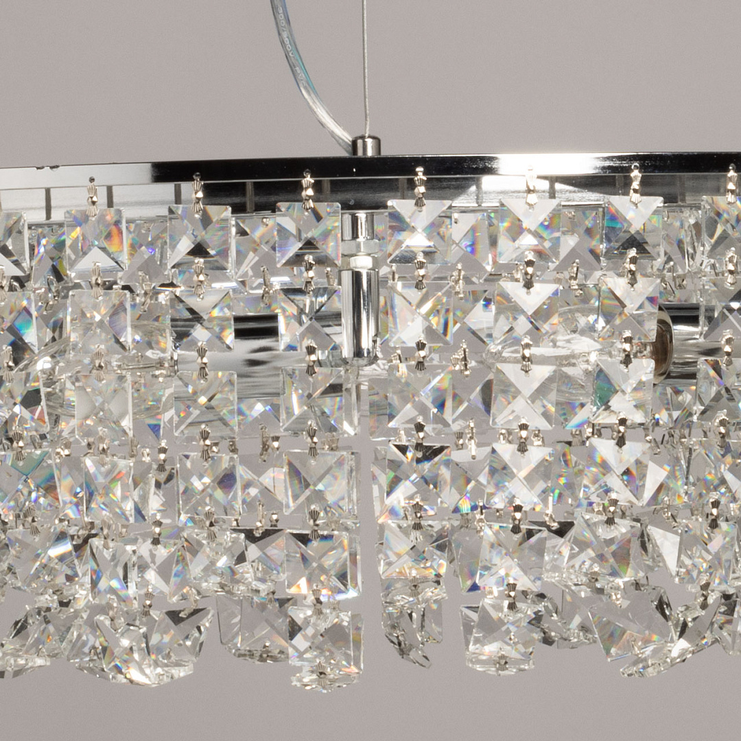 Популярный цвет хрома основания всегда в тренде. Подвески из хрусталя из прозрачных октагонов создают красивую игру света. Заменяемые источники света удобны в эксплуатации. Возможность регулировать комфортную высоту.