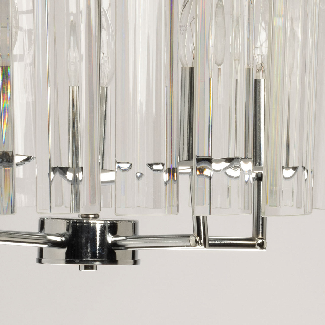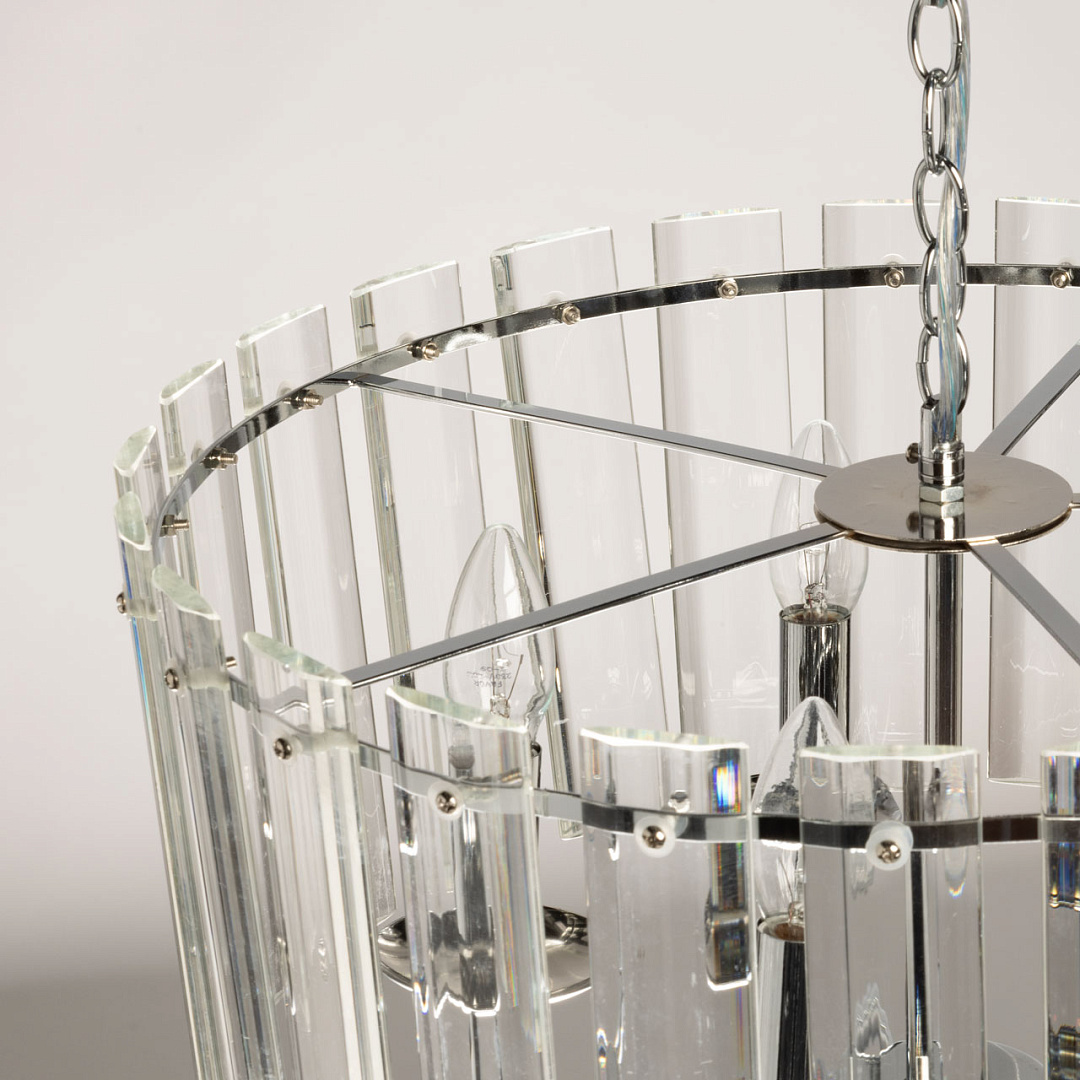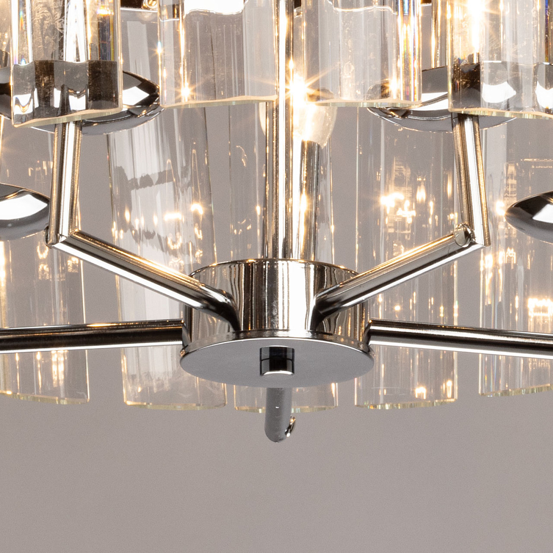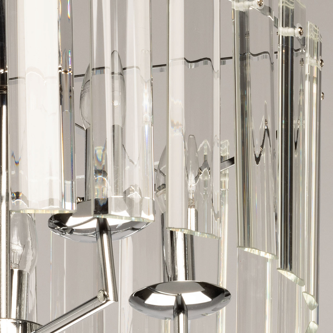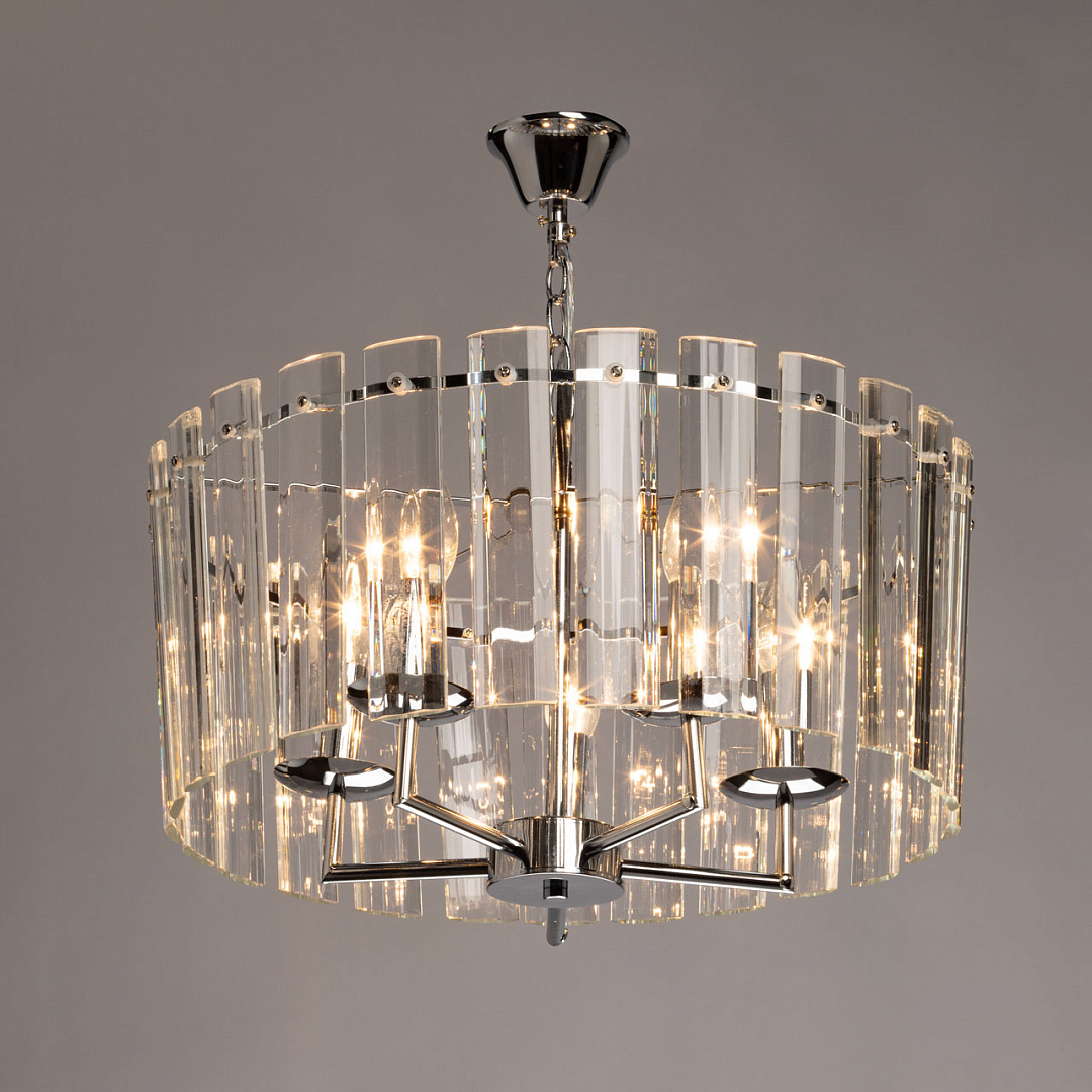 Трендовый дизайн люстры добавляет шика в интерьер.Прозрачное стекло создает красивую игру света и праздничное настроение, и делает люстру заметным акцентом в интерьере. Заменяемые источники света удобны в эксплуатации. Возможность регулировки высоты светильника позволяет создать комфортные условия освещения.