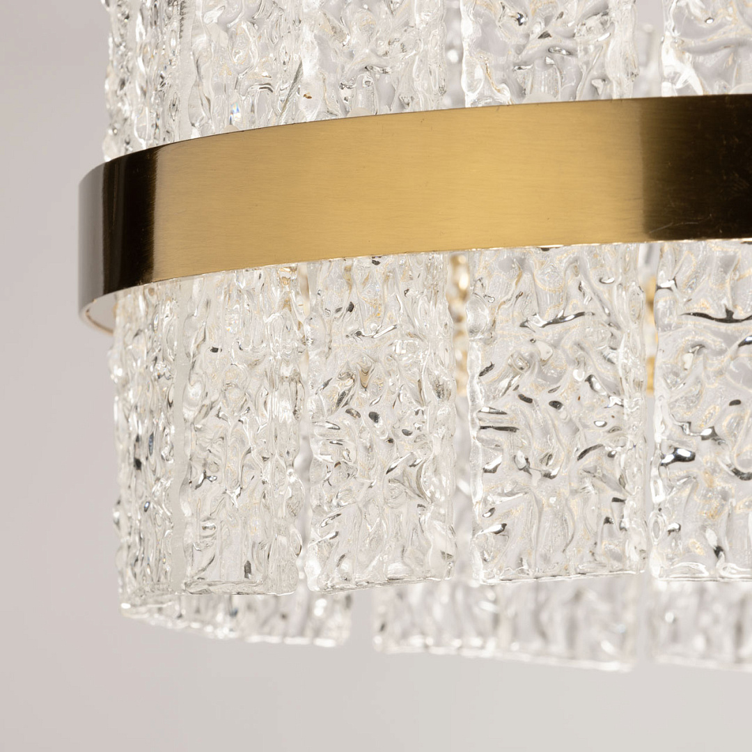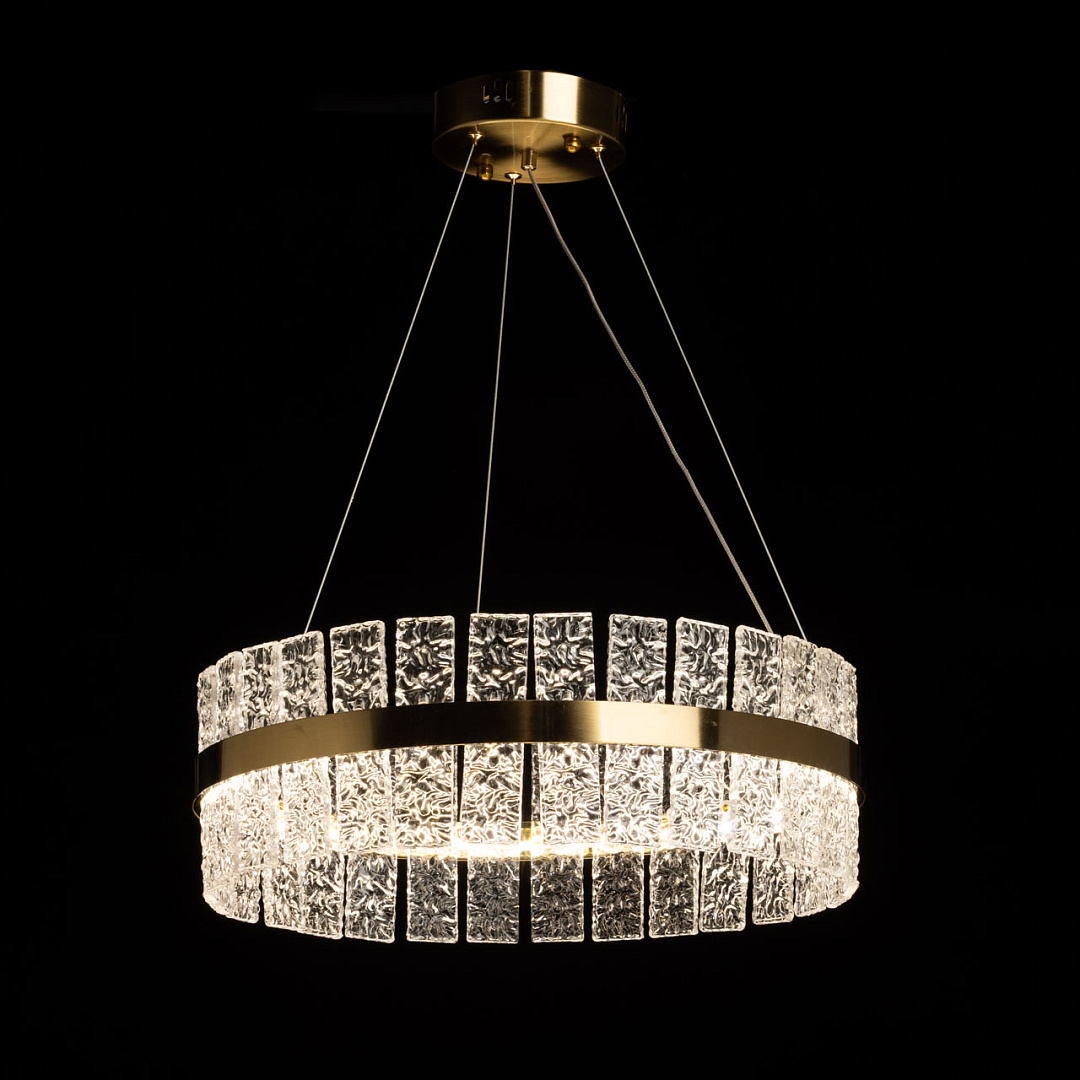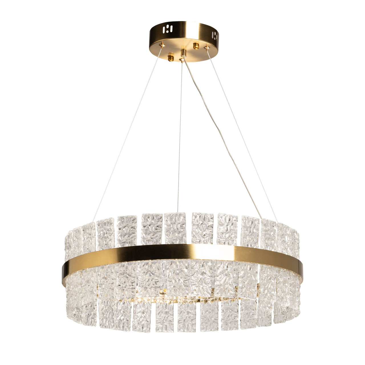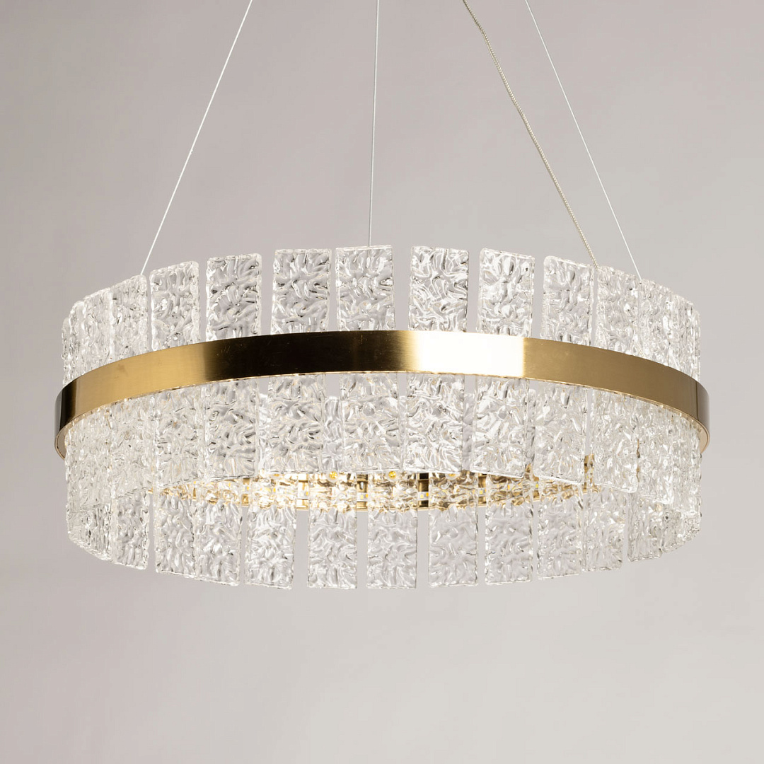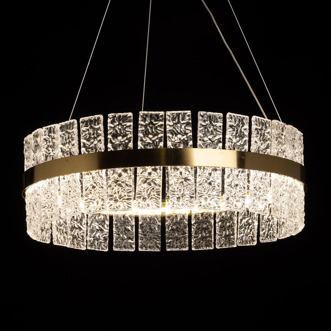 Подвесная люстра привлекает внимание необычным дизайном, добавляя элегантности интерьеру. Актуальный золотой цвет основания дополняет изысканный декор из фактурных стеклянных пластин. Фактура прозрачного вулканического стекла разбивает световой поток на множество ярких бликов, которые создают в комнате романтичную атмосферу. Многорежимность с изменением цветовой температуры от 3000К до 6500К является элементом светодизайна. Качественные светодиоды обеспечивают яркое освещение и долгий срок службы. Наличие ПДУ позволяет удобно устанавливать сценарий освещения. Возможность регулировать комфортную высоту. Встроенные светодиоды экономичны и безопасны.