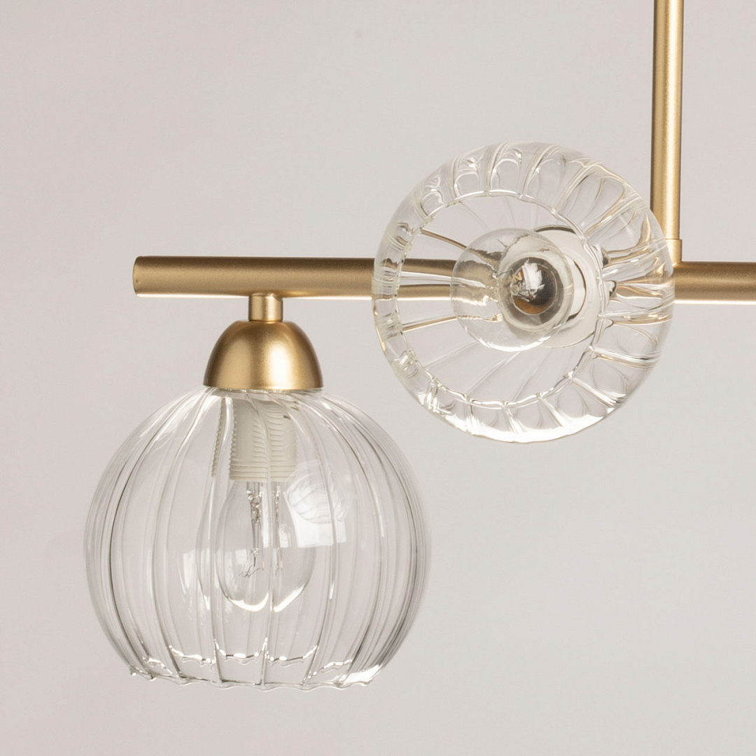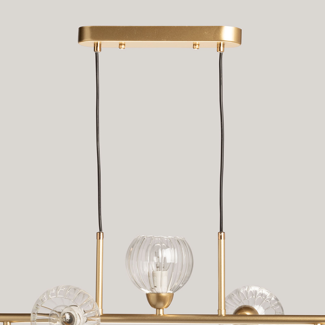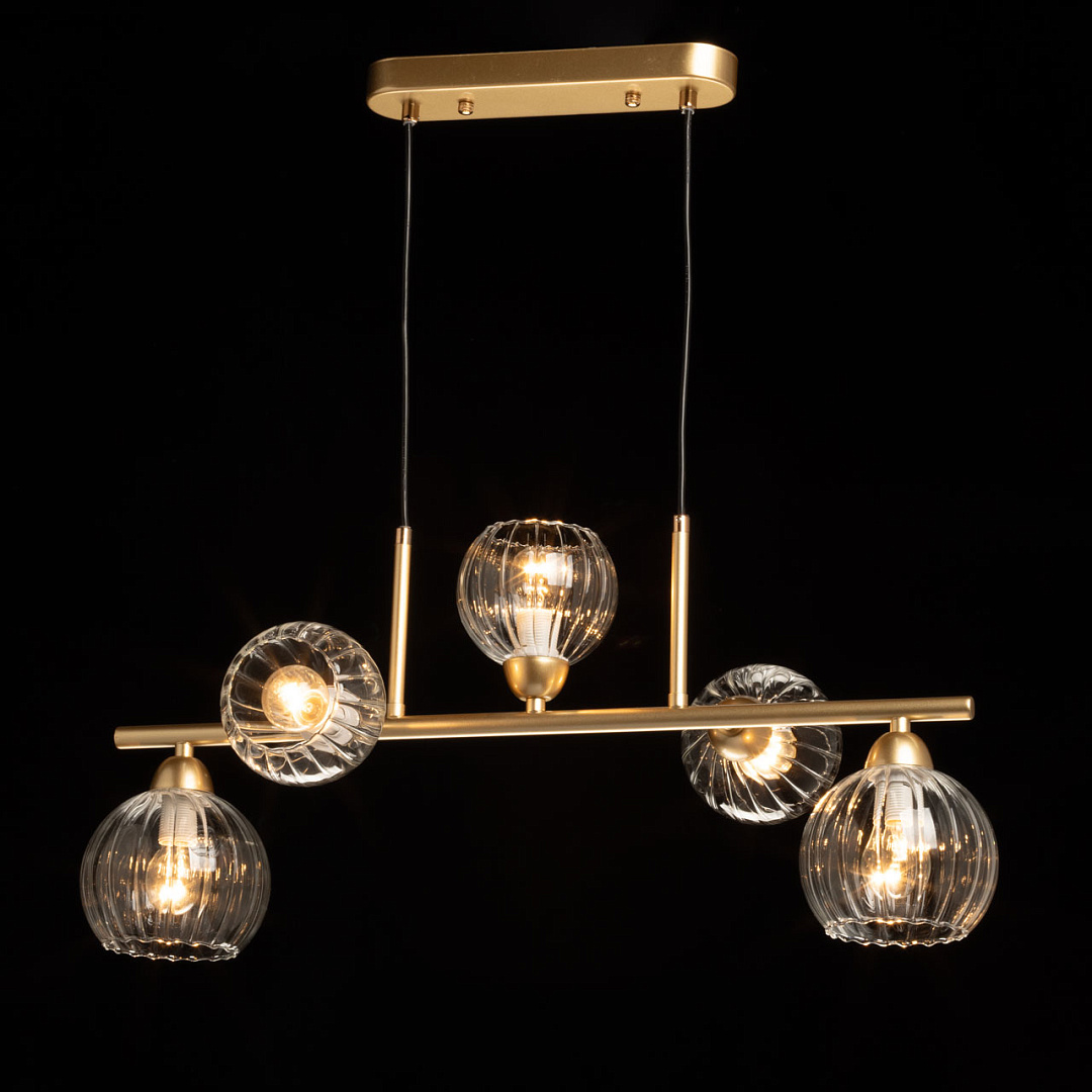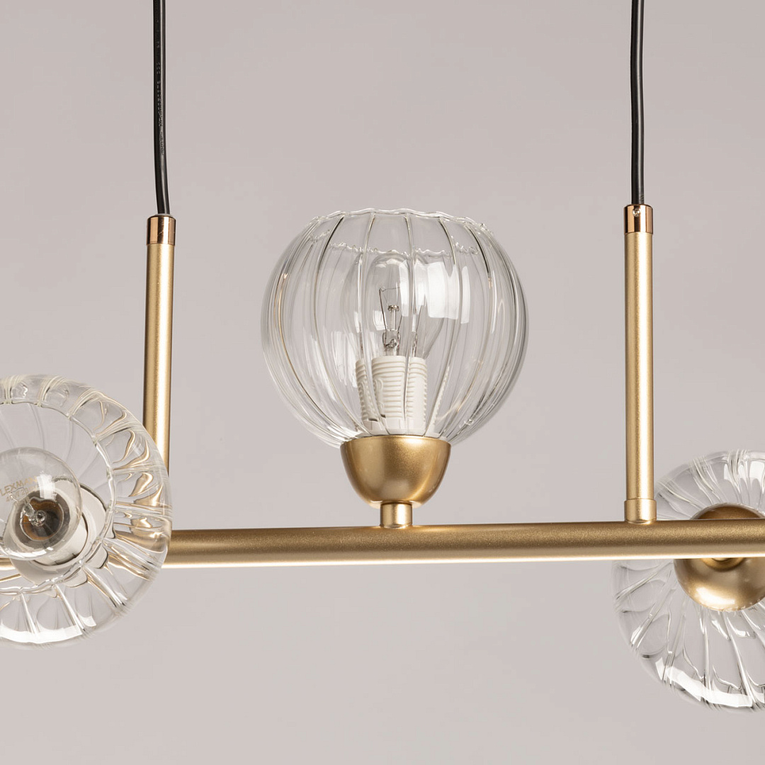 Люстра станет отличным дополнением к интерьеру в стиле модерн или хай-тек. Цвет медовой бронзы добавит теплоты и уюта в комнату, а асимметричное расположение стеклянных плафонов придает ей оригинальность и индивидуальность. Прозрачный цвет плафонов позволяет свету равномерно распределяться по помещению. Заменяемые источники света делают ее удобной в использовании, а возможность регулировки высоты позволит адаптировать ее под любой потолок.