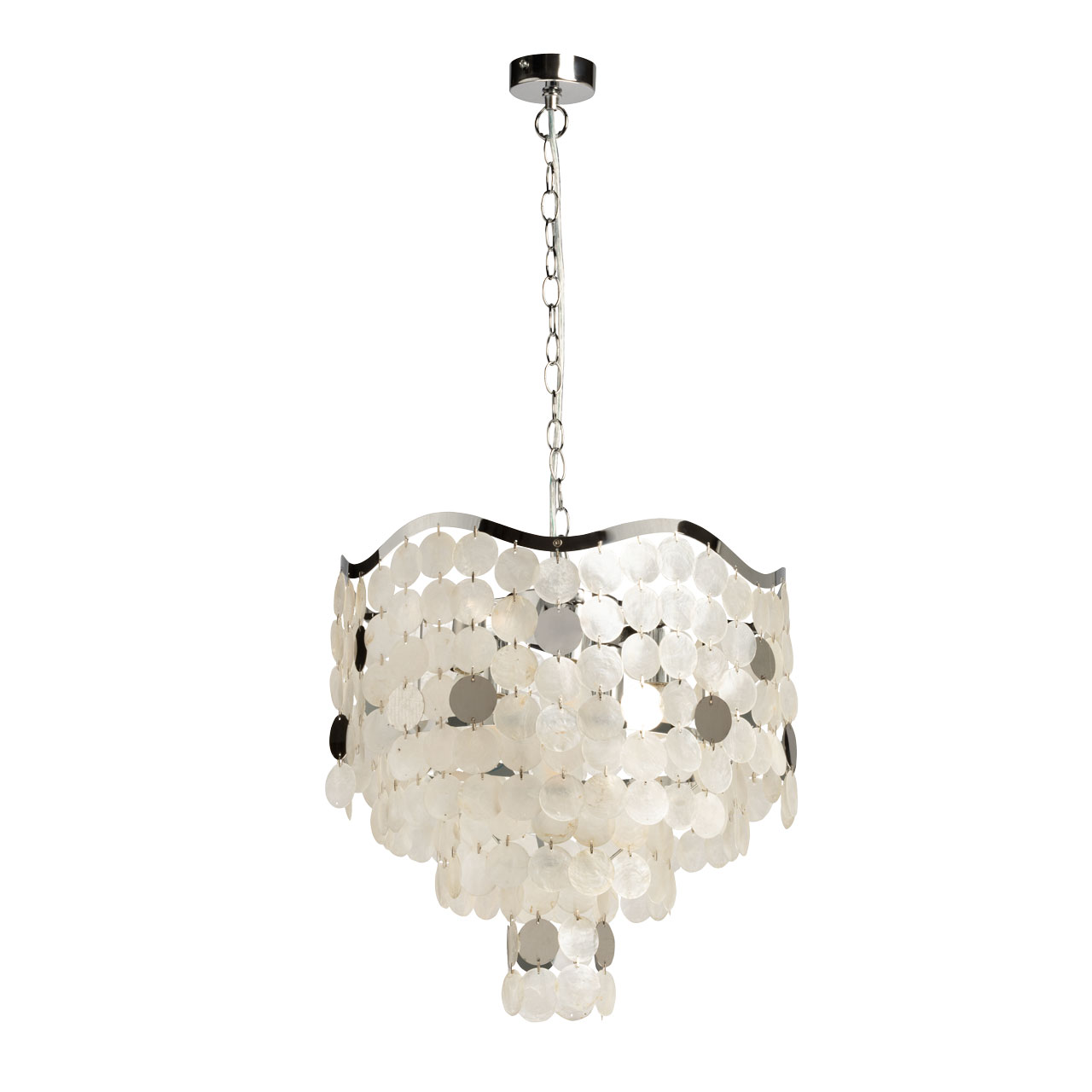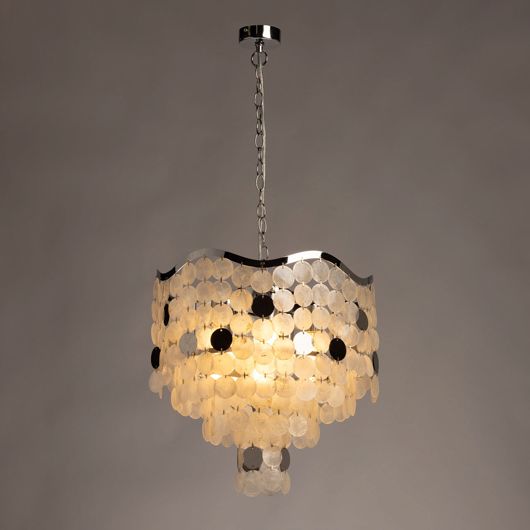 Подвесная люстра привлекает внимание необычным дизайном и гармоничным сочетанием цветов.Актуальный цвет хрома основания дополняет изысканный декор из фактурных стеклянных пластин цвета ракушек, которые разбивают световой поток на множество ярких бликов, которые создают в комнате романтичную атмосферу.Возможность регулировать комфортную высоту.Заменяемые источники света удобны в эксплуатации.