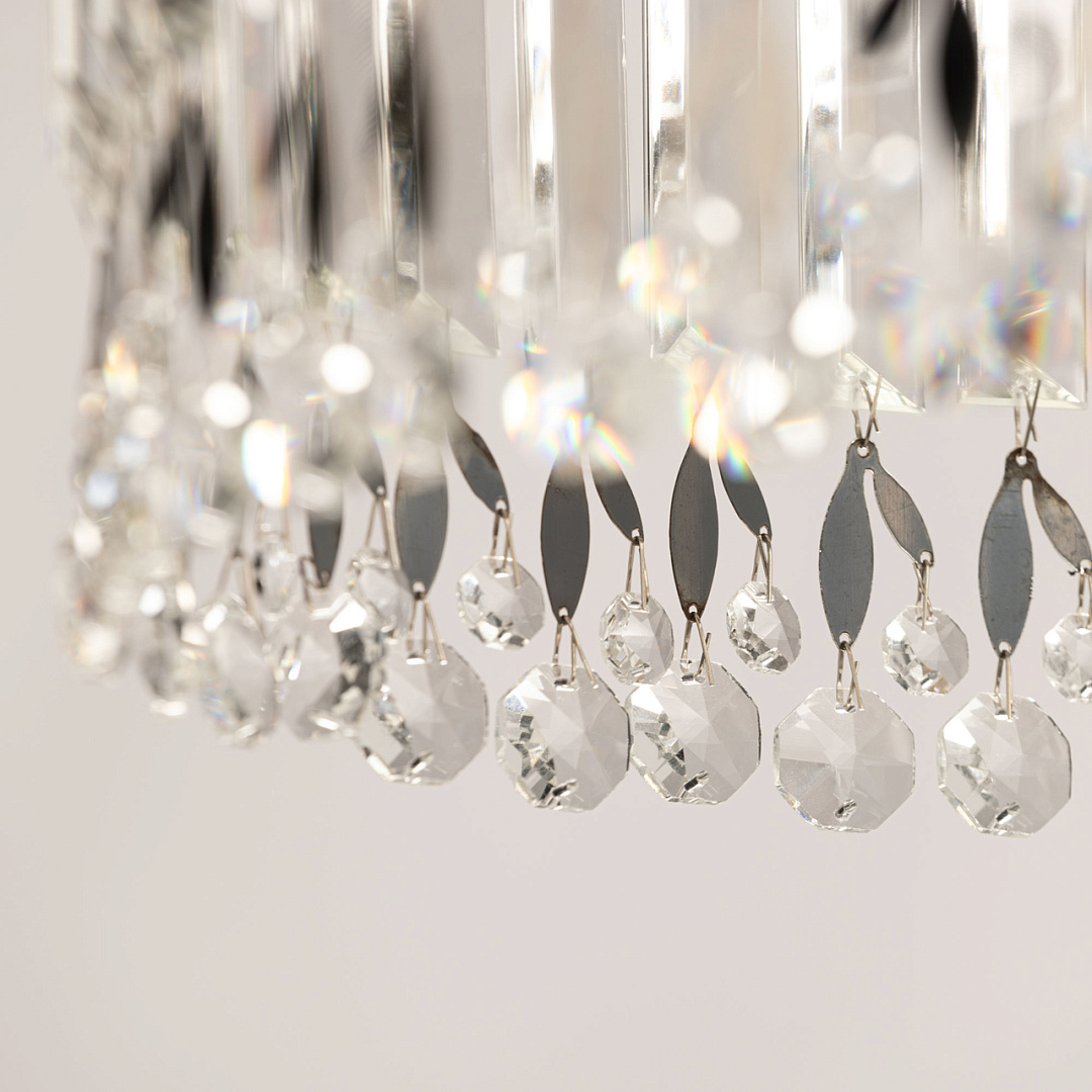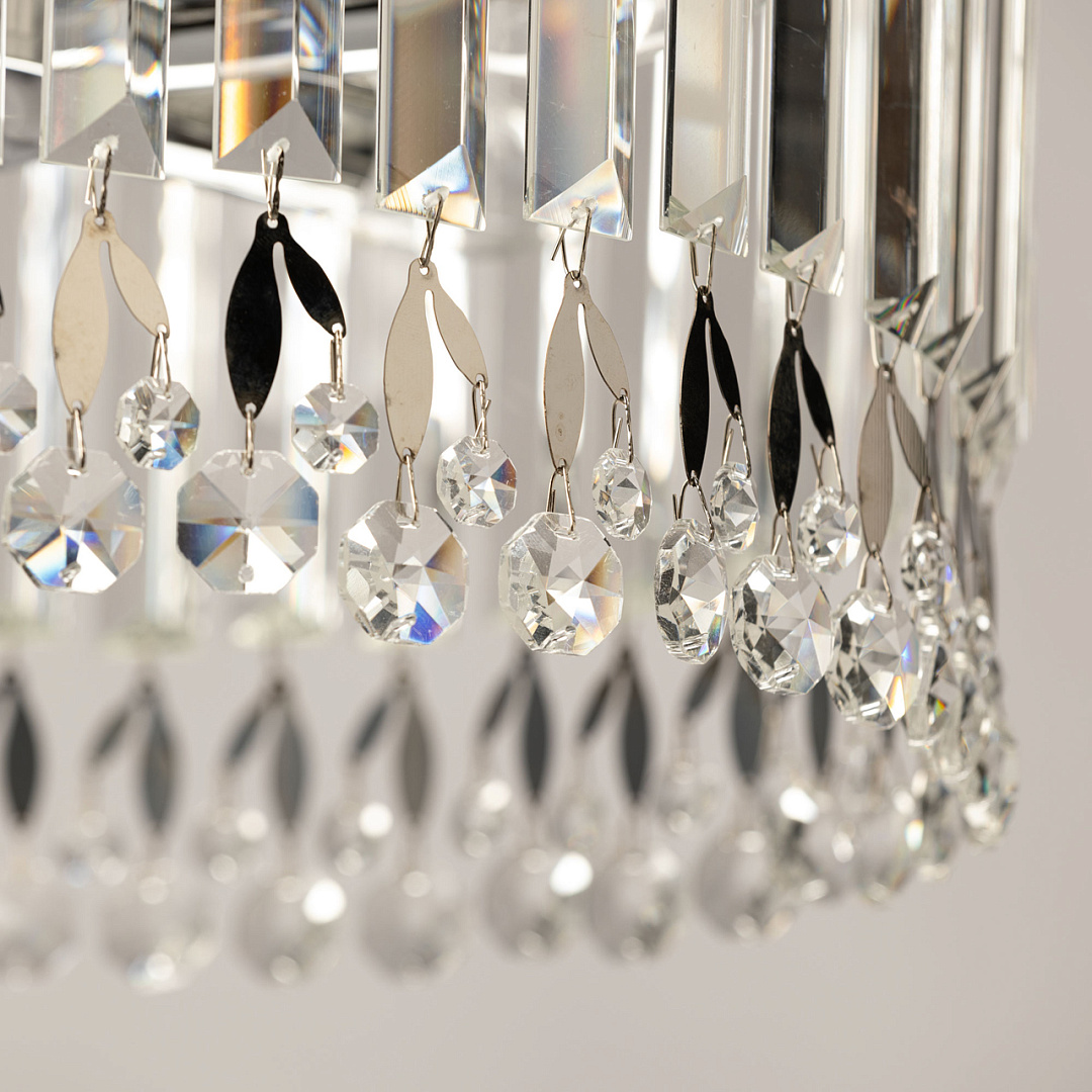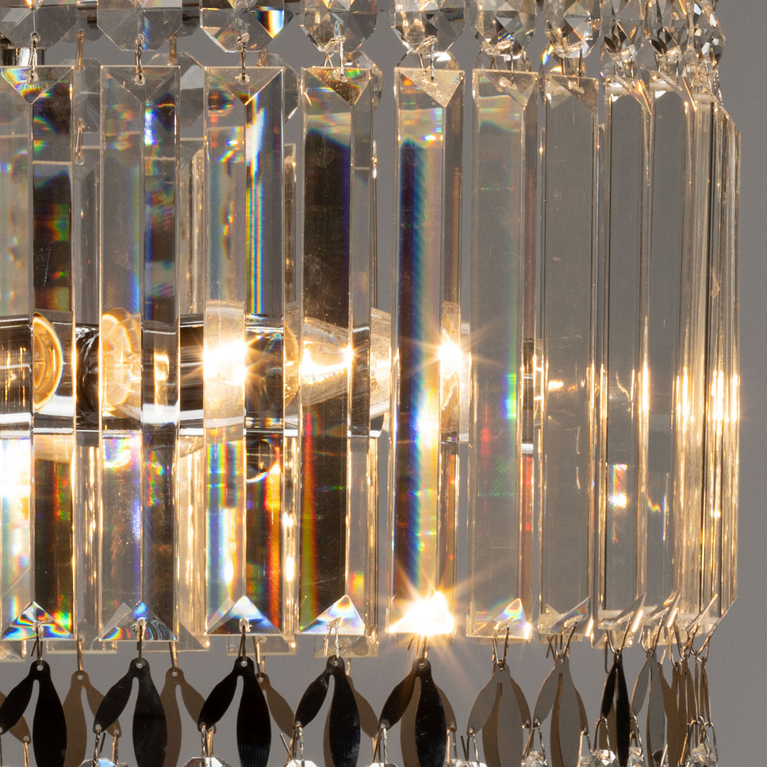 Трендовый дизайн люстры с богатым декором добавляет шика в интерьер.Прозрачный хрусталь создает красивую игру света и праздничное настроение, и делает люстру заметным акцентом в интерьере. Заменяемые источники света удобны в эксплуатации. Возможность регулировки высоты светильника позволяет создать комфортные условия освещения.
