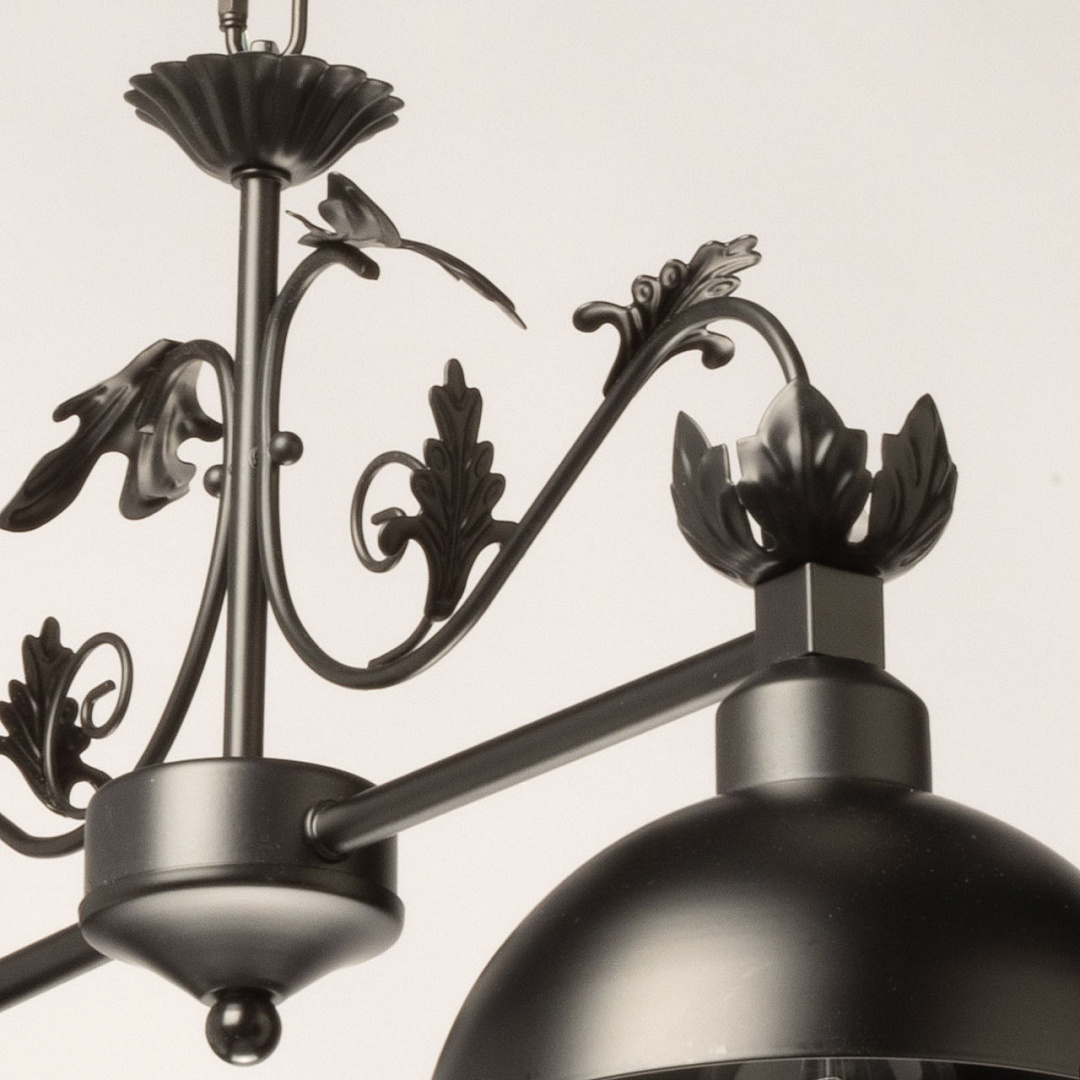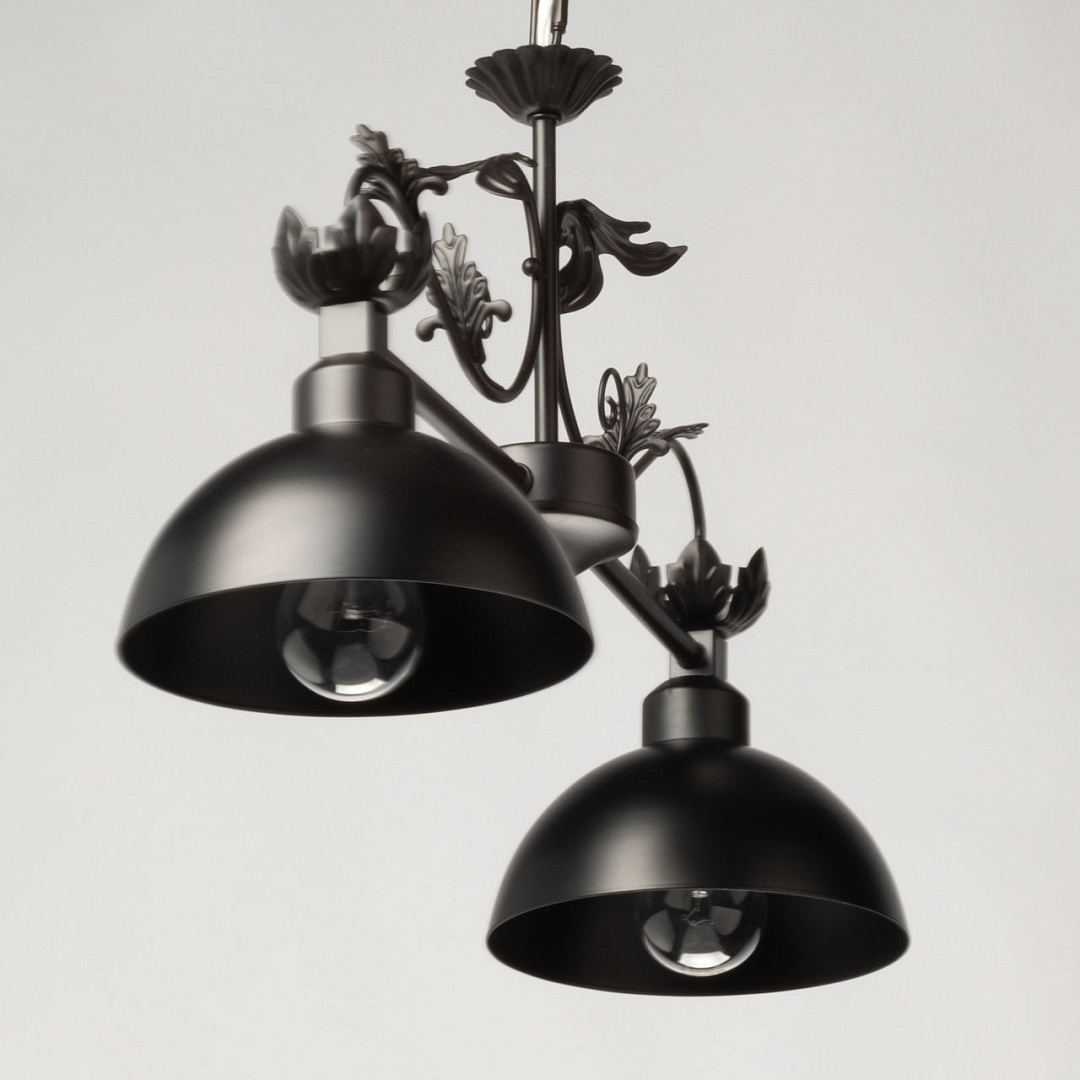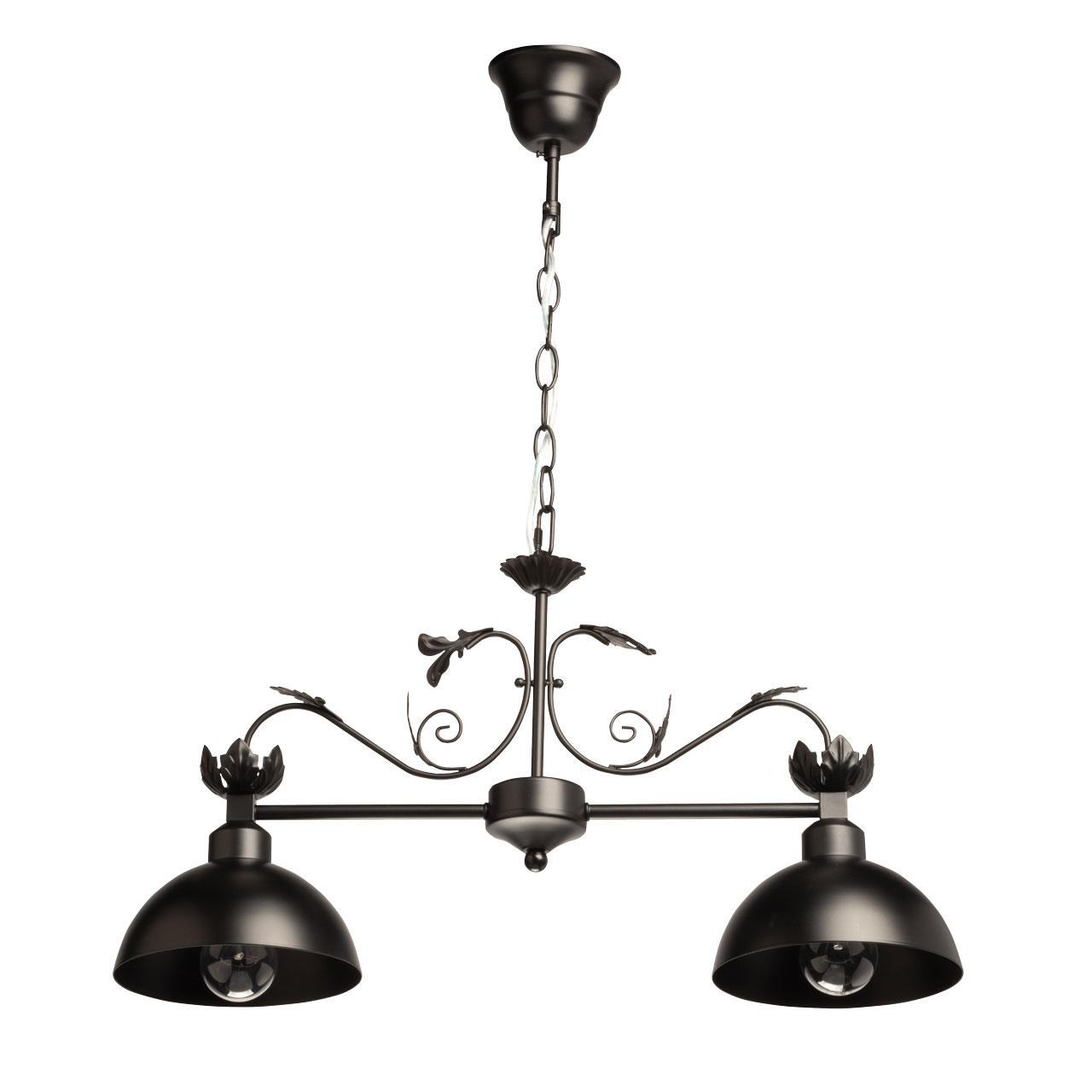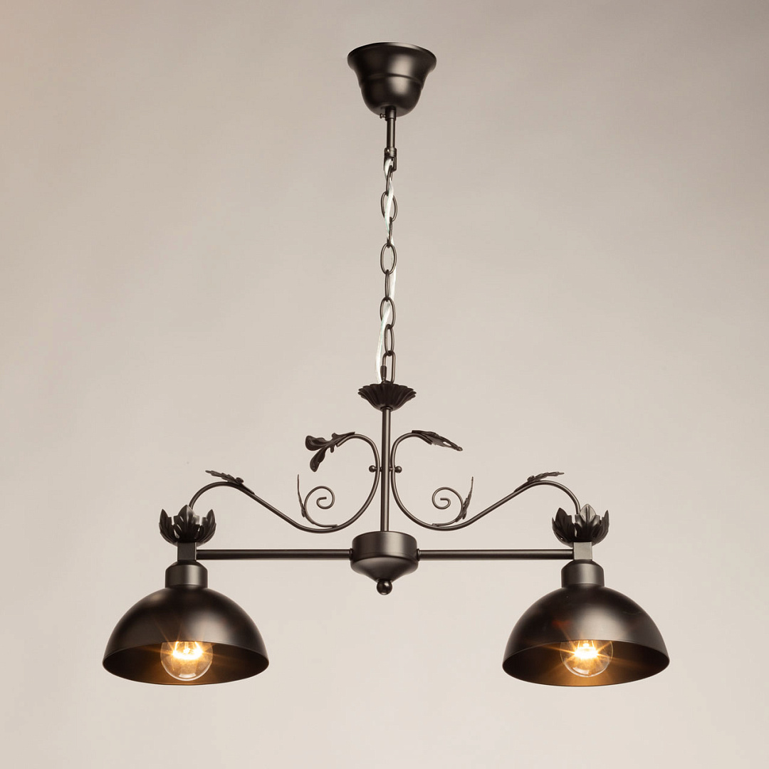 Металлический подвесной светильник идеально подойдет для освещения загородного дома в английском стиле или апартаментов в стиле лофт. Два плафона из  металла, окрашенного в черный цвет, закреплены на фигурном кованом основании. В качестве подвеса служит цепь, что позволяет регулировать высоту светильника. Люстра создаст романтическую атмосферу уютным вечером у камина, подойдет для оформления кабинета или библиотеки.