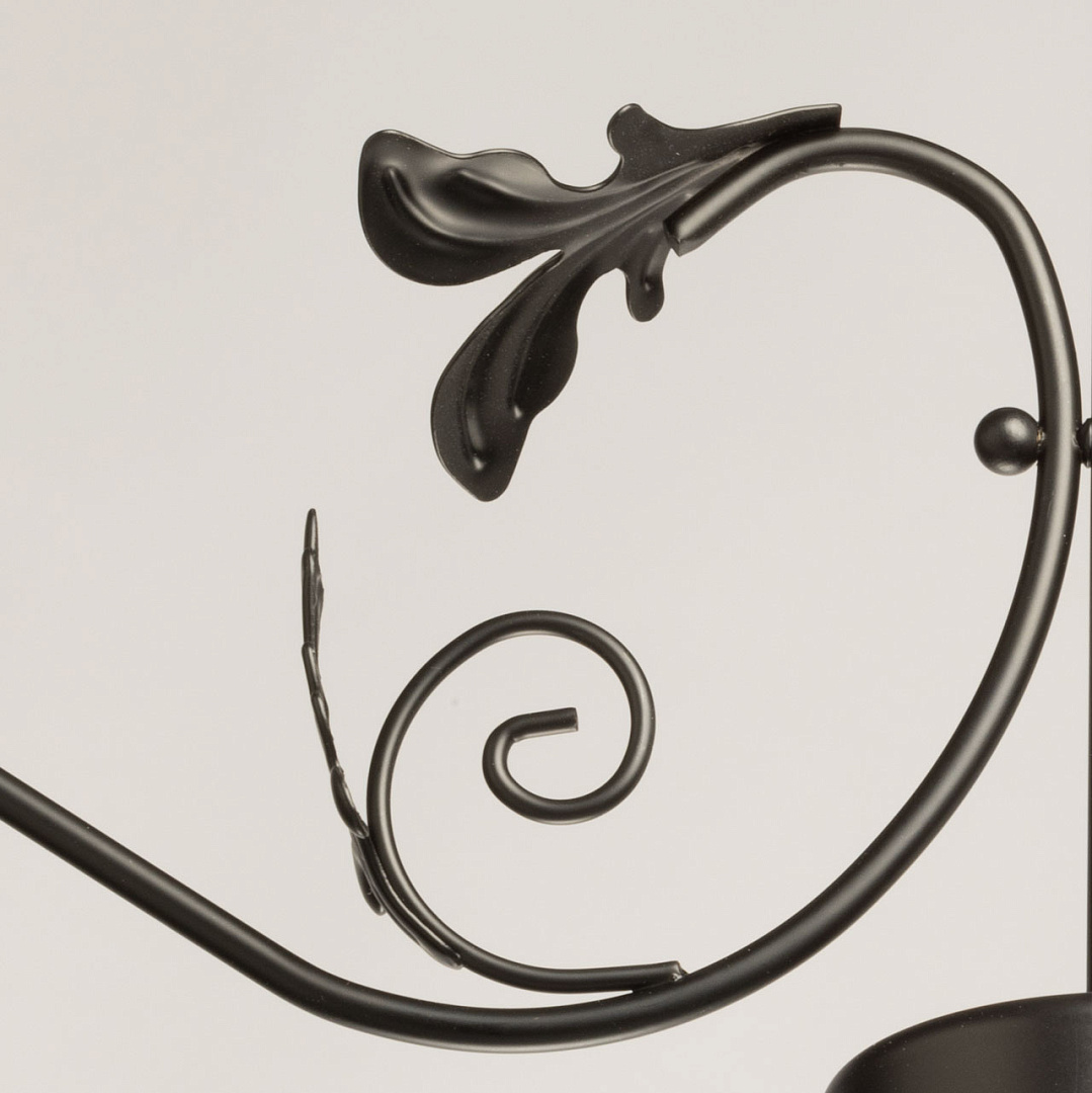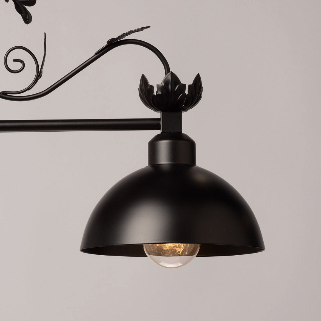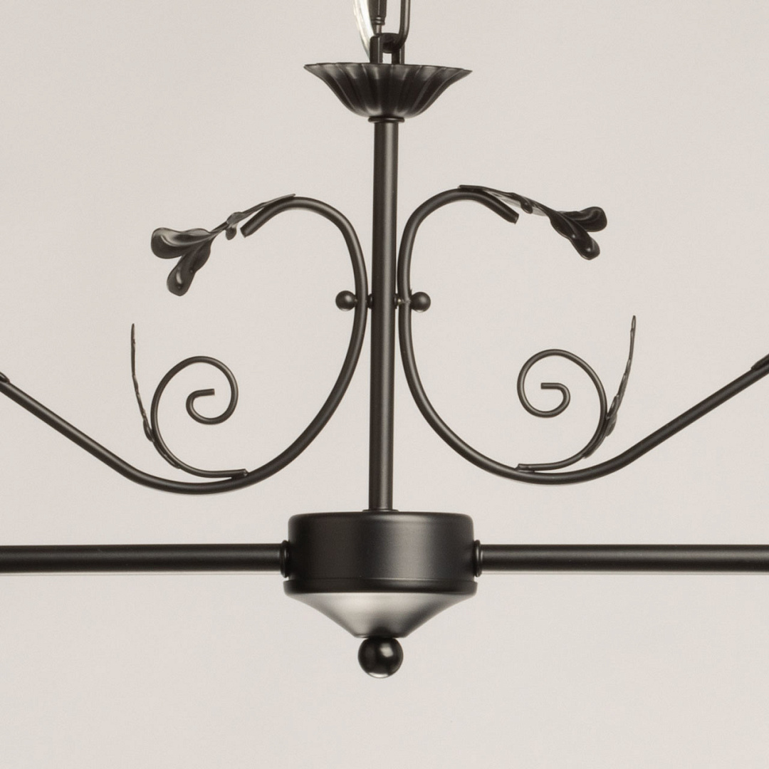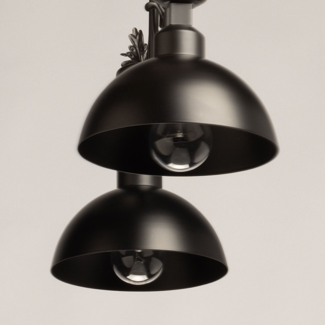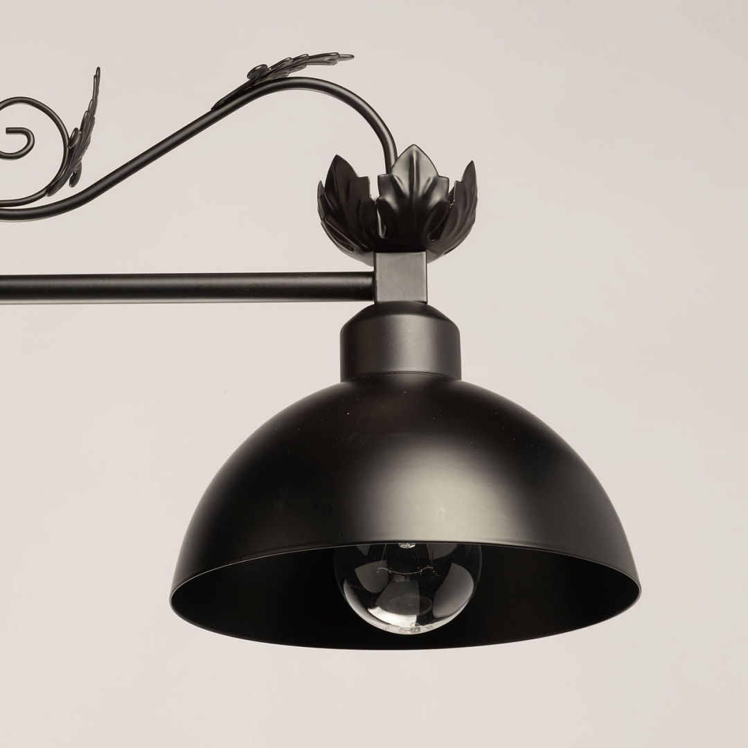 Металлический подвесной светильник идеально подойдет для освещения загородного дома в английском стиле или апартаментов в стиле лофт. Два плафона из  металла, окрашенного в черный цвет, закреплены на фигурном кованом основании. В качестве подвеса служит цепь, что позволяет регулировать высоту светильника. Люстра создаст романтическую атмосферу уютным вечером у камина, подойдет для оформления кабинета или библиотеки.