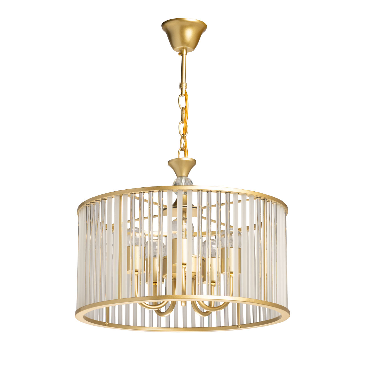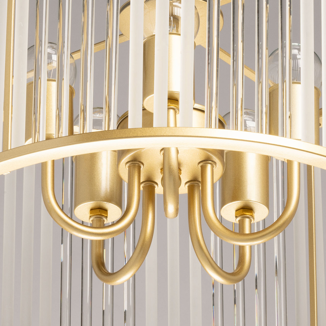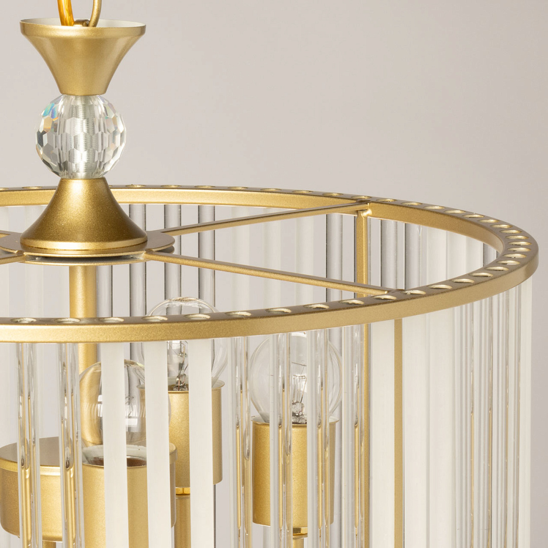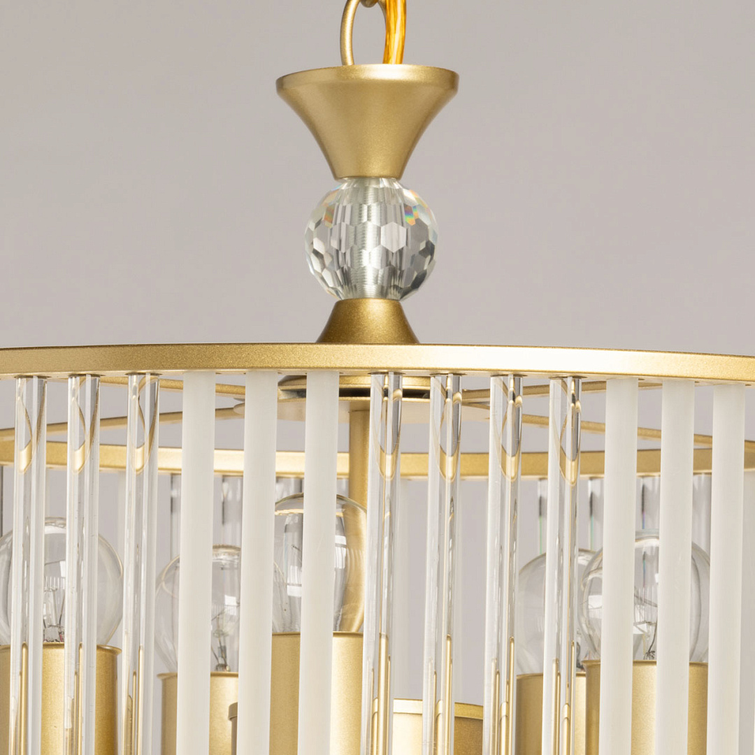 Гальваника в цвет латуни придаёт люстре благородный вид. Стеклянный декор создает уникальную игру света и тени и придает люстре шарм и уникальность. Люстра вносит в интерьер уют и романтичность. Заменяемые источники света удобны в эксплуатации. Возможность регулировать комфортную высоту.