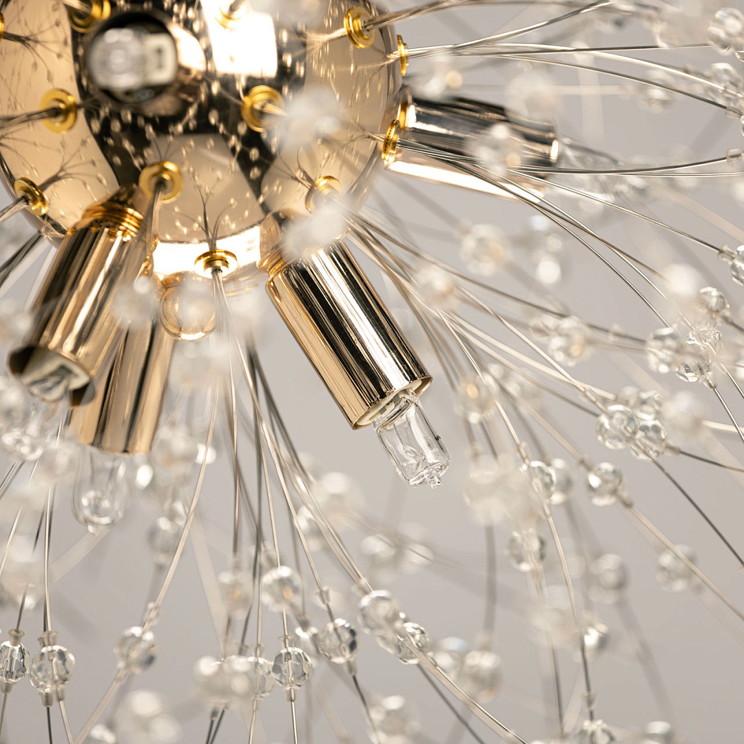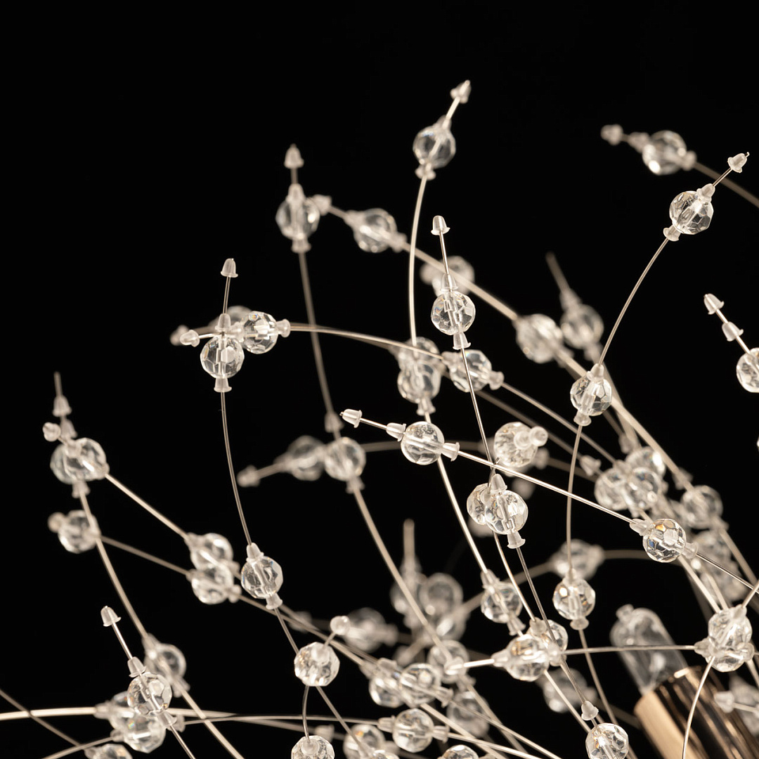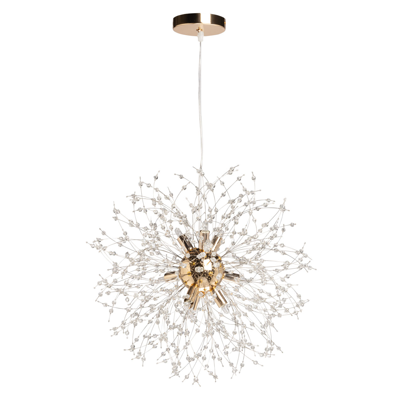 Оригинальный дизайн подвесной люстры привлекает к себе внимание. Цвет золота прекрасно сочетается с хрустальным декором. Бусины из прозрачного хрусталя, нанизанные на стальные нити, создают легкий и воздушный дизайн. Люстра станет прекрасным дополнением к любому интерьеру. Регулируемый подвес позволяет устанавливать комфортную высоту. Заменяемые источники света удобны в эксплуатации.