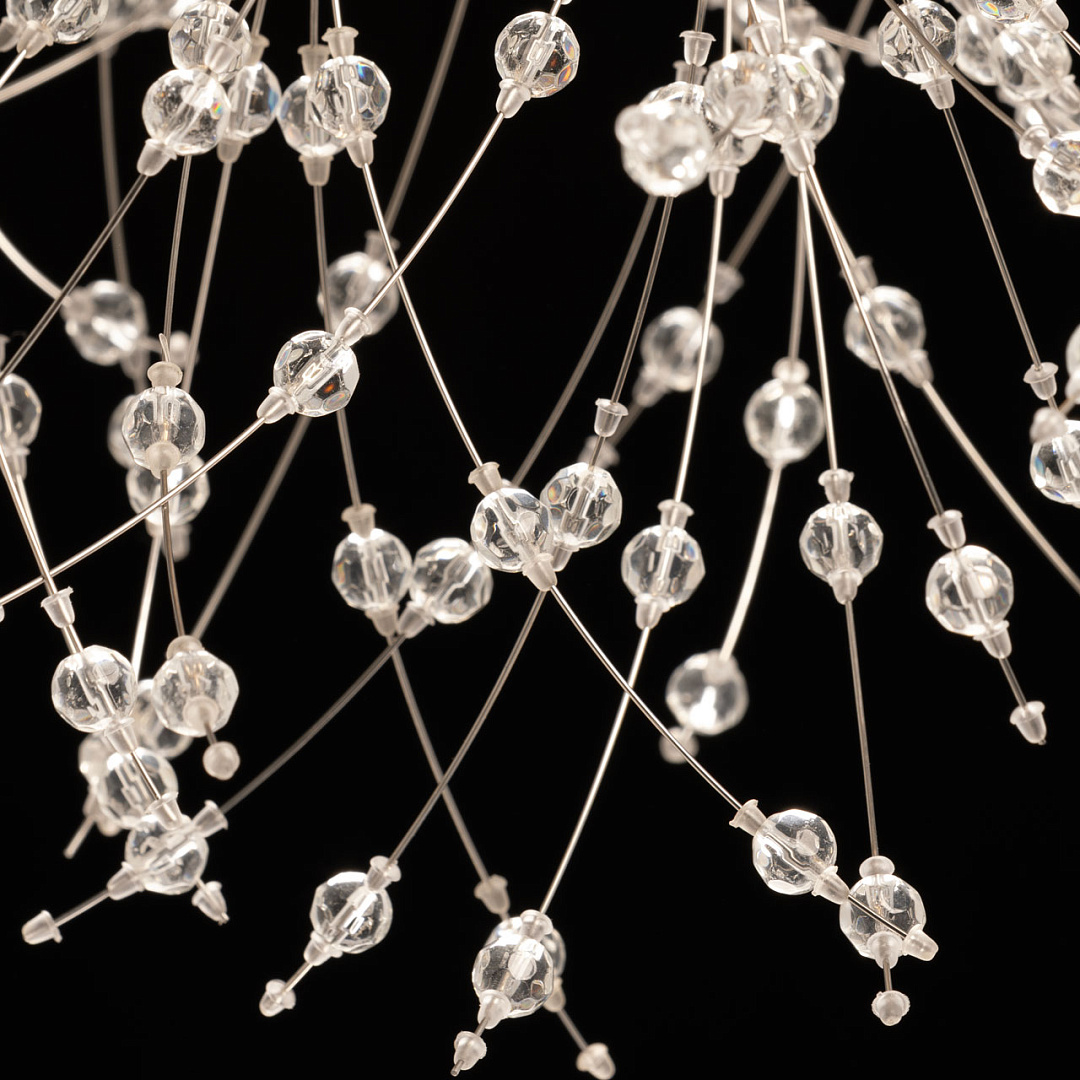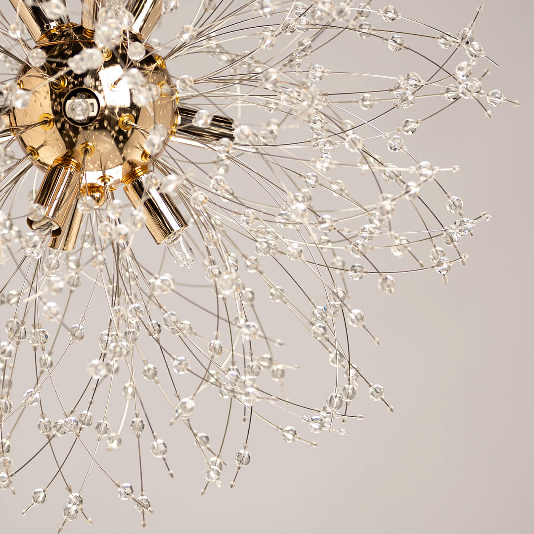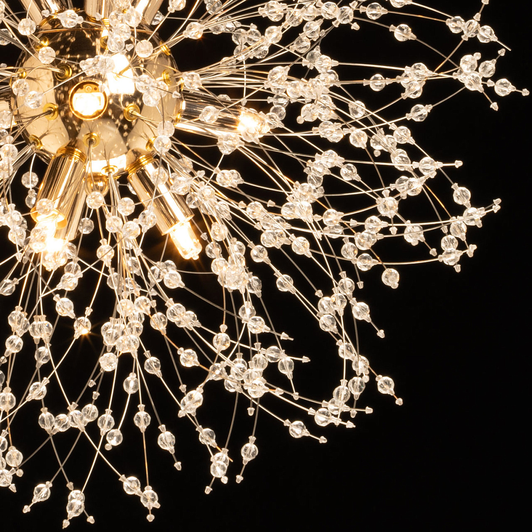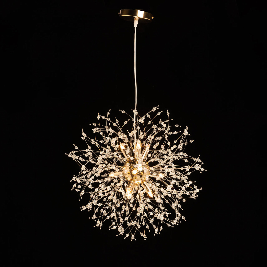 Оригинальный дизайн подвесной люстры привлекает к себе внимание. Цвет золота прекрасно сочетается с хрустальным декором. Бусины из прозрачного хрусталя, нанизанные на стальные нити, создают легкий и воздушный дизайн. Люстра станет прекрасным дополнением к любому интерьеру. Регулируемый подвес позволяет устанавливать комфортную высоту. Заменяемые источники света удобны в эксплуатации.