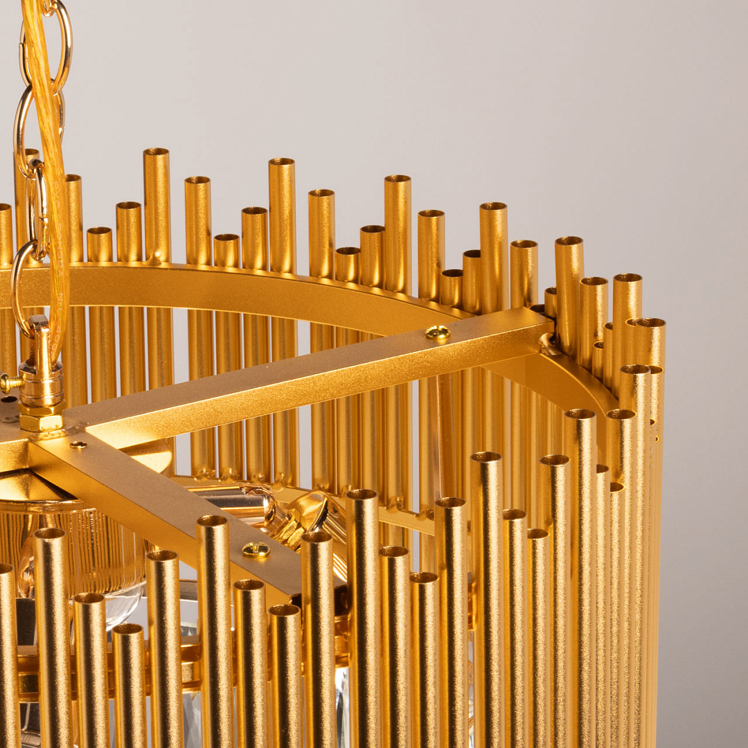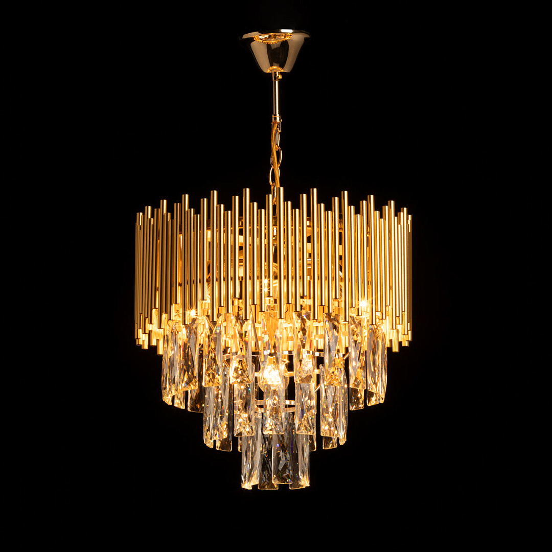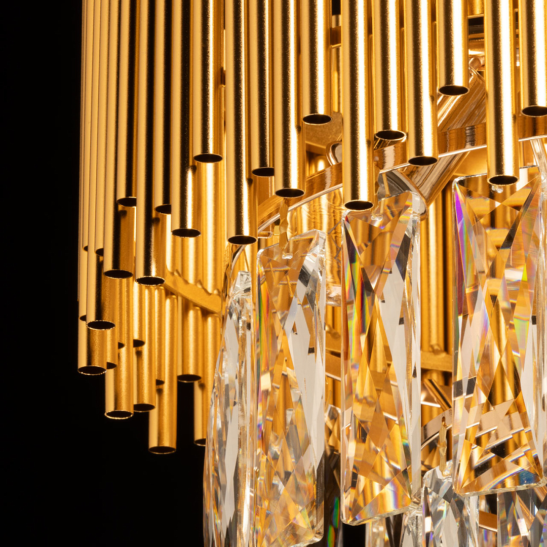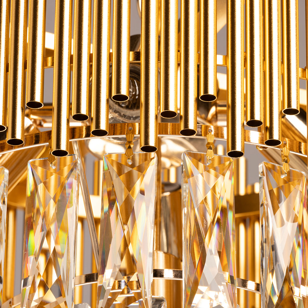 Цвет золота прекрасно сочетается с современными элементами дизайна, создавая гармоничный образ. Хрусталь позволяет создать неповторимый блеск и игру света. Эта люстра станет прекрасным дополнением к любому интерьеру, придавая ему шарм. Ее элегантный дизайн и качественные материалы обеспечивают долговечность и надежность. Благодаря сочетанию гальванизированного металла, хрусталя и золотистых акцентов, она привнесет в интерьер неповторимый стиль и атмосферу уюта. Возможность регулировать комфортную высоту. Заменяемые источники света удобны в эксплуатации.