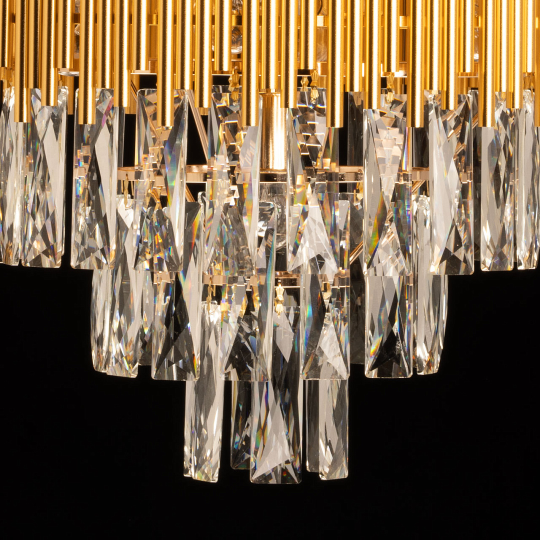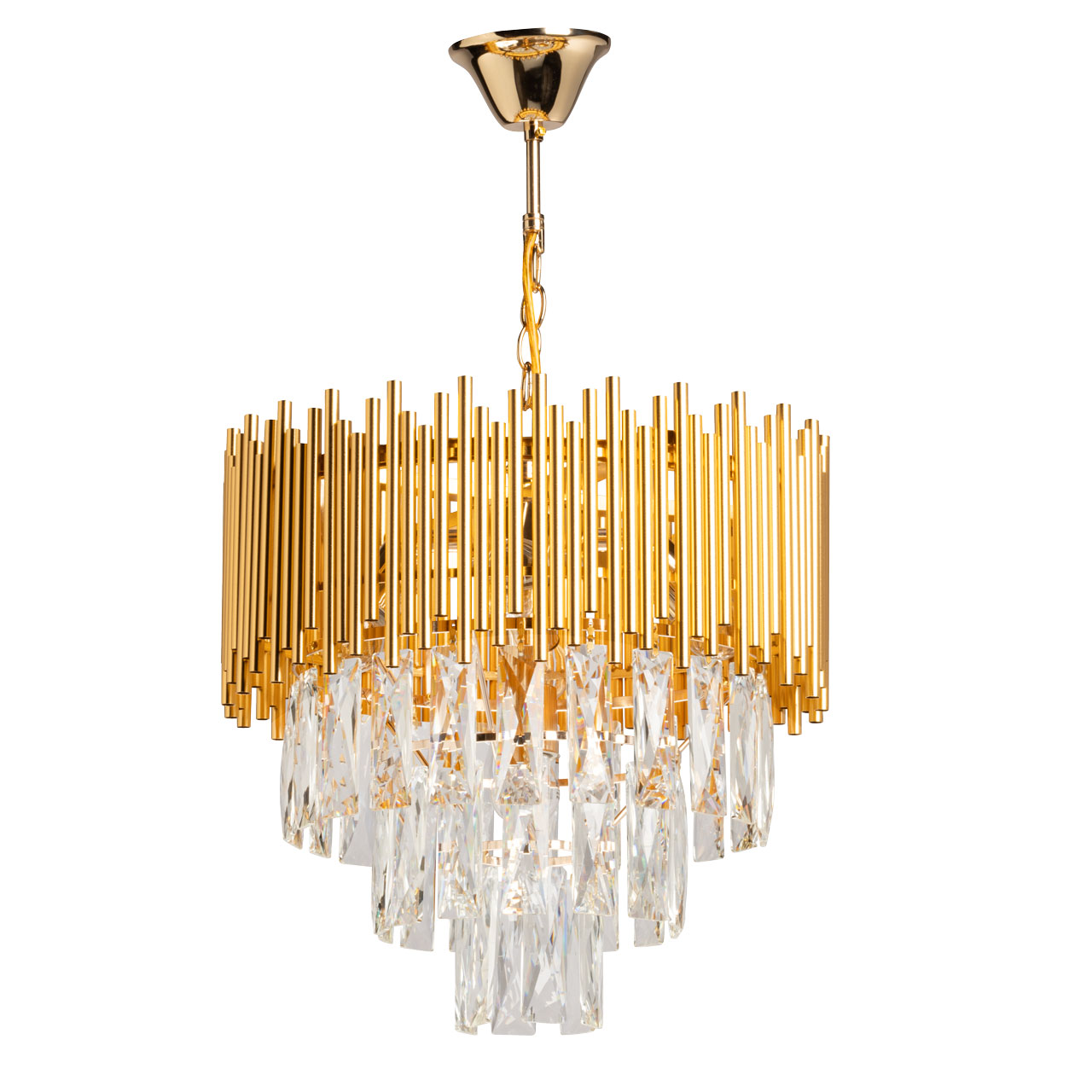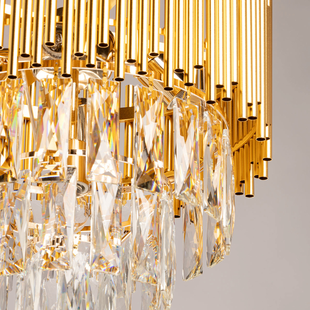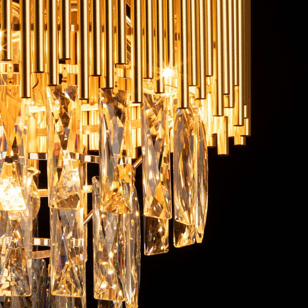 Цвет золота прекрасно сочетается с современными элементами дизайна, создавая гармоничный образ. Хрусталь позволяет создать неповторимый блеск и игру света. Эта люстра станет прекрасным дополнением к любому интерьеру, придавая ему шарм. Ее элегантный дизайн и качественные материалы обеспечивают долговечность и надежность. Благодаря сочетанию гальванизированного металла, хрусталя и золотистых акцентов, она привнесет в интерьер неповторимый стиль и атмосферу уюта. Возможность регулировать комфортную высоту. Заменяемые источники света удобны в эксплуатации.