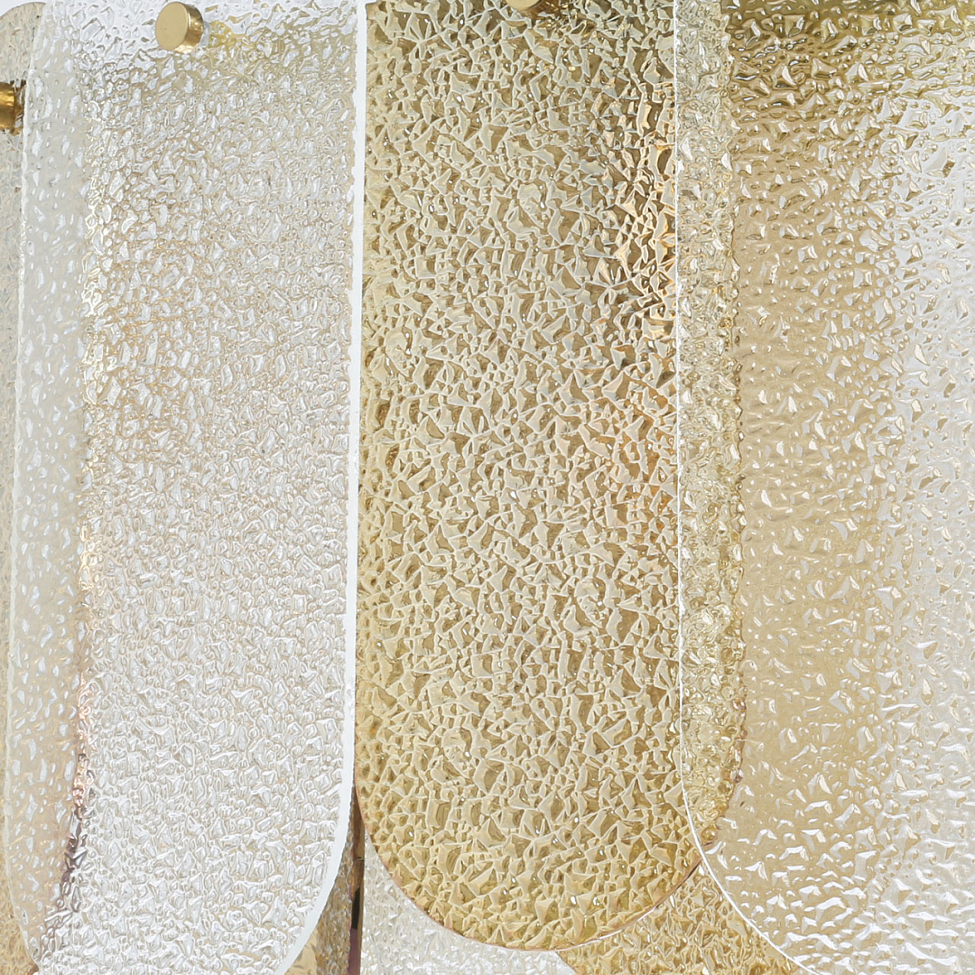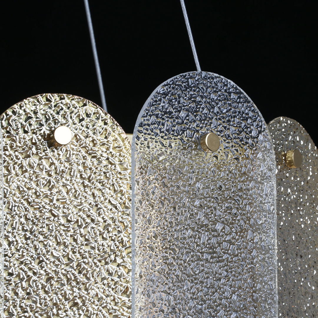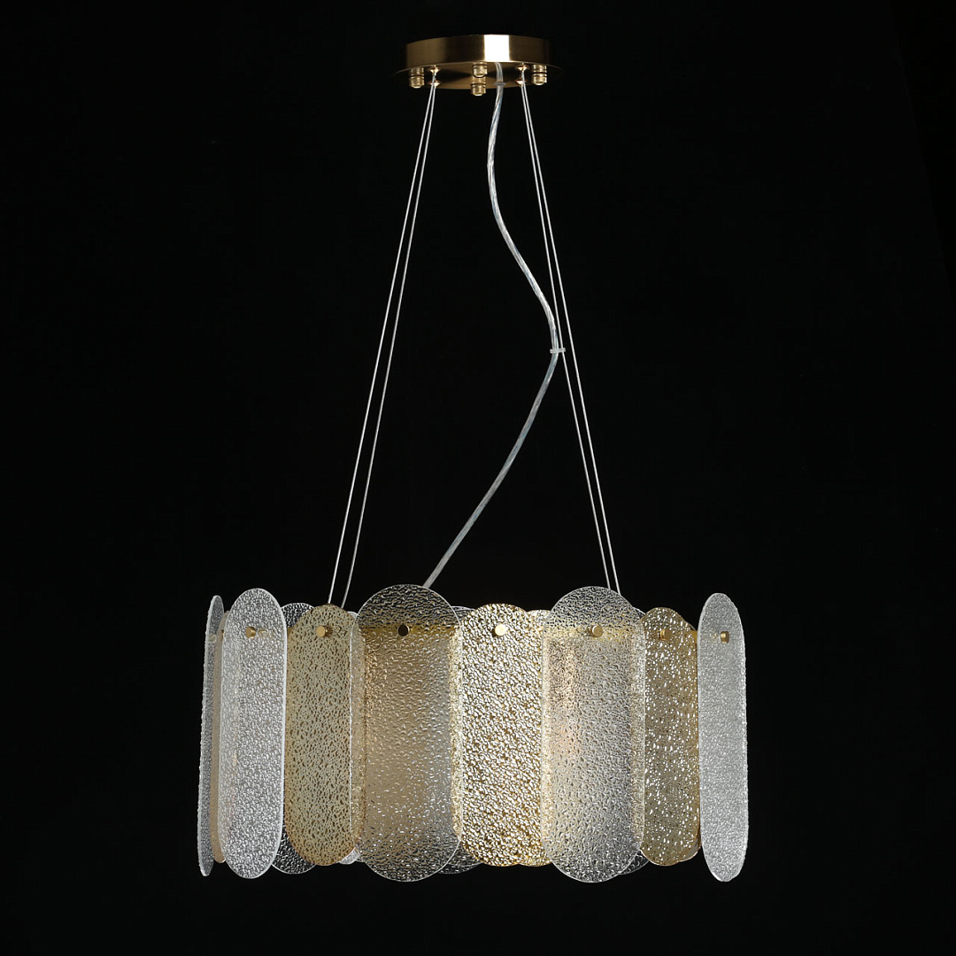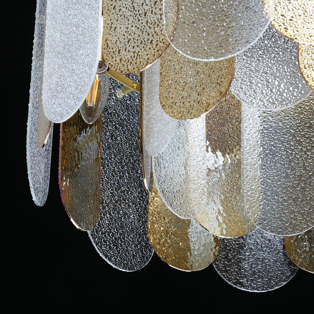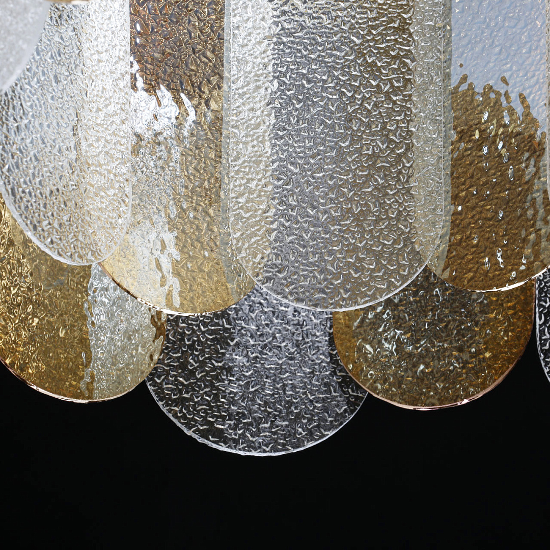 Подвесной светильник в современном дизайне хорошо подойдет в гостиную и спальню.Модный цвет бронзы сохраняет свою актуальность.Декор из фактурных стеклянных пластин обеспечивает комфортное освещение.Сочетание прозрачного стекла и стекла цвета шампань создает красивый свет.Подвесы в виде тросов позволяют устанавливать комфортную высоту. Заменяемые источники света удобны в эксплуатации.