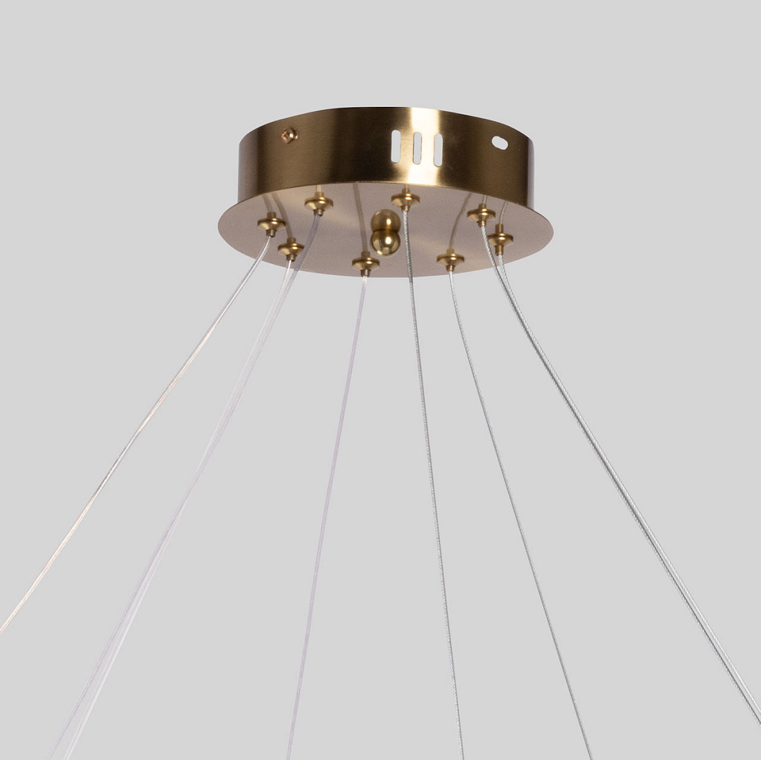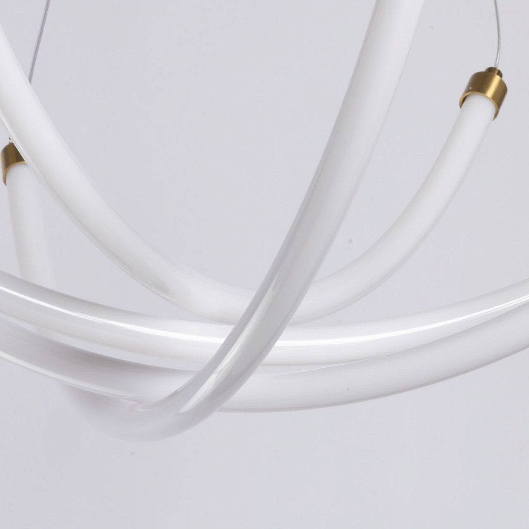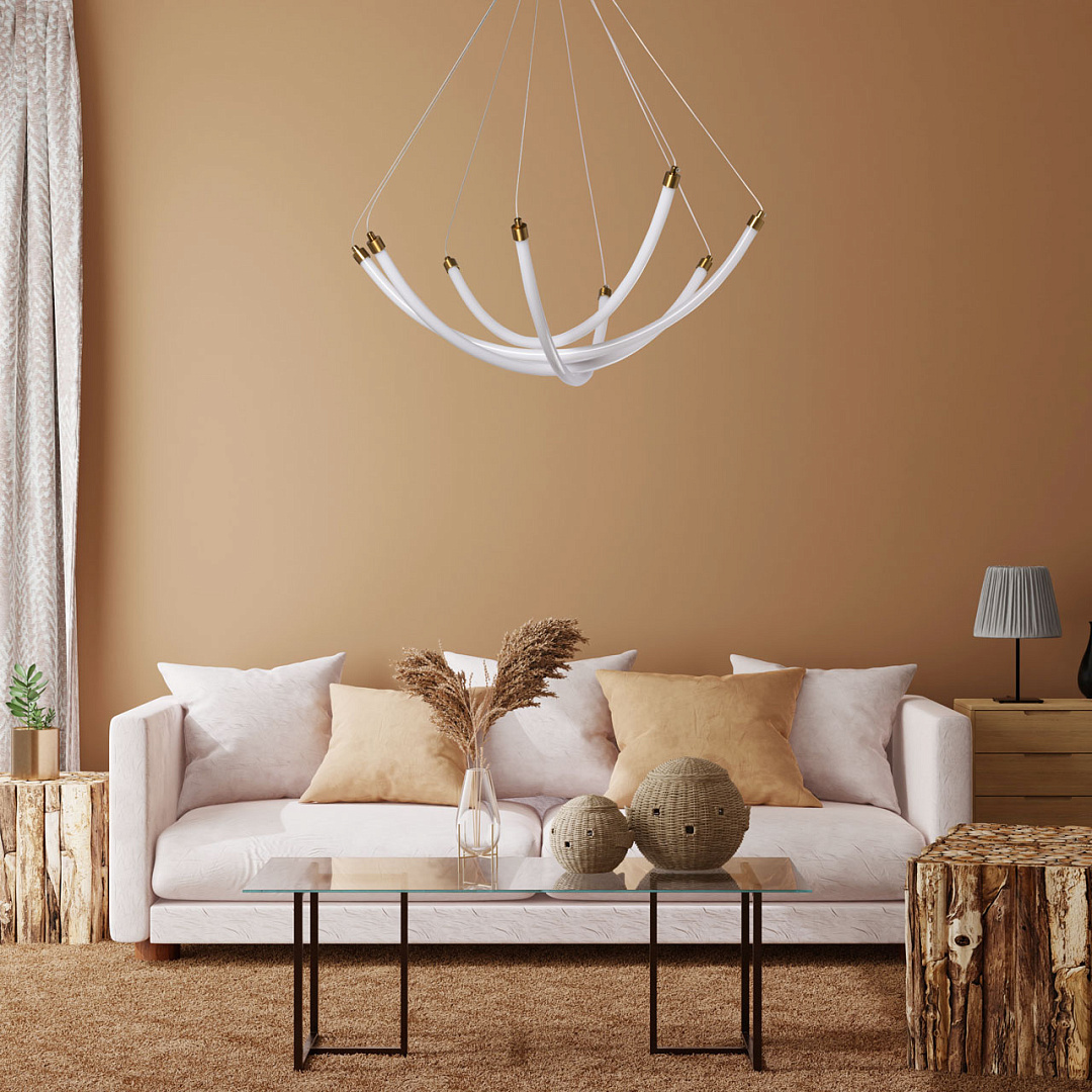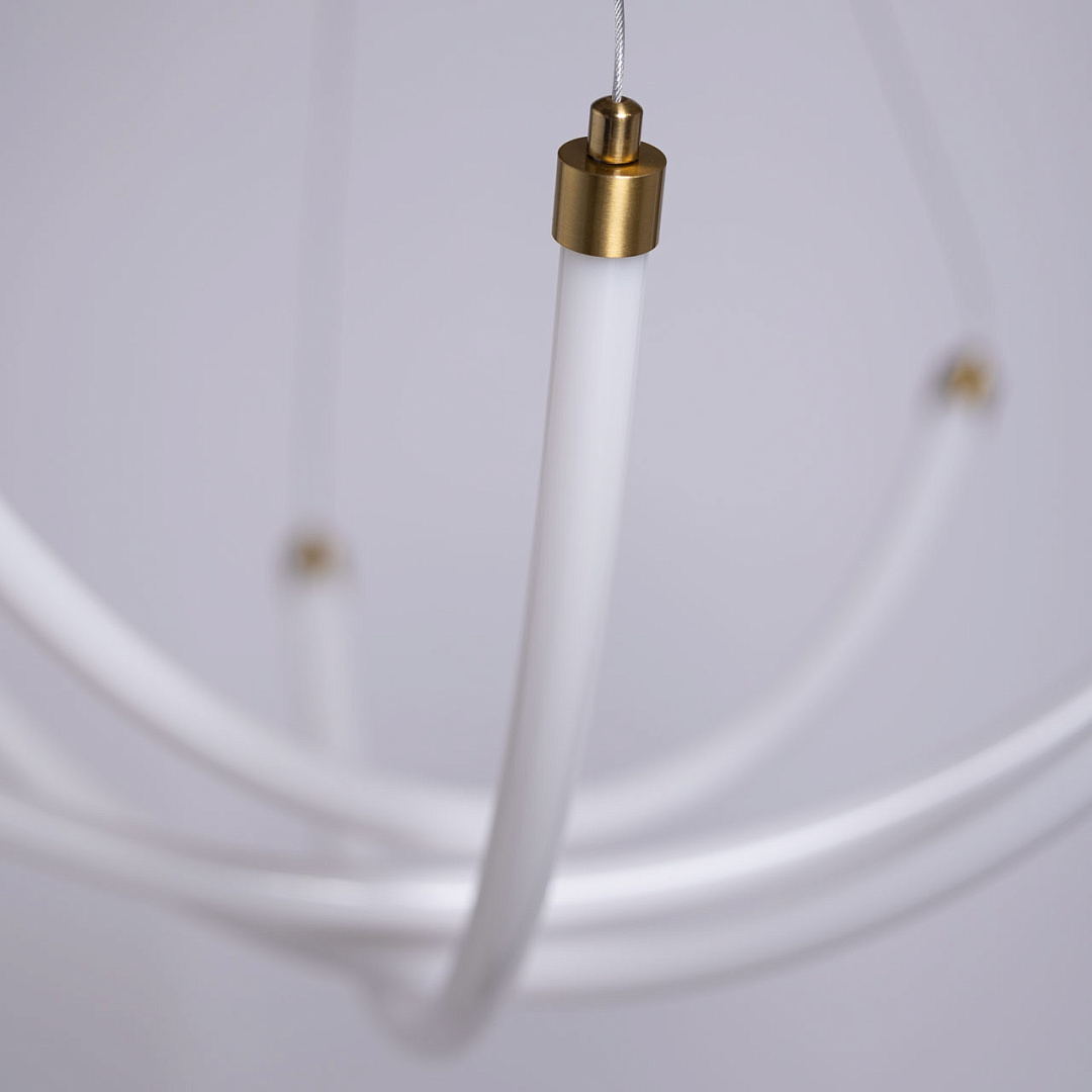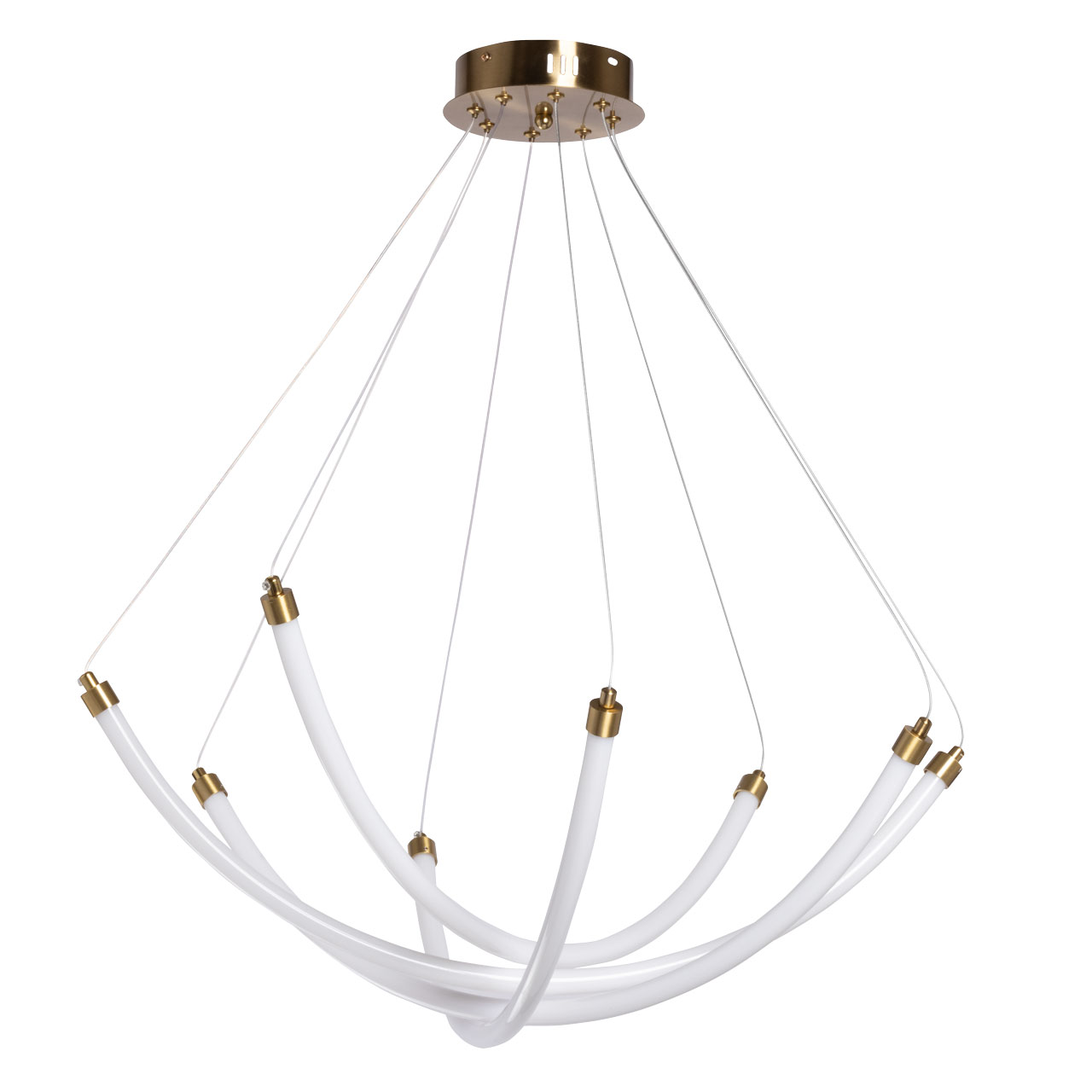 Золотой цвет основания придает подвесной люстре элегантность. Необычное сочетание плавно изогнутых  плафонов делает подвесную люстру не только источником света, но и ярким акцентом. Матовый акрил плафонов создает комфортное освещение. Возможность регулировать комфортную высоту. Светодиодные источники света экономичны и безопасны.