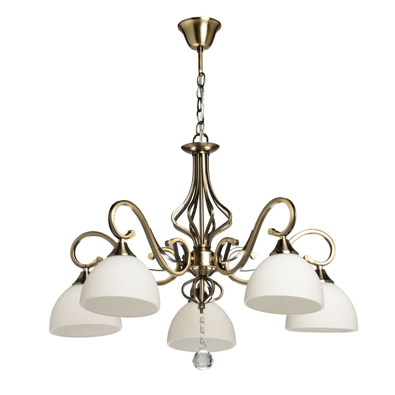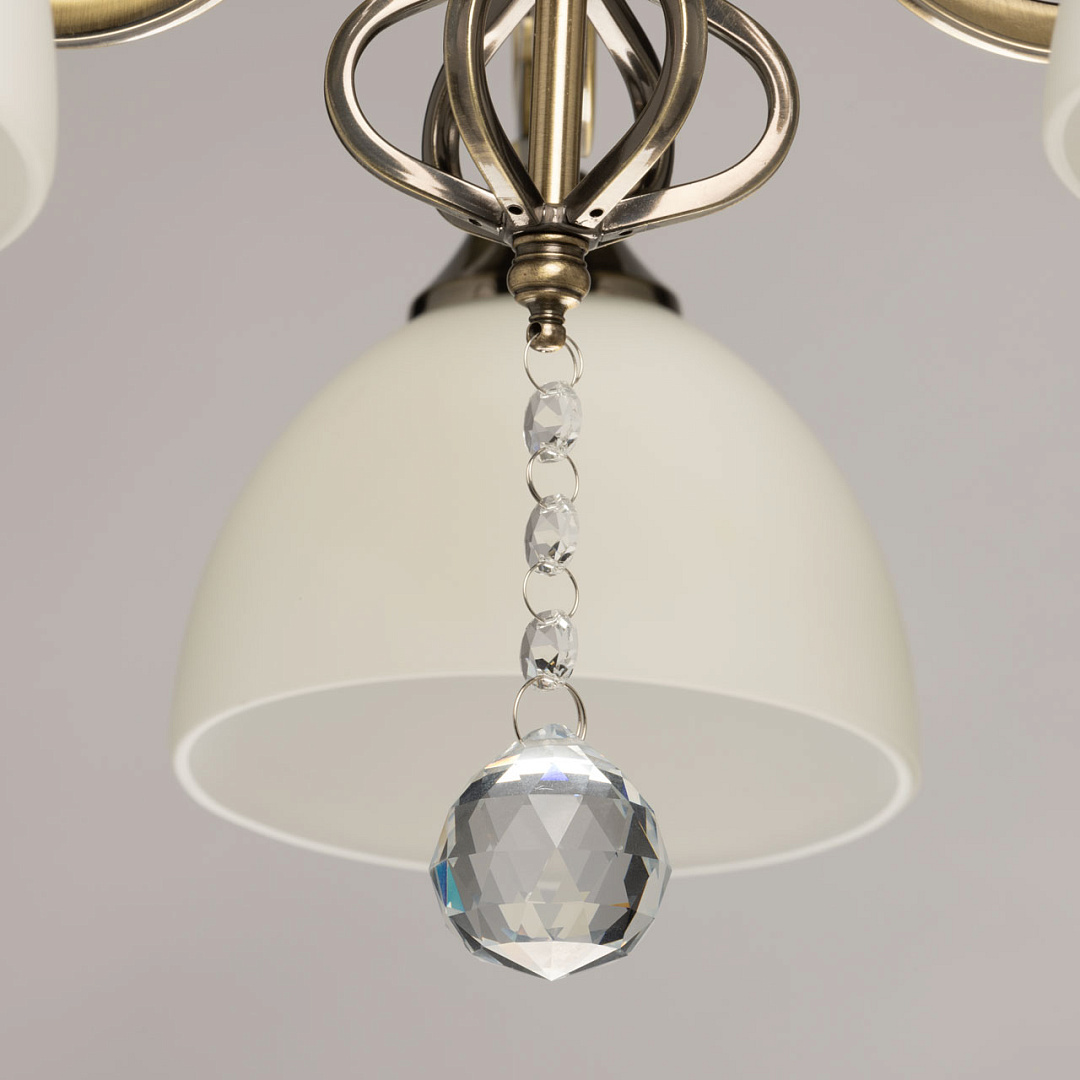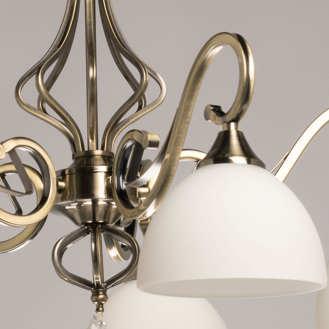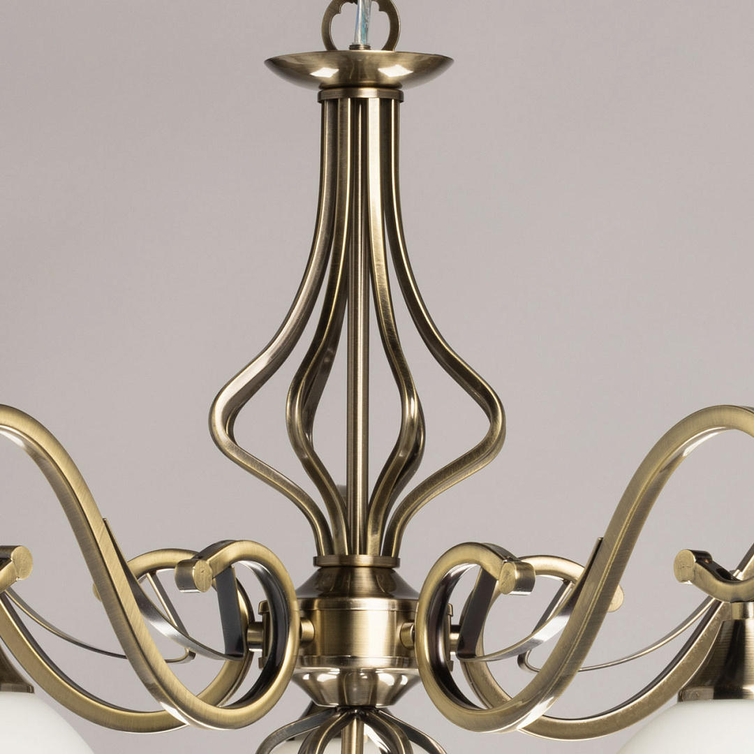 Стиль неоклассики в сочетании с цветом античной бронзы придают люстре дополнительного шарма и элегантности. Белые плафоны, направленные вниз создают мягкое зональное освещение. Заменяемые источники света удобны в эксплуатации. Возможность регулировать комфортную высоту.