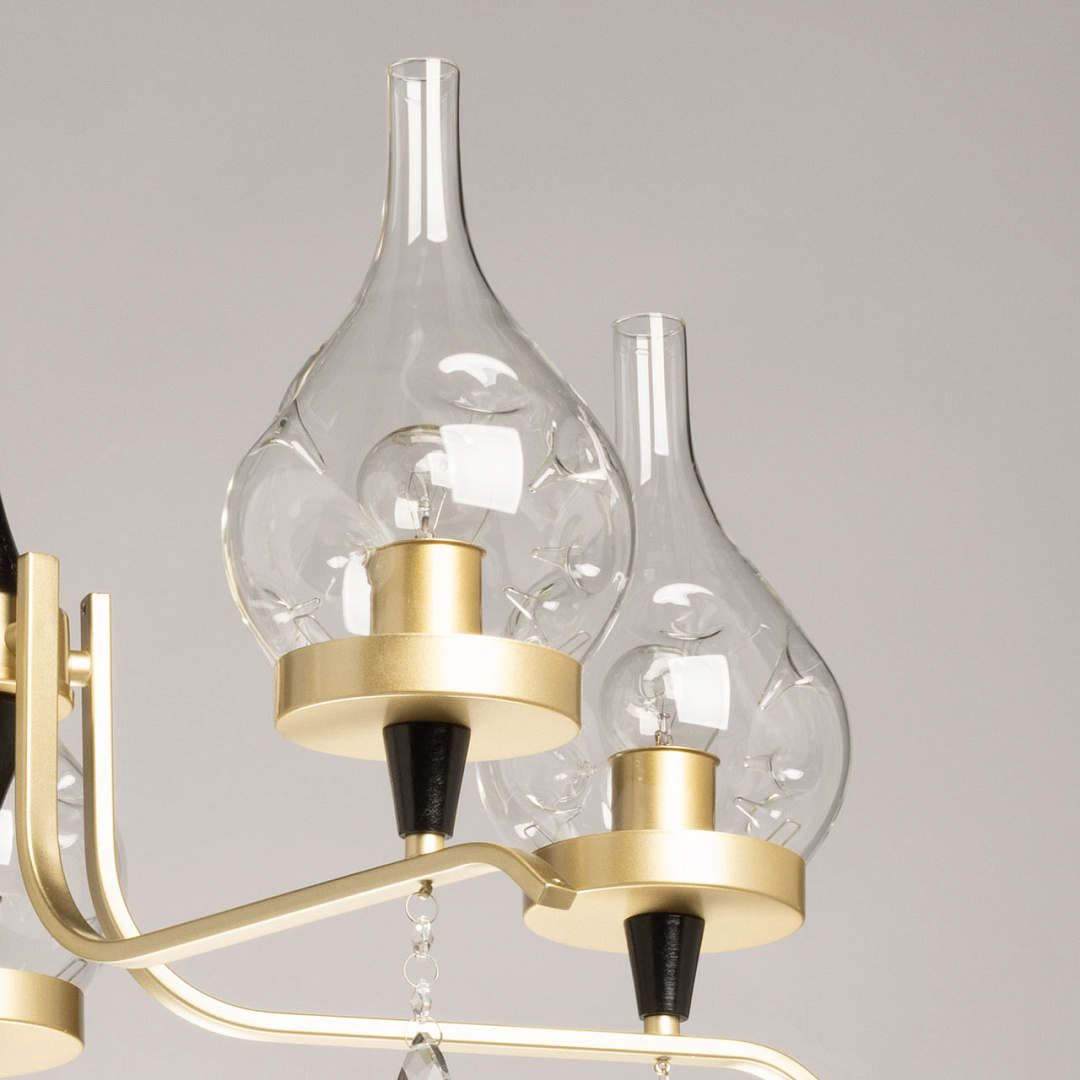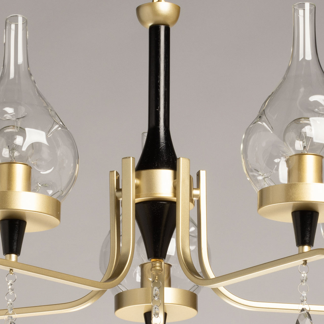 Эффектный подвесной светильник подойдет как в классический, так и в современный интерьер. Высоту светильника можно комфортно регулировать. Сочетание черного и золотого цвета основания привлекает к себе внимание. Стеклянные плафоны оригинальной формы придают люстре индивидуальность. Заменяемые источники света удобны в эксплуатации.