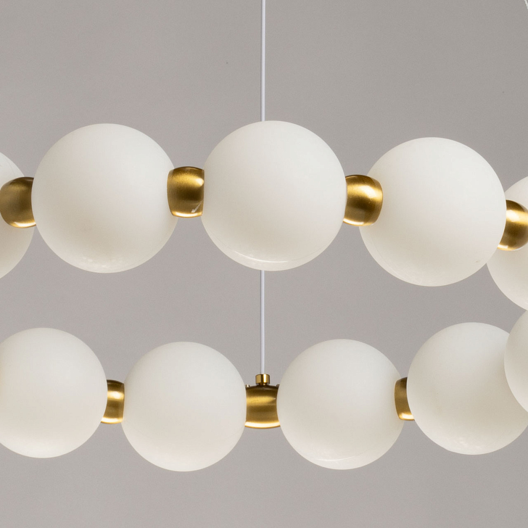 Латунное покрытие придает основанию люстры теплый и элегантный вид, который хорошо сочетается с различными стилями интерьера. Матово-белые акриловые плафоны создают мягкое и равномерное освещение, что делает атмосферу в помещении более уютной и комфортной для глаз.Многорежимность с изменением цветовой температуры от 3000К до 6000К является элементом светодизайна и позволяет подобрать комфортную температуру света с помощью настенного выключателя. Качественные светодиоды и корпус из сплава алюминия  обеспечивают яркое освещение и долгий срок службы. Светодиодные источники света экономичны и безопасны.Возможность устанавливать комфортную высоту.