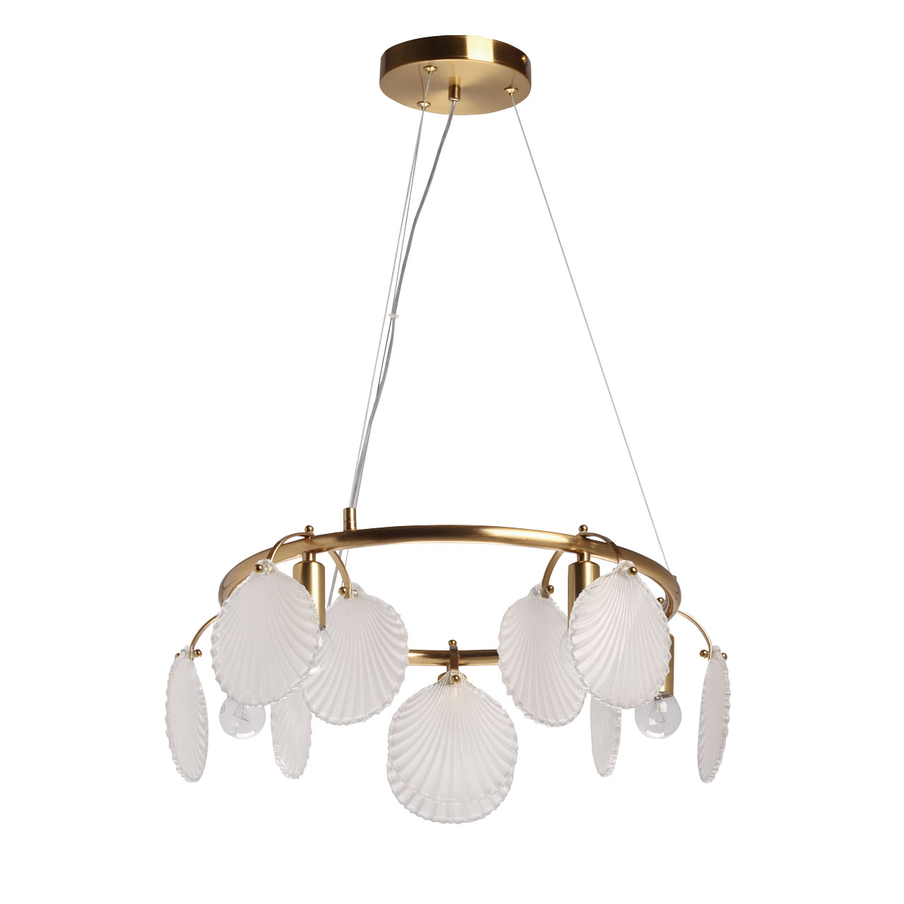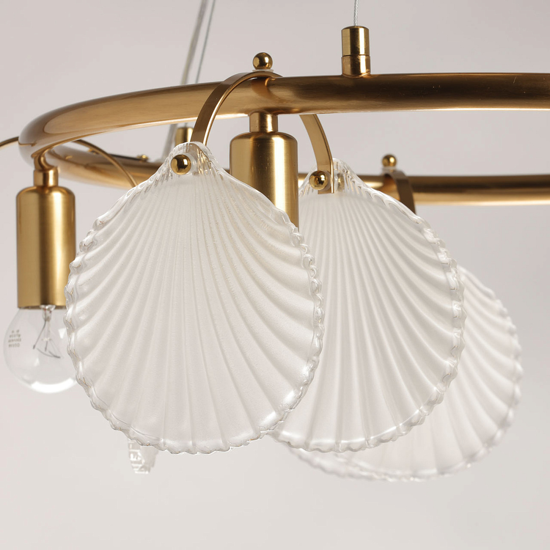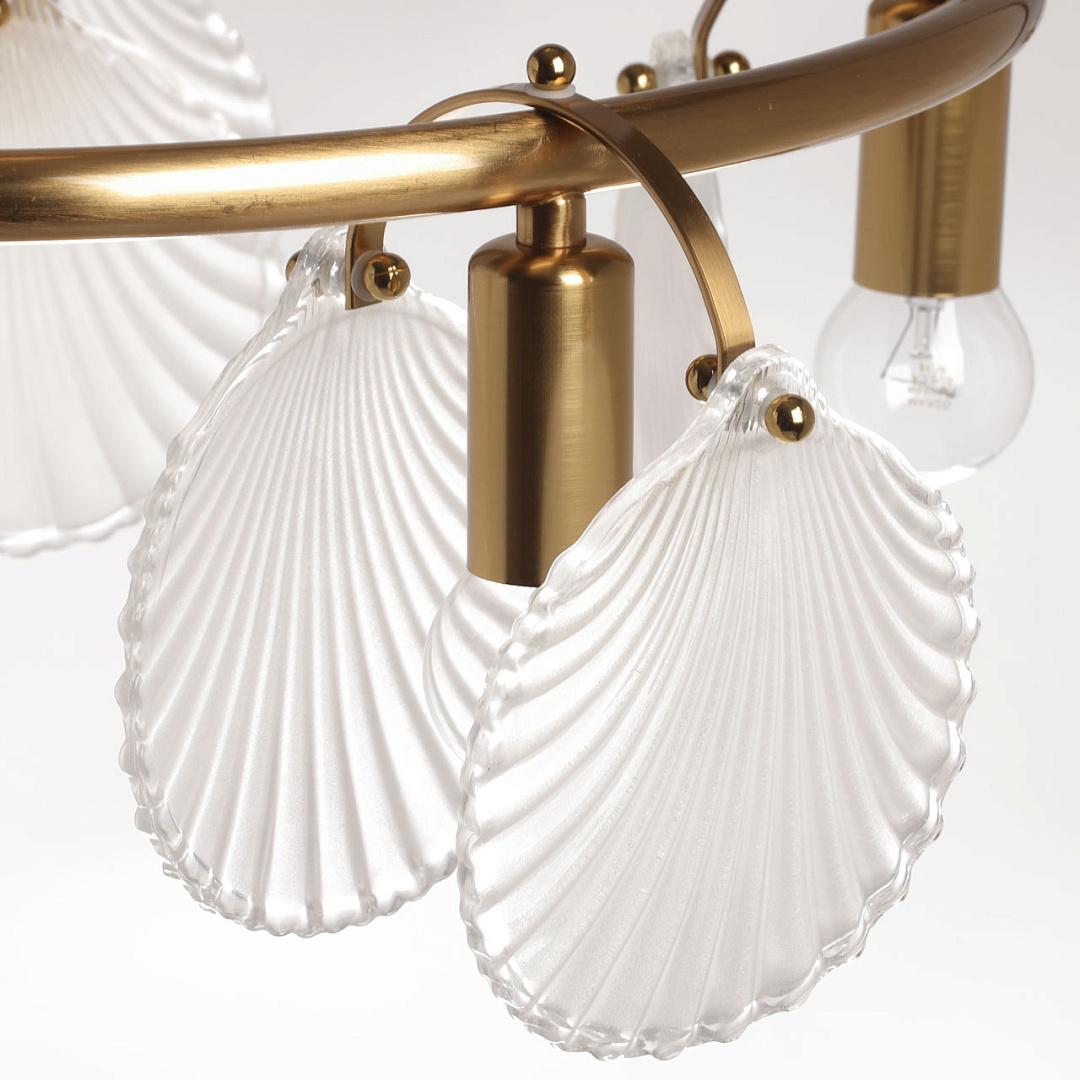 Актуальный цвет латуни. Оригинальные декоративные элементы из стекла в форме ракушки соответствуют тренду природности. Минималистичный дизайн гармонично сочетается с природными мотивами. Заменяемые источники света удобны в эксплуатации. Возможность регулировать комфортную высоту.