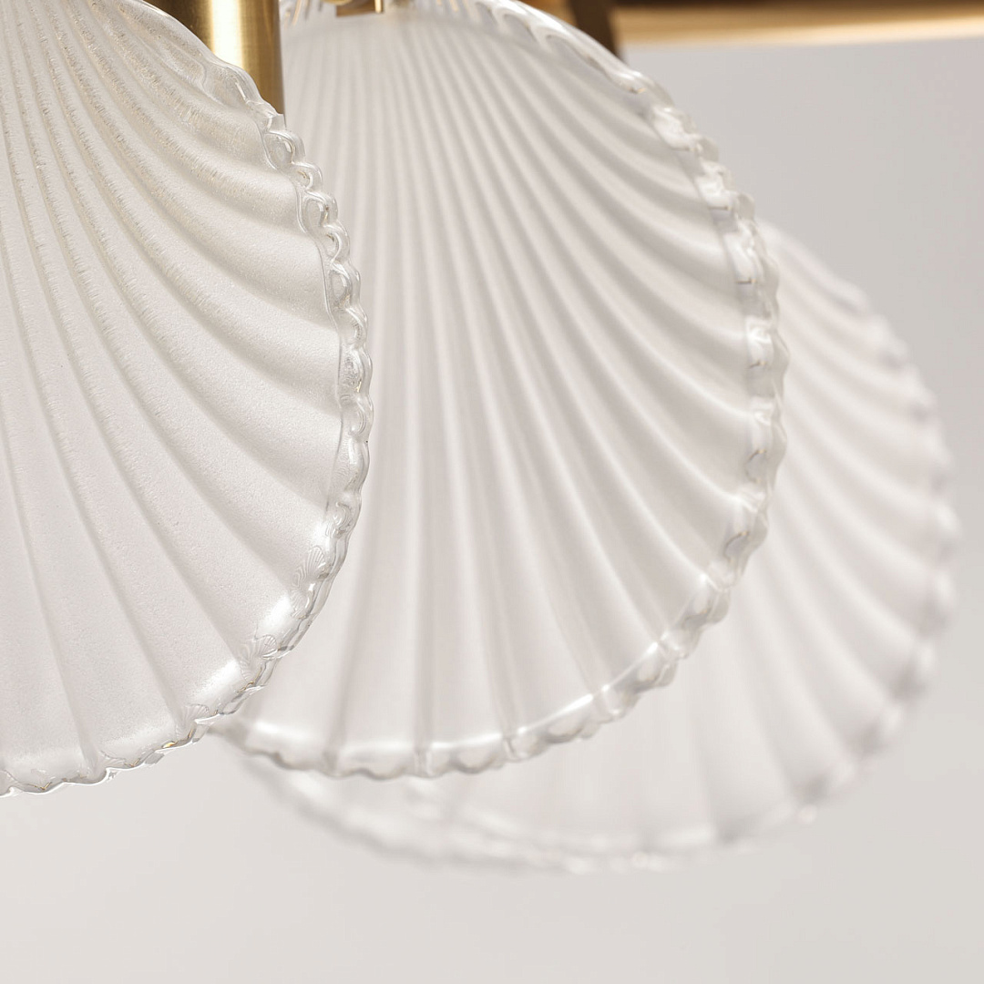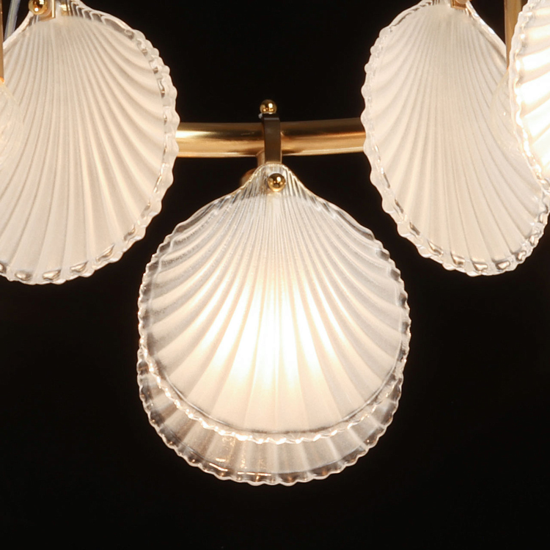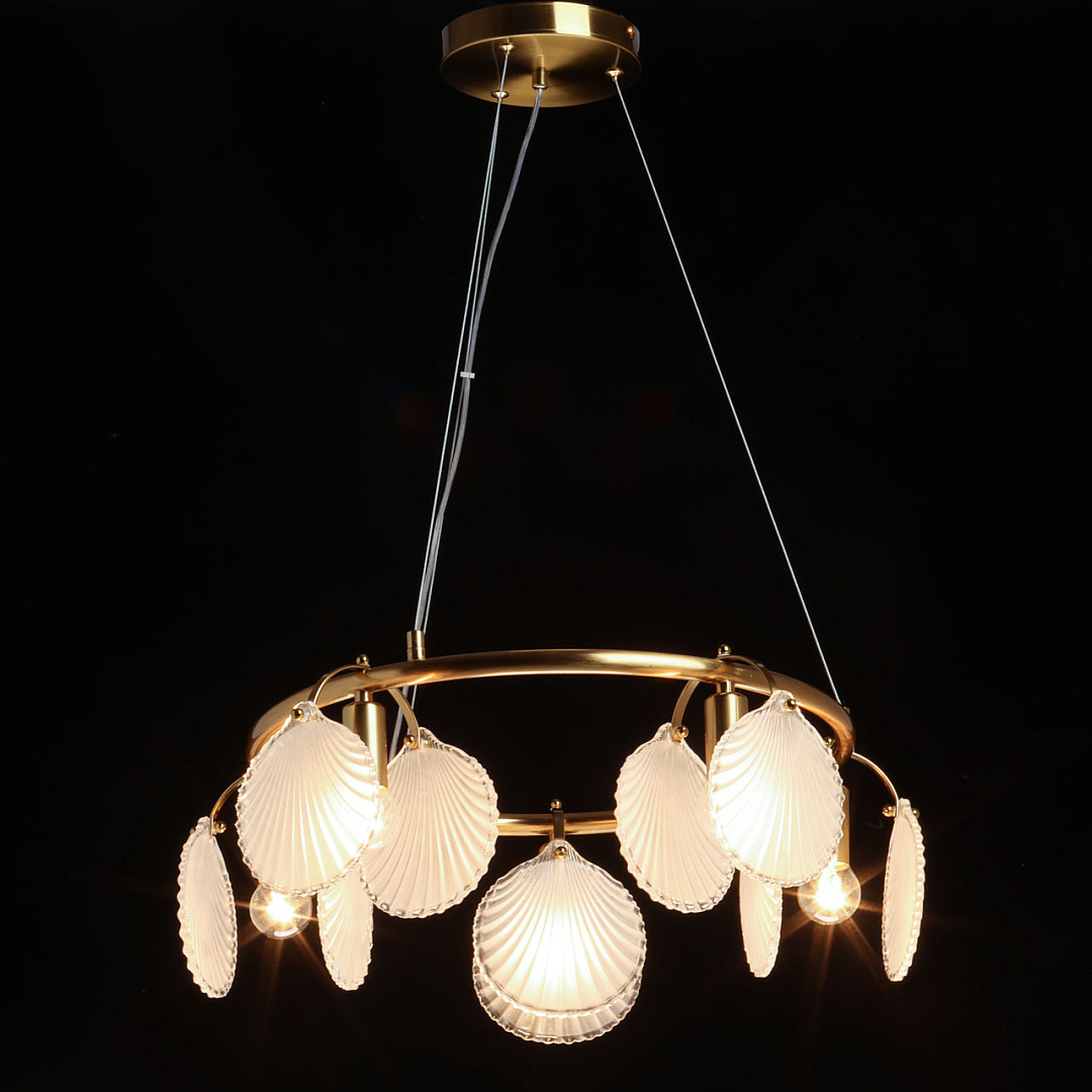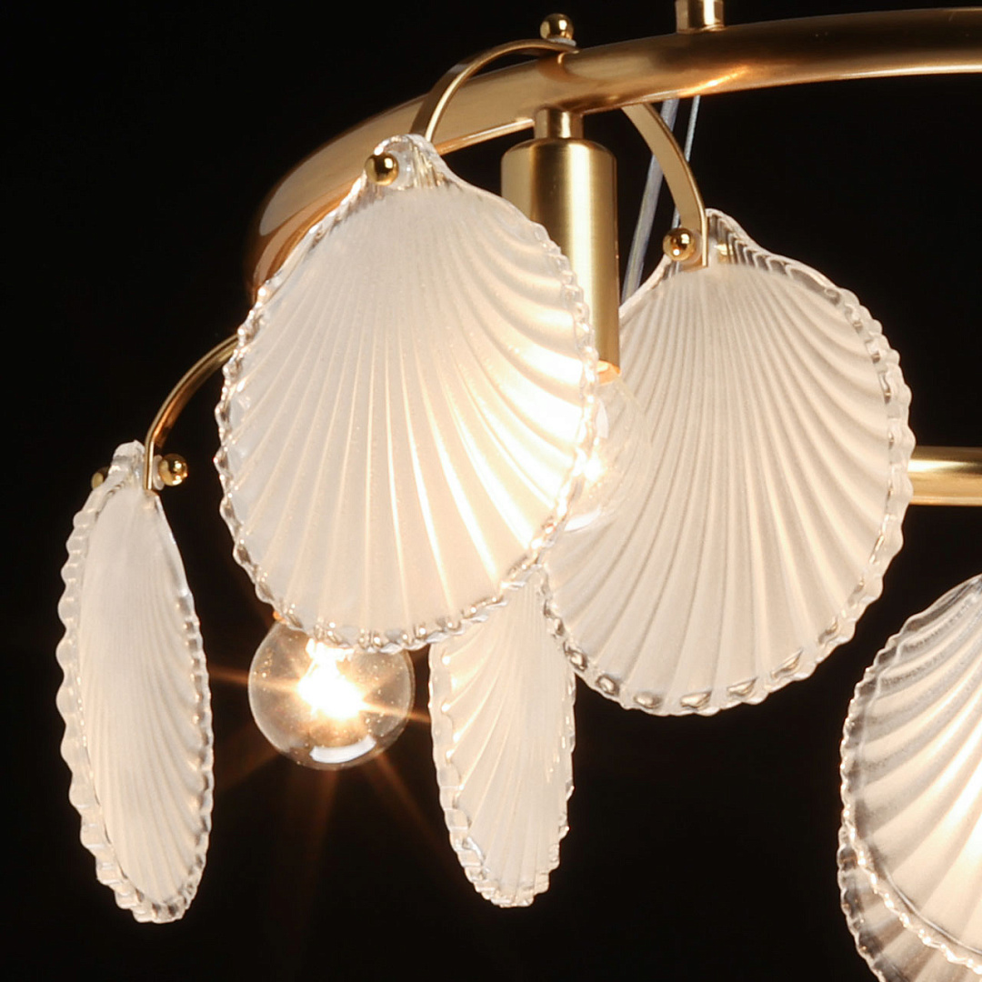 Актуальный цвет латуни. Оригинальные декоративные элементы из стекла в форме ракушки соответствуют тренду природности. Минималистичный дизайн гармонично сочетается с природными мотивами. Заменяемые источники света удобны в эксплуатации. Возможность регулировать комфортную высоту.
