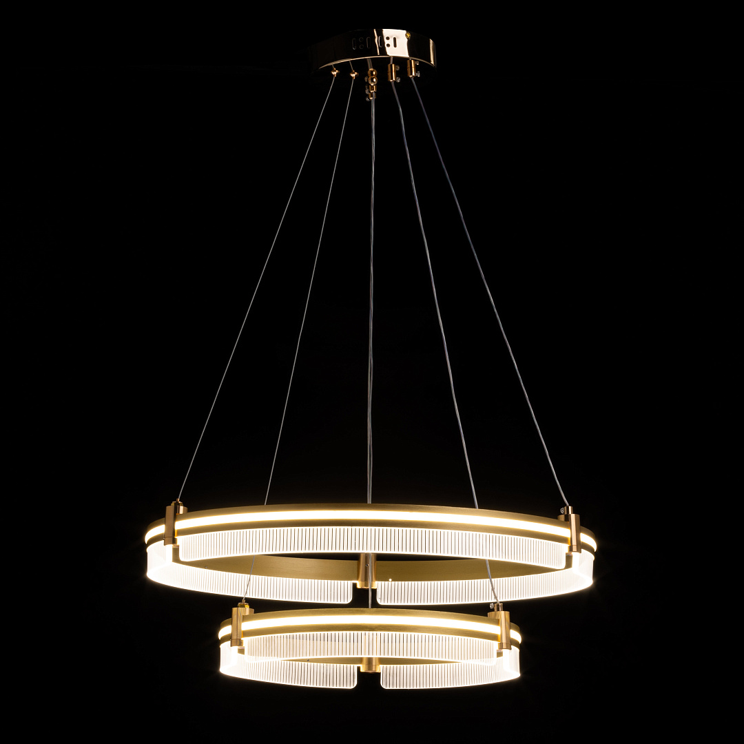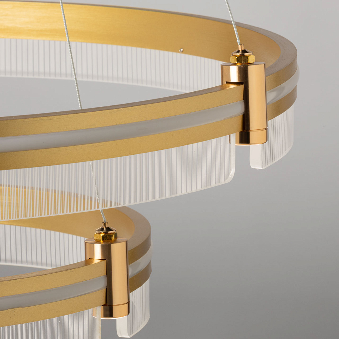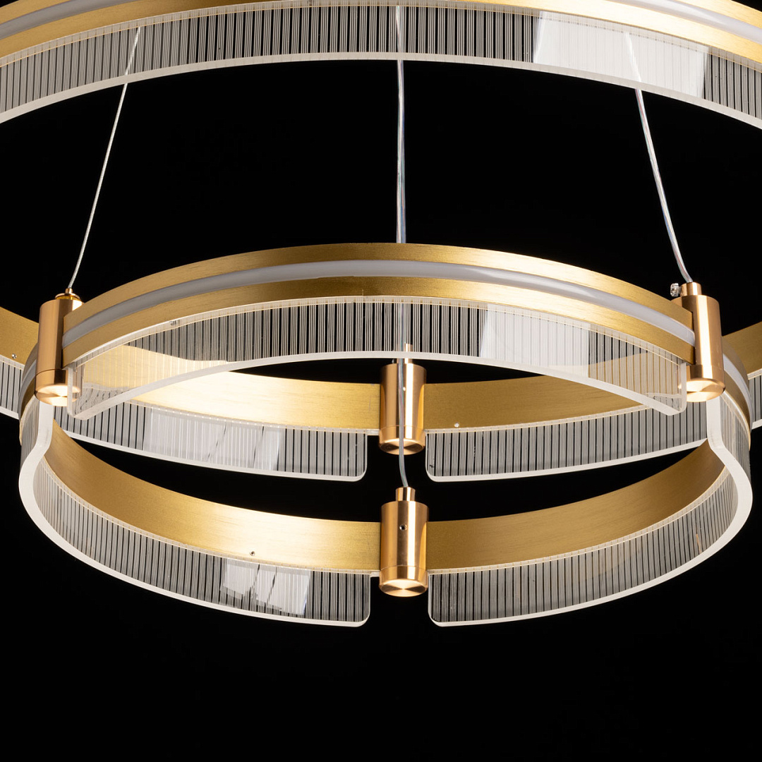 Акцентный плафон придает люстре уникальность, повышая ее привлекательность. Сочетание фактур глянцевого и матового золота придает люстре элегантности и стильности. Декор из современного высокотехнологичного акрила эффектно преломляет свет, создавая игру бликов. Сочетание качественных материалов, оригинального дизайна и многофункциональности делает люстру превосходным выбором для, тех кто ценит стиль и эстетику в интерьере. Многорежимность освещения от 3000К до 6500К позволяет подобрать комфортную температуру света. Диммирование поможет выбрать необходимую интенсивность светового потока, а ПДУ обеспечит удобную эксплуатацию люстры. Светодиодные источники света экономичны и безопасны. Возможность устанавливать комфортную высоту.