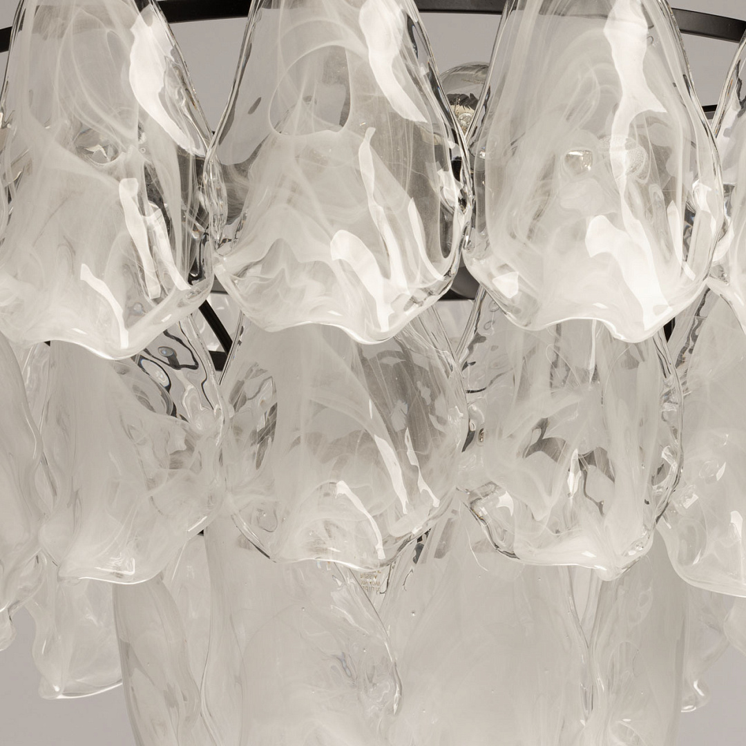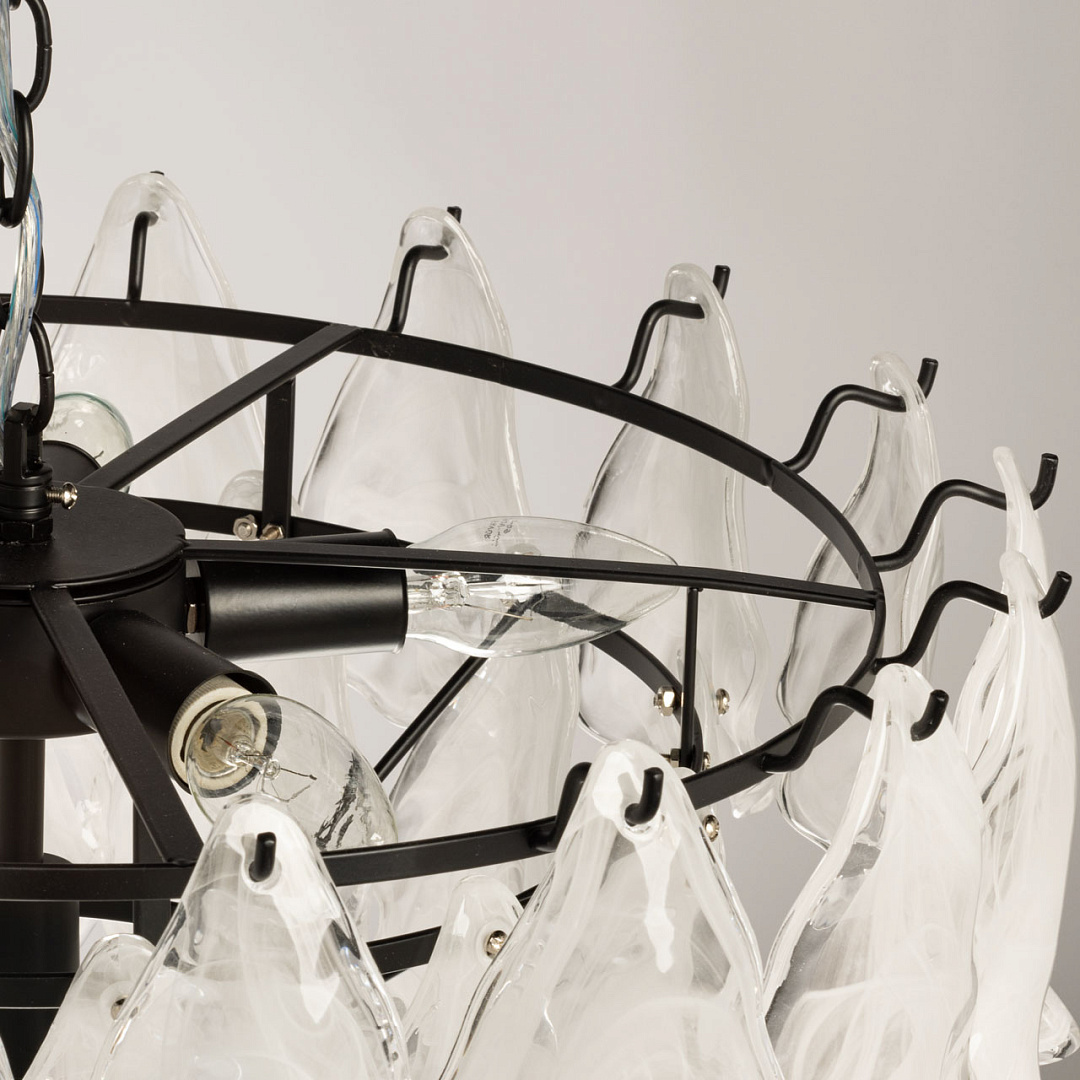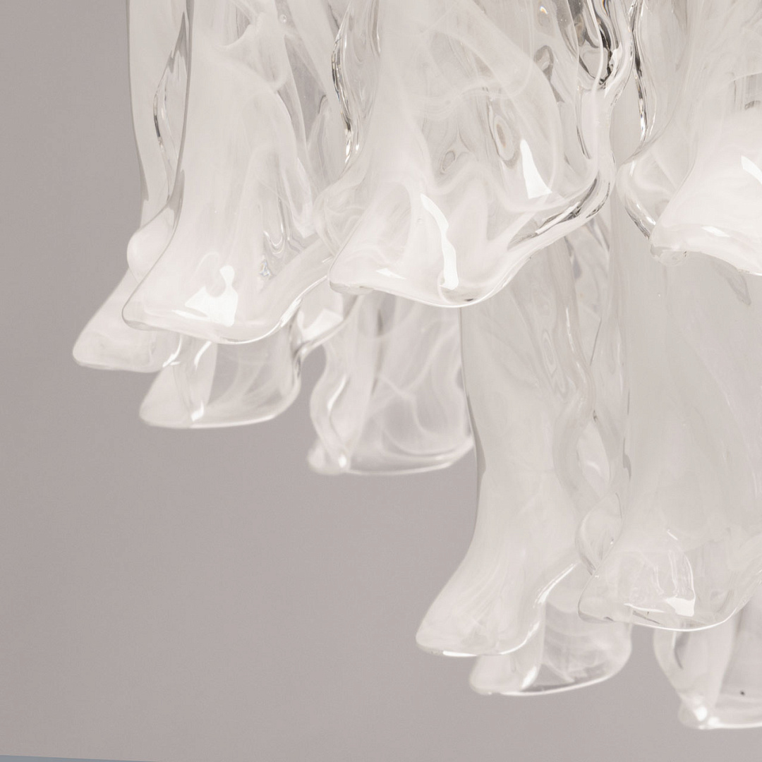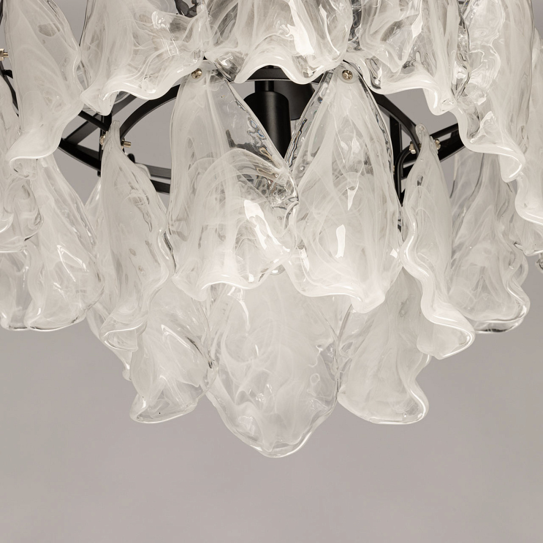 Сочетание материалов, форм и оттенков создает впечатляющий визуальный эффект и привлекает внимание к светильнику. Стеклянный декор в форме лепестков добавляет природной красоты. Заменяемые источники света удобны в эксплуатации.  Возможность регулировки высоты светильника позволяет создать комфортные условия освещения.