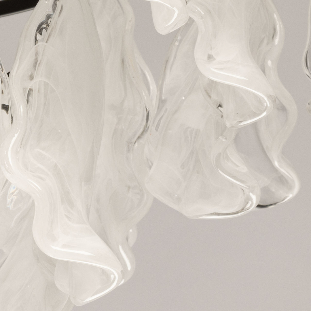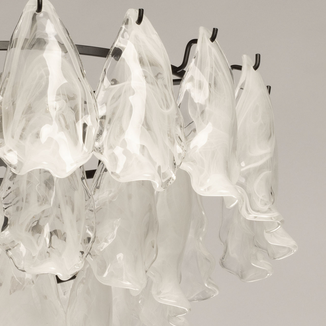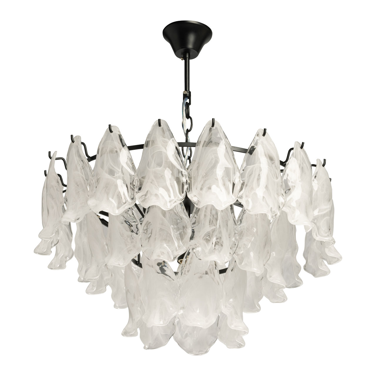 Сочетание материалов, форм и оттенков создает впечатляющий визуальный эффект и привлекает внимание к светильнику. Стеклянный декор в форме лепестков добавляет природной красоты. Заменяемые источники света удобны в эксплуатации.  Возможность регулировки высоты светильника позволяет создать комфортные условия освещения.