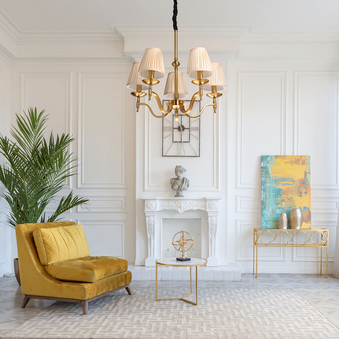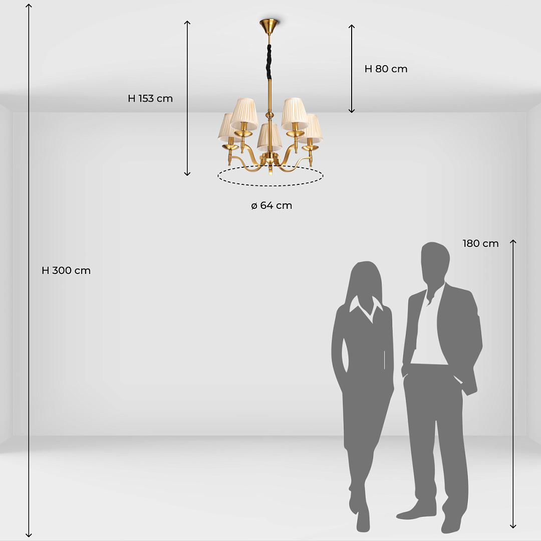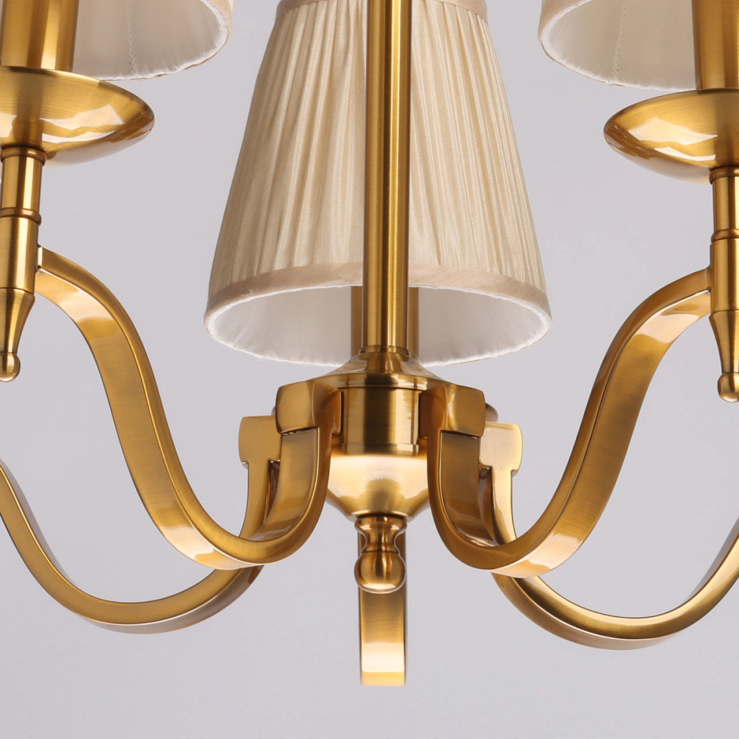 Классический дизайн сохраняет свою актуальностьЦвет медовая бронза придает люстре утонченную привлекательностьТекстильные абажуры создают мягкое комфортное освещениеЗаменяемые источники света удобны в эксплуатацииВозможность регулировать комфортную высоту