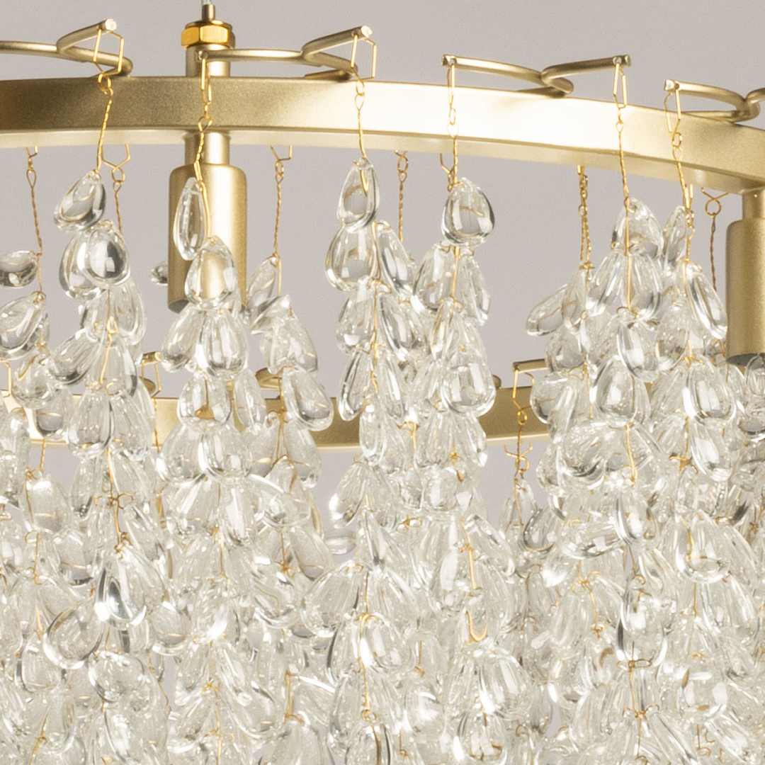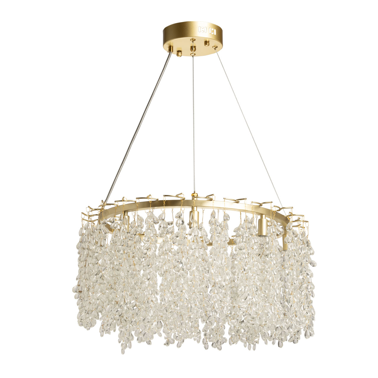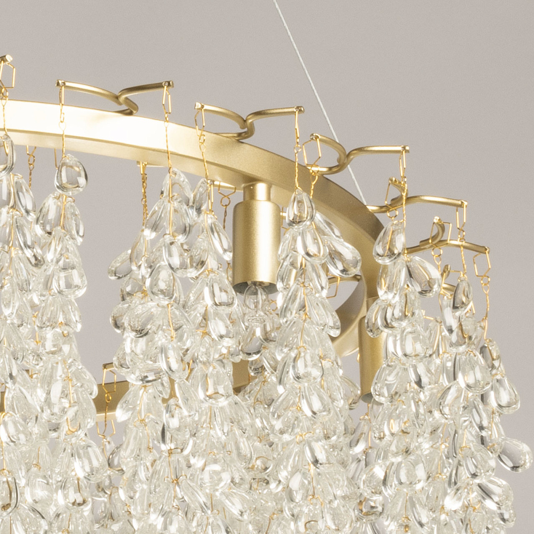 Современный дизайн с природными мотивами.Подвески из декоративного стекла формы капли создают красивую игру света.Актуальный цвет золота придает люстре шарм и эстетику. Возможность регулировать комфортную высоту. Заменяемые источники света удобны в эксплуатации.
