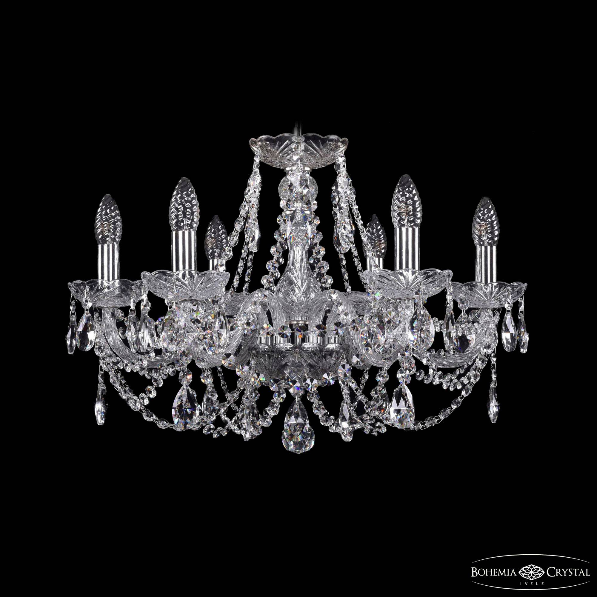 Чешская хрустальная подвесная люстра Bohemia IVELE Crystal 1406/6/195/Ni подойдет для помещений площадью от 14 до 21 квадратных метров. Арматура выполнена из высококачественного металла с нанесением гальванического покрытия. Цвет арматуры - никель. Также данная люстра доступна в цветах золото и патина. Рожок и декоративные элементы выполнены из высококачественного хрусталя с высокими отражающими и светопреломляющими характеристиками. Форма хрустальных подвесок - классическая.  Цвет хрусталя - прозрачный. По желанию люстра может быть укомплектована цветными хрустальными подвесками различной формы, а также абажурами. В люстре Bohemia Ivele Crystal используется стандартный патрон Е14, в который можно устанавливать как обычные лампы накаливания, так и светодиодные лампы. Отличным дополнением к хрустальной люстре в Вашем интерьере будут хрустальные бра, подвесы, торшеры и настольные лампы Bohemia Ivele Crystal. Мы осуществляем доставку светильников во все регионы Российской Федерации.