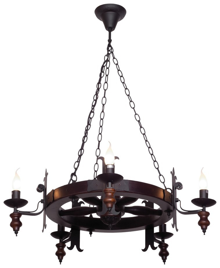 Подвесная люстра 586-723-05 итальянского производителя Velante из коллекции 586 исполнена в стиле кантри. Арматура светильника выполнена из металла и дерева тёмно-коричневого цвета с черным. Поверхность арматуры глянцевая. Плафон отсутствует. Осветительный прибор рассчитан на освещение пространства площадью 10 кв. м. Тип цоколя используемых ламп E14. Производитель рекомендует использовать лампы мощностью не более 40 Вт. Суммарная мощность светильника составляет 200 Вт. Лампочки в комплект не входят. Защита от попадания влаги и пыли внутрь изделия не предусмотрена. Рекомендуем к применению в гостиной, спальне.