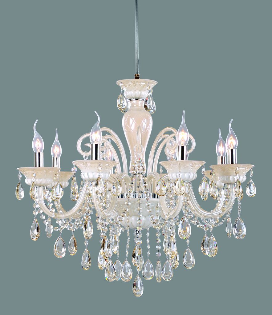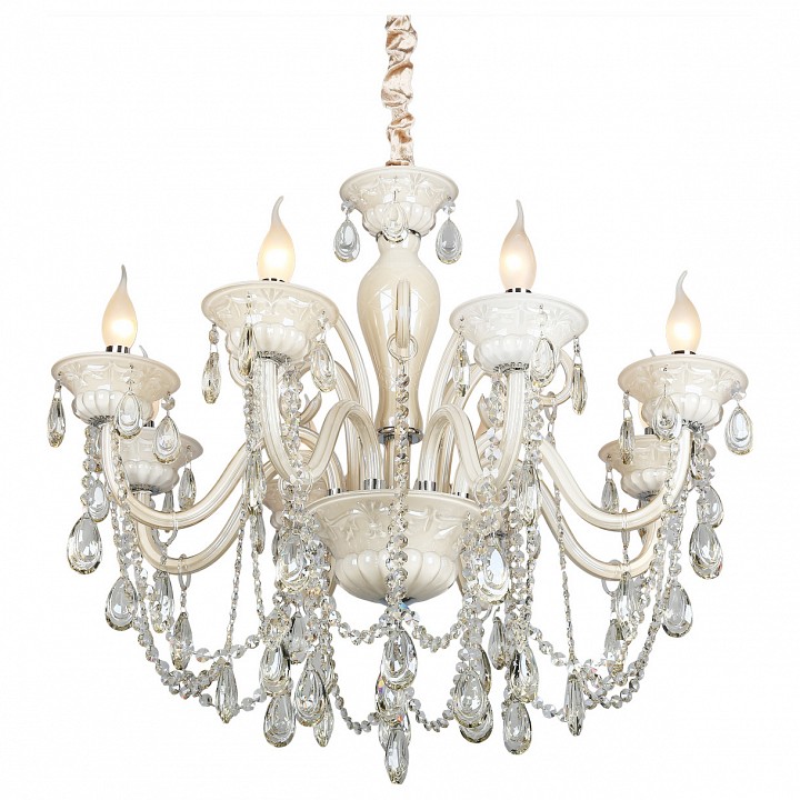 металла кремового цвета. Поверхность арматуры глянцевая. Плафон отсутствует. Осветительный прибор рассчитан на освещение пространства площадью 16 кв. м. Тип цоколя используемых ламп E14. Производитель рекомендует использовать лампы мощностью не более 40 Вт. Суммарная мощность светильника составляет 320 Вт. Лампочки в комплект не входят. Защита от попадания влаги и пыли внутрь изделия не предусмотрена. Рекомендуем к применению в гостиной, кабинете, спальне.
