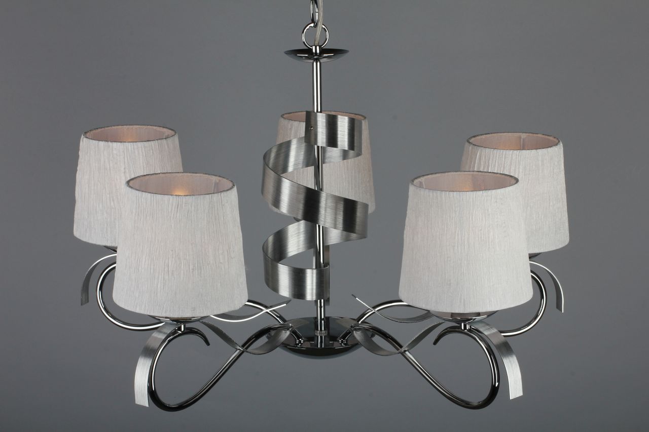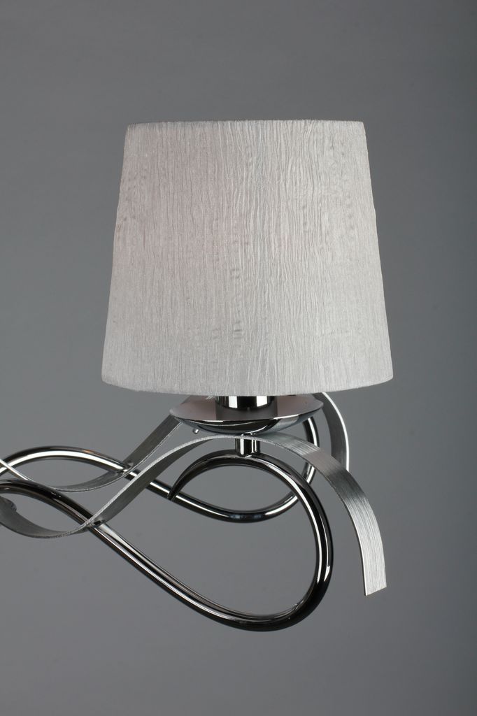 металла цвета хром. Поверхность арматуры глянцевая. Плафон изготовлен из текстиля белого цвета, имеет конусную форму и матовую рельефную поверхность. Направлен вверх и вниз. Осветительный прибор рассчитан на освещение пространства площадью 10 кв. м. Тип цоколя используемых ламп E14. Производитель рекомендует использовать лампы мощностью не более 40 Вт. Суммарная мощность светильника составляет 200 Вт. Лампочки в комплект не входят. Защита от попадания влаги и пыли внутрь изделия не предусмотрена. Рекомендуем к применению в гостиной, кабинете, спальне.