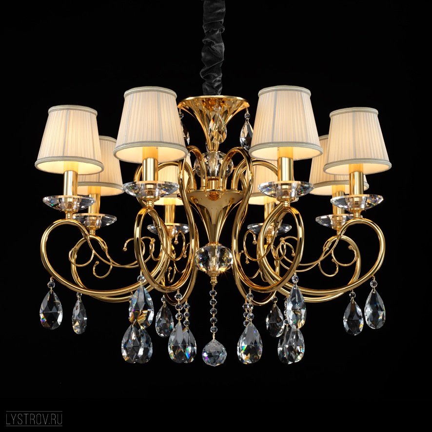 металла золотого цвета. Поверхность арматуры глянцевая. Плафон изготовлен из текстиля цвета слоновая кость, имеет конусную форму и матовую поверхность. Направлен вверх. Декоративные элементы выполнены из прозрачного хрусталя. Осветительный прибор рассчитан на освещение пространства площадью 16 кв. м. Тип цоколя используемых ламп E14. Производитель рекомендует использовать лампы мощностью не более 40 Вт. Суммарная мощность светильника составляет 320 Вт. Лампочки в комплект не входят. Защита от попадания влаги и пыли внутрь изделия не предусмотрена. Рекомендуем к применению в гостиной, кабинете, спальне.