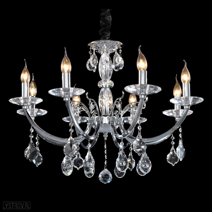 металла цвета хром. Поверхность арматуры глянцевая. Плафон отсутствует. Декоративные элементы выполнены из прозрачного хрусталя. Осветительный прибор рассчитан на освещение пространства площадью 24 кв. м. Тип цоколя используемых ламп E14. Производитель рекомендует использовать лампы мощностью не более 60 Вт. Суммарная мощность светильника составляет 480 Вт. Лампочки в комплект не входят. Защита от попадания влаги и пыли внутрь изделия не предусмотрена. Рекомендуем к применению в гостиной, кабинете, спальне.