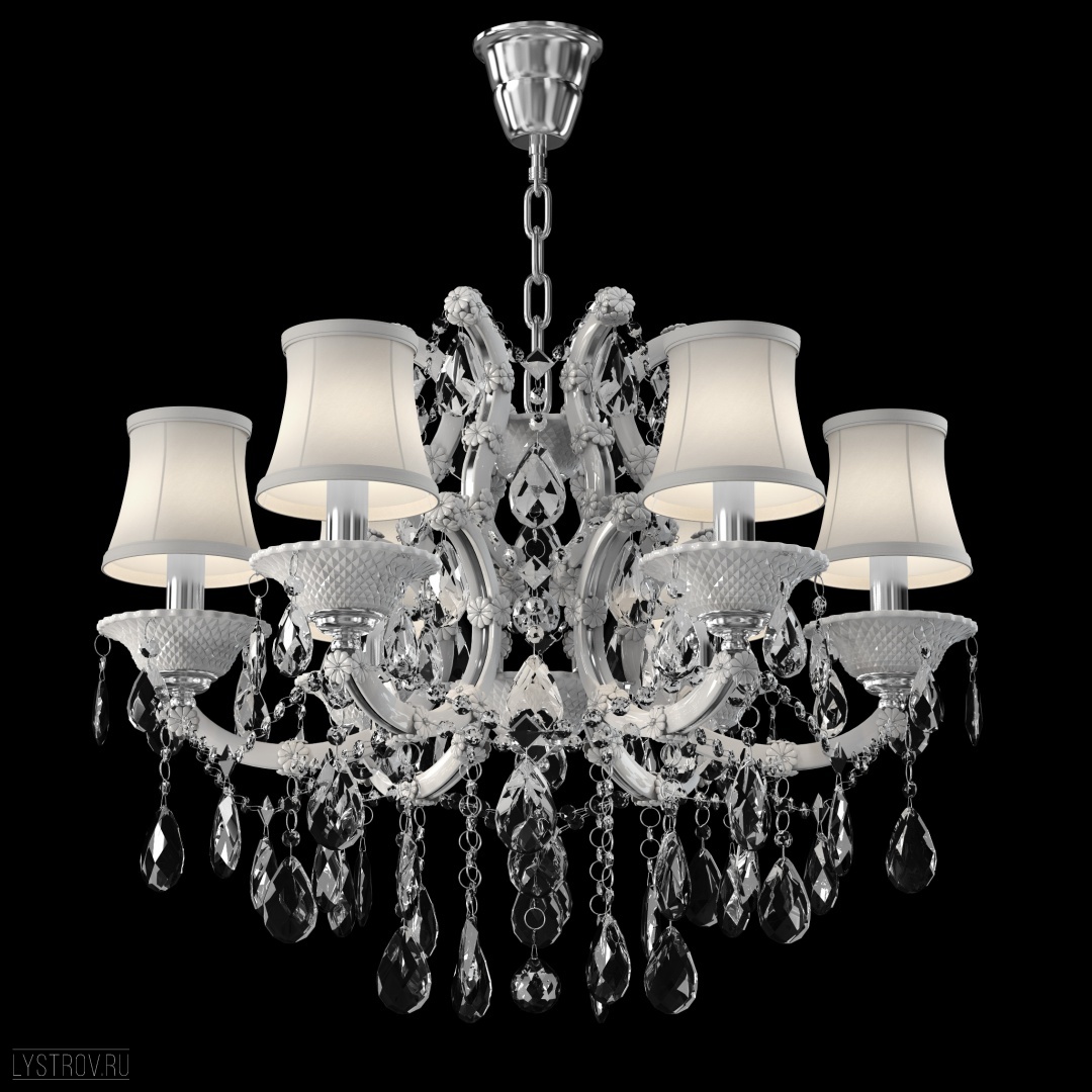 металла и акрила цветов хром и белый. Поверхность арматуры глянцевая. Плафон изготовлен из текстиля белого цвета, имеет конусную форму и матовую поверхность. Направлен вверх. Декоративные элементы выполнены из прозрачного хрусталя. Осветительный прибор рассчитан на освещение пространства площадью 12 кв. м. Тип цоколя используемых ламп E14. Производитель рекомендует использовать лампы мощностью не более 40 Вт. Суммарная мощность светильника составляет 240 Вт. Лампочки в комплект не входят. Защита от попадания влаги и пыли внутрь изделия не предусмотрена. Рекомендуем к применению в гостиной, кабинете, спальне.