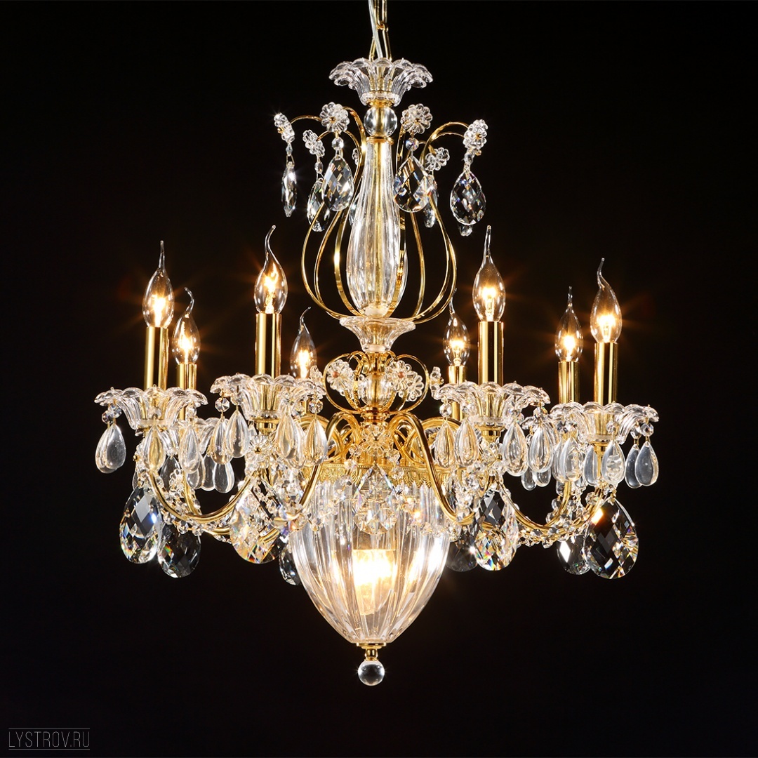 металла золотого цвета. Поверхность арматуры глянцевая. Плафон отсутствует. Декоративные элементы выполнены из прозрачного хрусталя. Осветительный прибор рассчитан на освещение пространства площадью 33 кв. м. Тип цоколя используемых ламп E14. Производитель рекомендует использовать лампы мощностью не более 60 Вт. Суммарная мощность светильника составляет 660 Вт. Лампочки в комплект не входят. Защита от попадания влаги и пыли внутрь изделия не предусмотрена. Рекомендуем к применению в гостиной, кабинете, спальне.