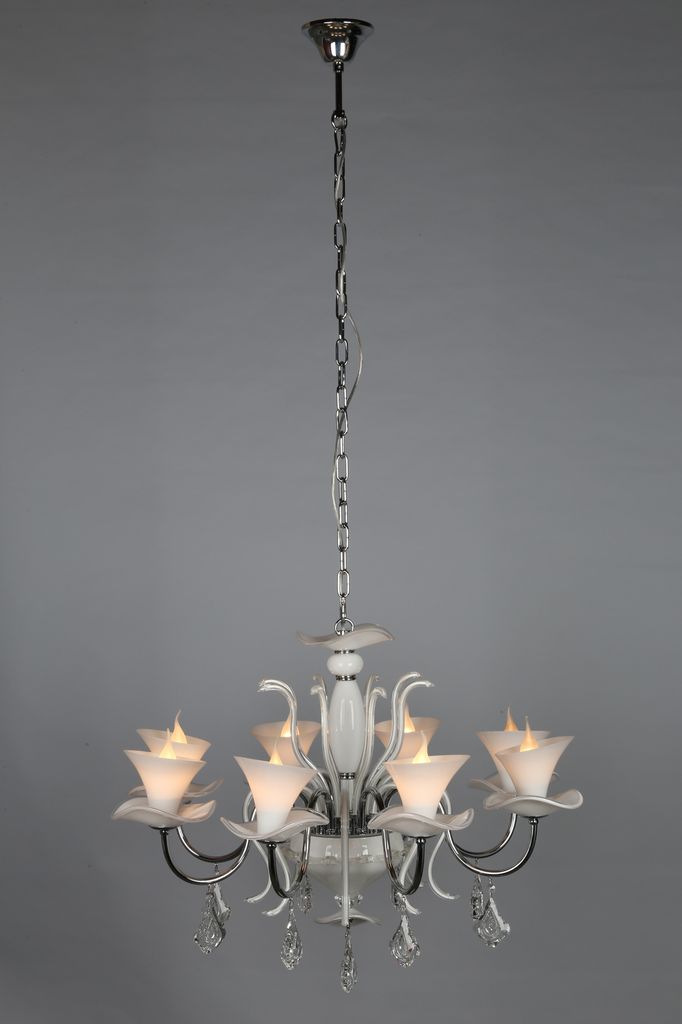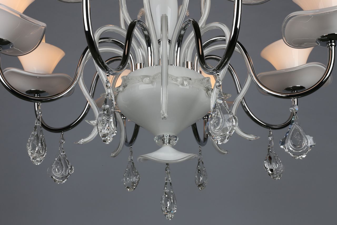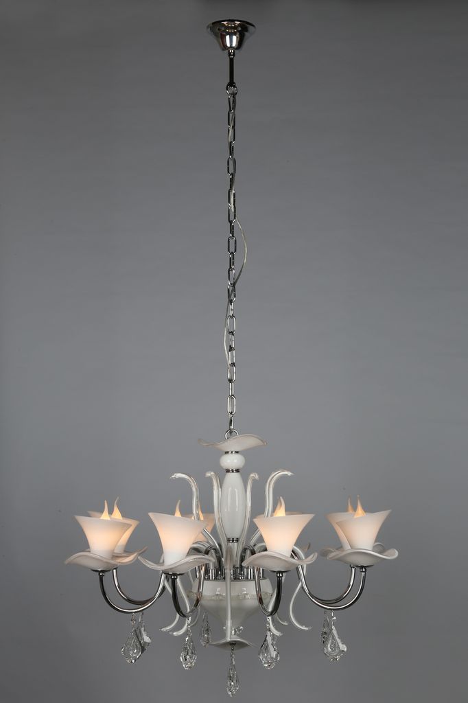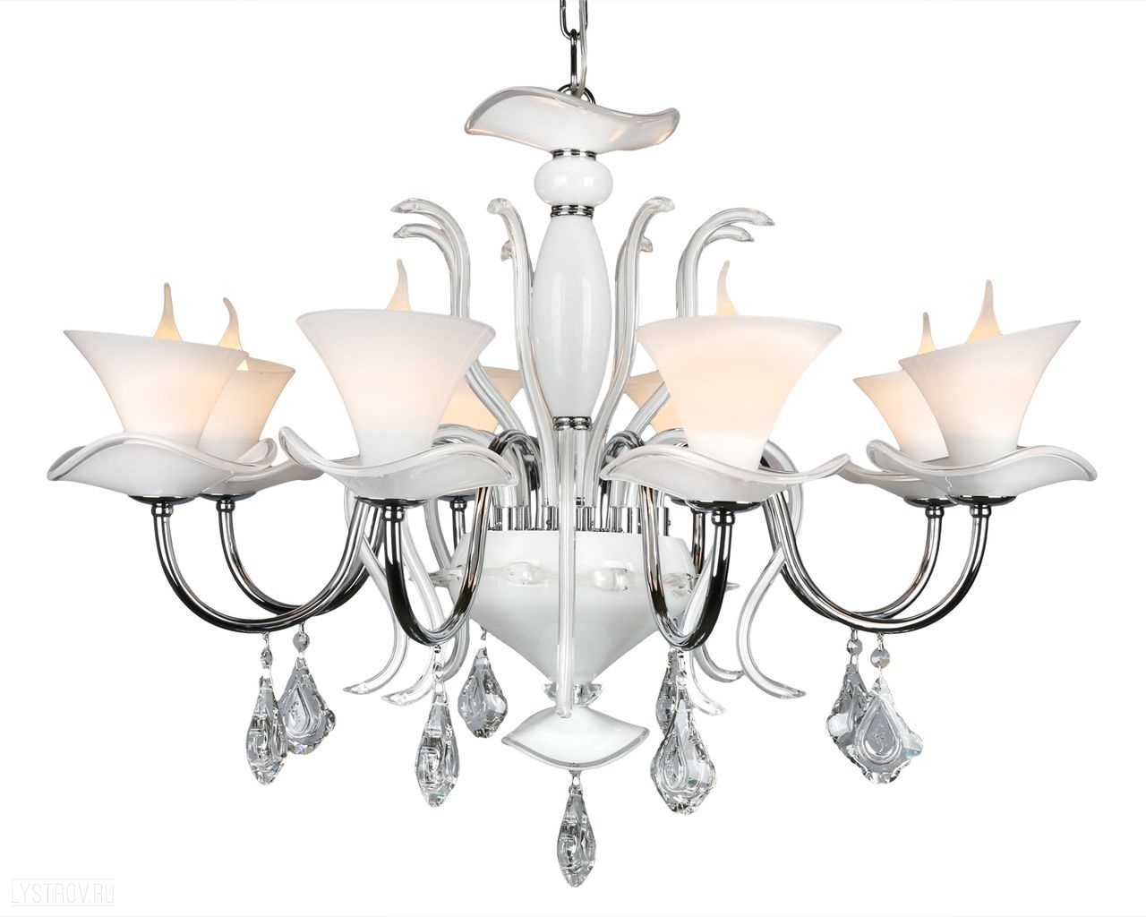 металла цветов хром и белый. Поверхность арматуры глянцевая. Плафон изготовлен из стекла белого цвета, имеет форму цветка и матовую поверхность. Направлен вверх. Декоративные элементы выполнены из хрусталя. Осветительный прибор рассчитан на освещение пространства площадью 16 кв. м. Тип цоколя используемых ламп E14. Производитель рекомендует использовать лампы мощностью не более 40 Вт. Суммарная мощность светильника составляет 320 Вт. Лампочки в комплект не входят. Защита от попадания влаги и пыли внутрь изделия не предусмотрена. Рекомендуем к применению в гостиной, кабинете, спальне.