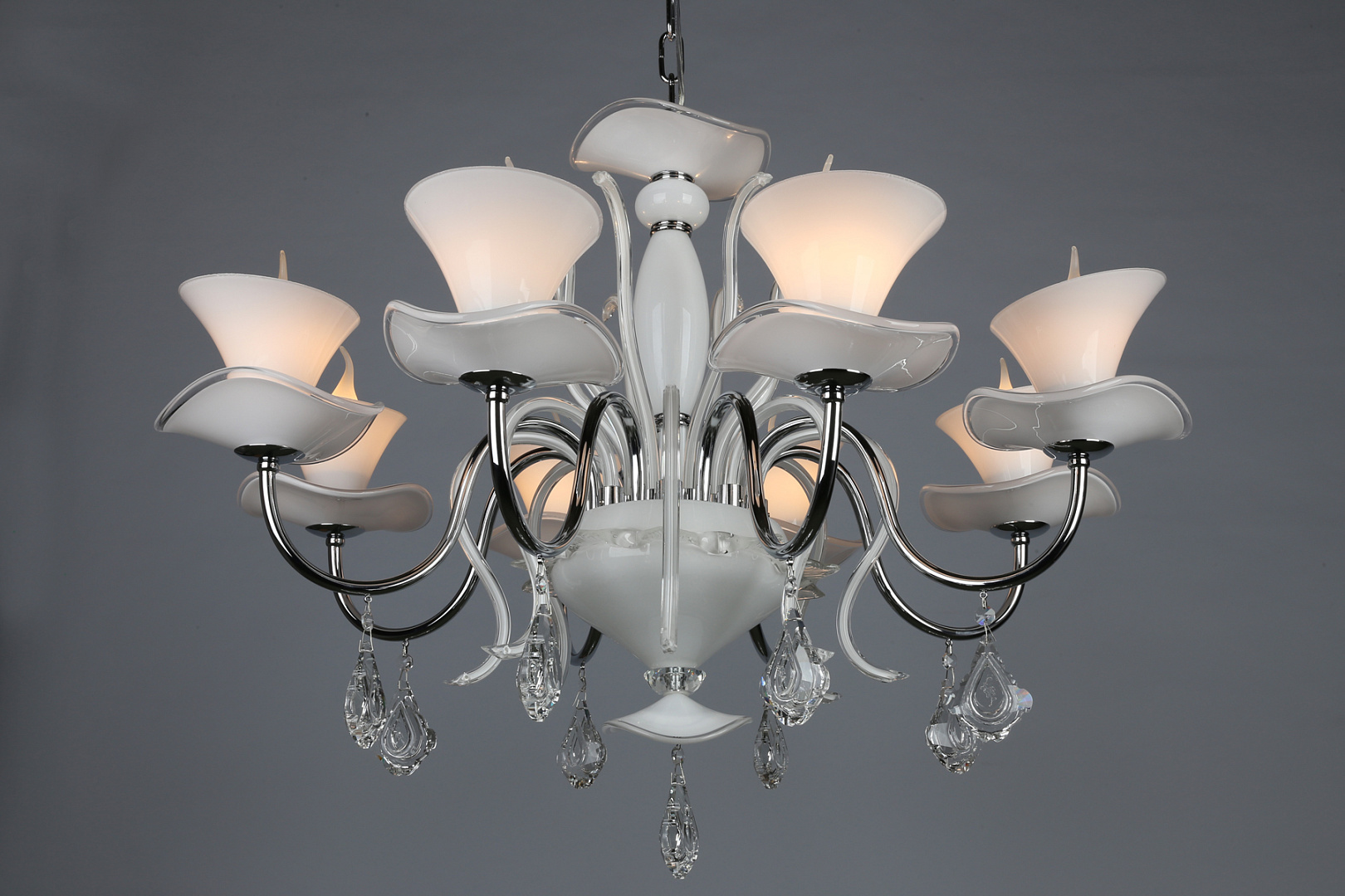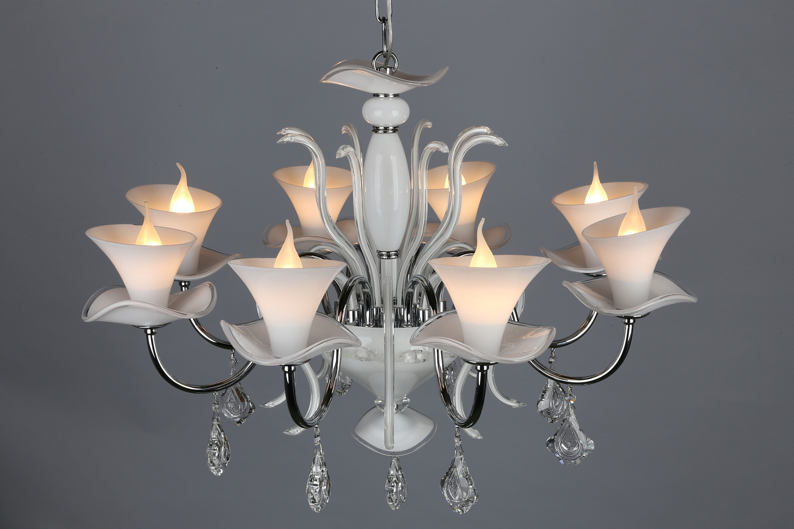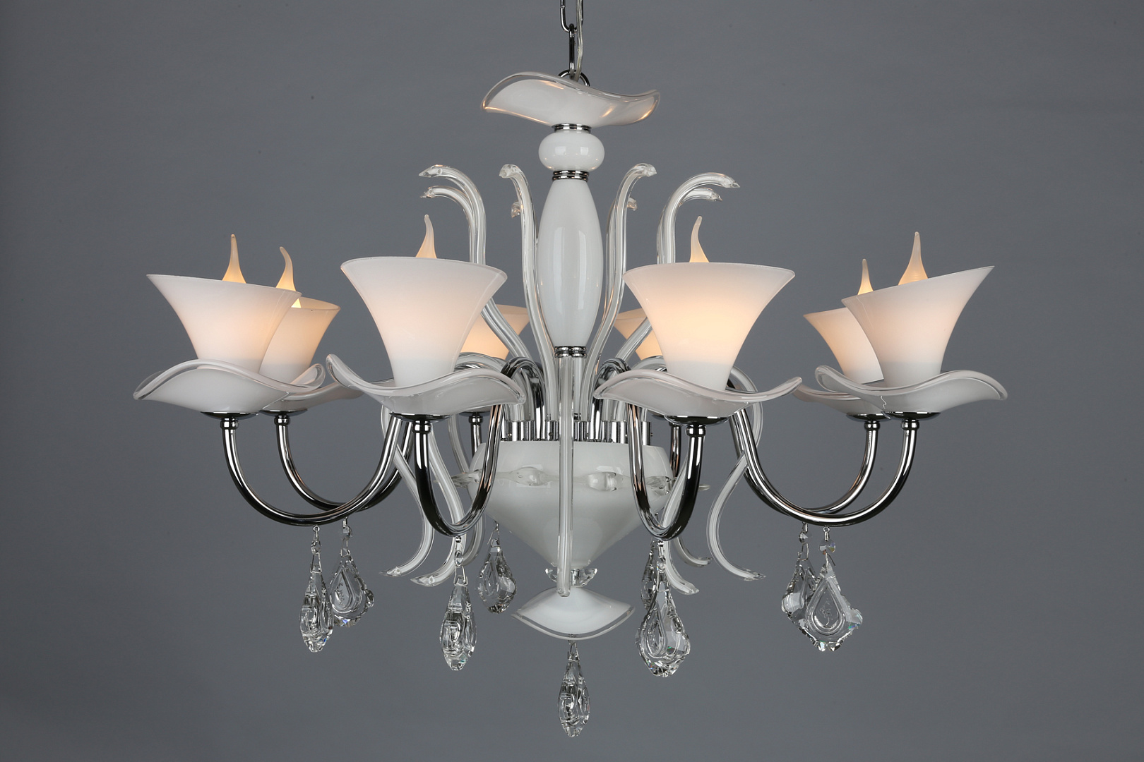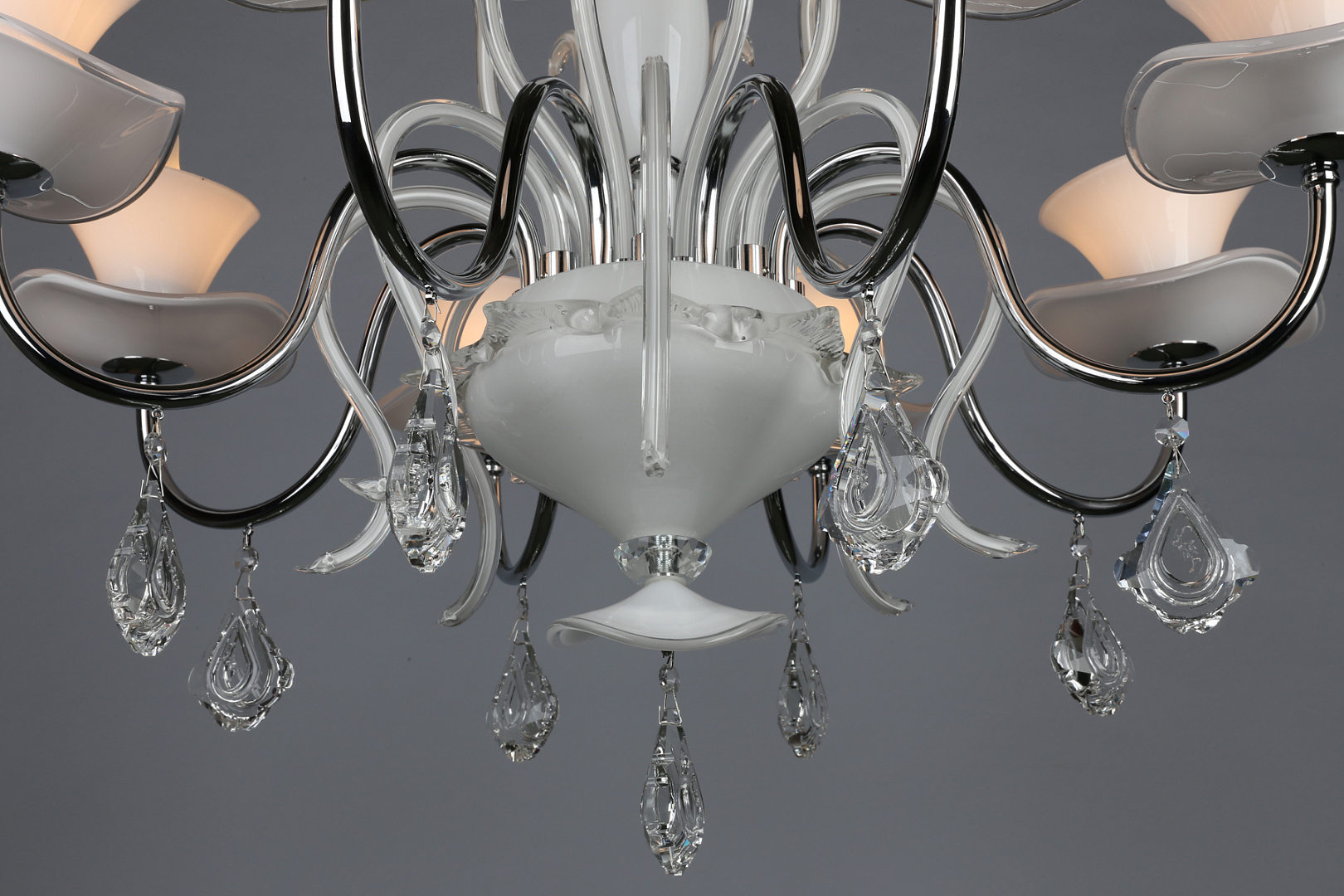 металла цветов хром и белый. Поверхность арматуры глянцевая. Плафон изготовлен из стекла белого цвета, имеет форму цветка и матовую поверхность. Направлен вверх. Декоративные элементы выполнены из хрусталя. Осветительный прибор рассчитан на освещение пространства площадью 16 кв. м. Тип цоколя используемых ламп E14. Производитель рекомендует использовать лампы мощностью не более 40 Вт. Суммарная мощность светильника составляет 320 Вт. Лампочки в комплект не входят. Защита от попадания влаги и пыли внутрь изделия не предусмотрена. Рекомендуем к применению в гостиной, кабинете, спальне.