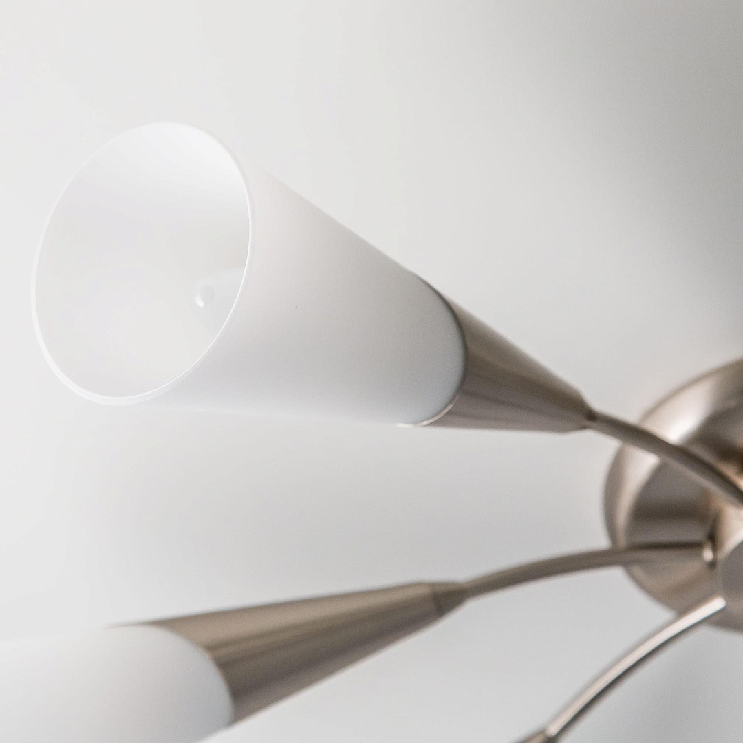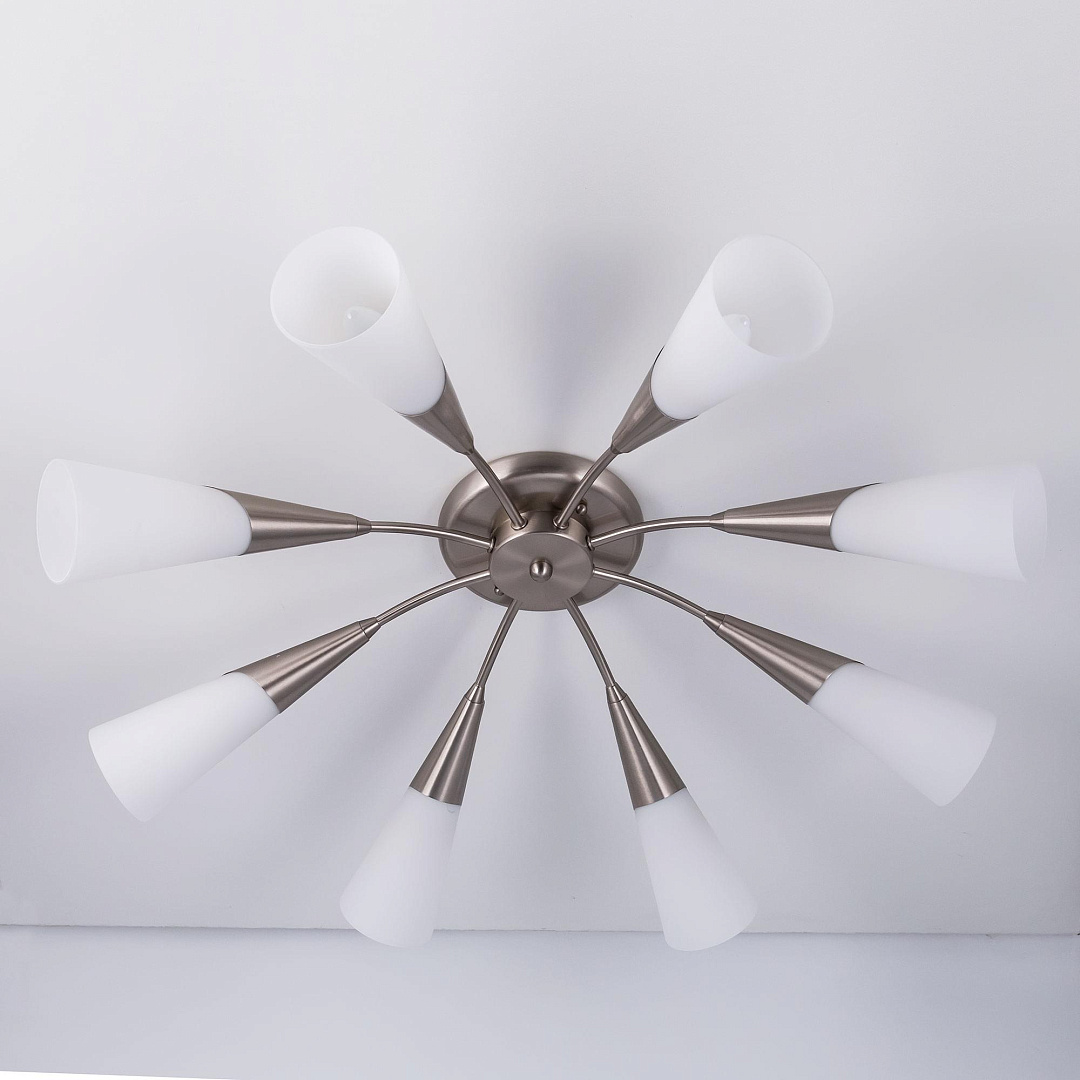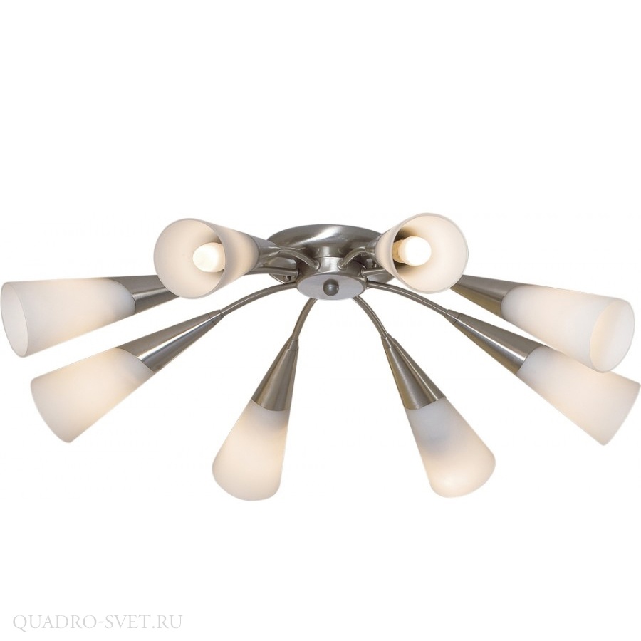 Потолочная люстра CL103181 датского производителя CITILUX из коллекции Фокус выполнена в стиле модерн. Арматура светильника выполнена из металла цвета матовый хром. Поверхность арматуры матовая. Плафон изготовлен из стекла белого цвета, имеет конусную форму и матовую поверхность. Направлен в стороны. Осветительный прибор рассчитан на освещение пространства площадью 24 кв. м. Тип цоколя используемых ламп E14. Производитель рекомендует использовать лампы мощностью не более 60 Вт. Суммарная мощность светильника составляет 480 Вт. Лампочки в комплект не входят. Защита от попадания влаги и пыли внутрь изделия не предусмотрена. Цвет свечения теплый белый (2800K-3200K). Рекомендуем к применению в гостиной, кабинете, спальне.