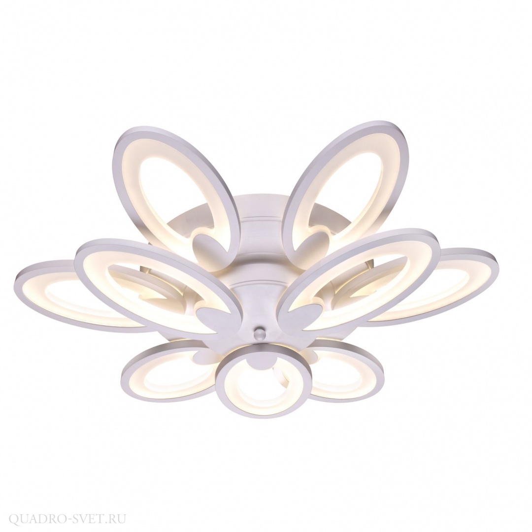 металла белого цвета. Поверхность арматуры матовая. Плафон изготовлен из акрила белого цвета, имеет сложную форму и матовую поверхность. Направлен вниз. Осветительный прибор рассчитан на освещение пространства площадью 54 кв. м. Тип цоколя используемых ламп LED. Производитель рекомендует использовать лампы мощностью не более 120 Вт. Суммарная мощность светильника составляет 120 Вт. Лампочки входят в комплект. Защита от попадания влаги и пыли внутрь изделия не предусмотрена. Имеется пульт ДУ. Рекомендуем к применению в гостиной, спальне, прихожей, кабинете.