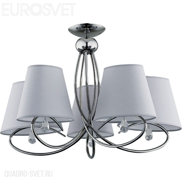 металла цвета хром. Поверхность арматуры глянцевая. Плафон изготовлен из текстиля серого цвета. Декоративные элементы выполнены из хрусталя. Осветительный прибор рассчитан на освещение пространства площадью 16 кв. м. Тип цоколя используемых ламп E14. Производитель рекомендует использовать лампы мощностью не более 40 Вт. Суммарная мощность светильника составляет 200 Вт. Лампочки в комплект не входят. Защита от попадания влаги и пыли внутрь изделия не предусмотрена. Рекомендуем к применению в гостиной, спальне, прихожей, кабинете.