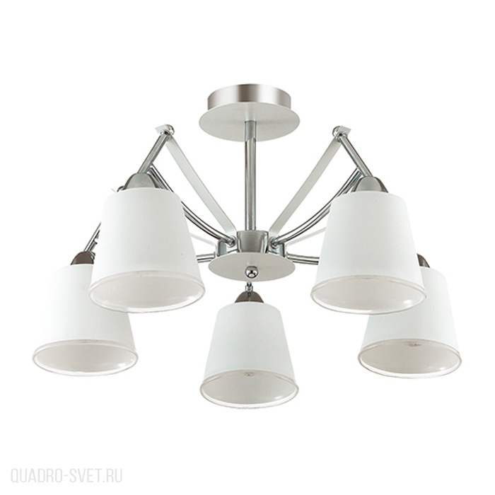 Потолочная люстра 3449/5C итальянского производителя Lumion из коллекции HADRINNA выполнена в стиле модерн. Арматура светильника выполнена из металла цвета хром, белый. Поверхность арматуры глянцевая, матовая. Плафон изготовлен из стекла белого цвета, имеет форму конуса и матовую поверхность. Направлен вниз. Осветительный прибор рассчитан на освещение пространства площадью 15 кв. м. Тип цоколя используемых ламп E14. Производитель рекомендует использовать лампы мощностью не более 60 Вт. Суммарная мощность светильника составляет 300 Вт. Лампочки в комплект не входят. Защита от попадания влаги и пыли внутрь изделия не предусмотрена. Рекомендуем к применению в гостиной, кабинете, спальне.