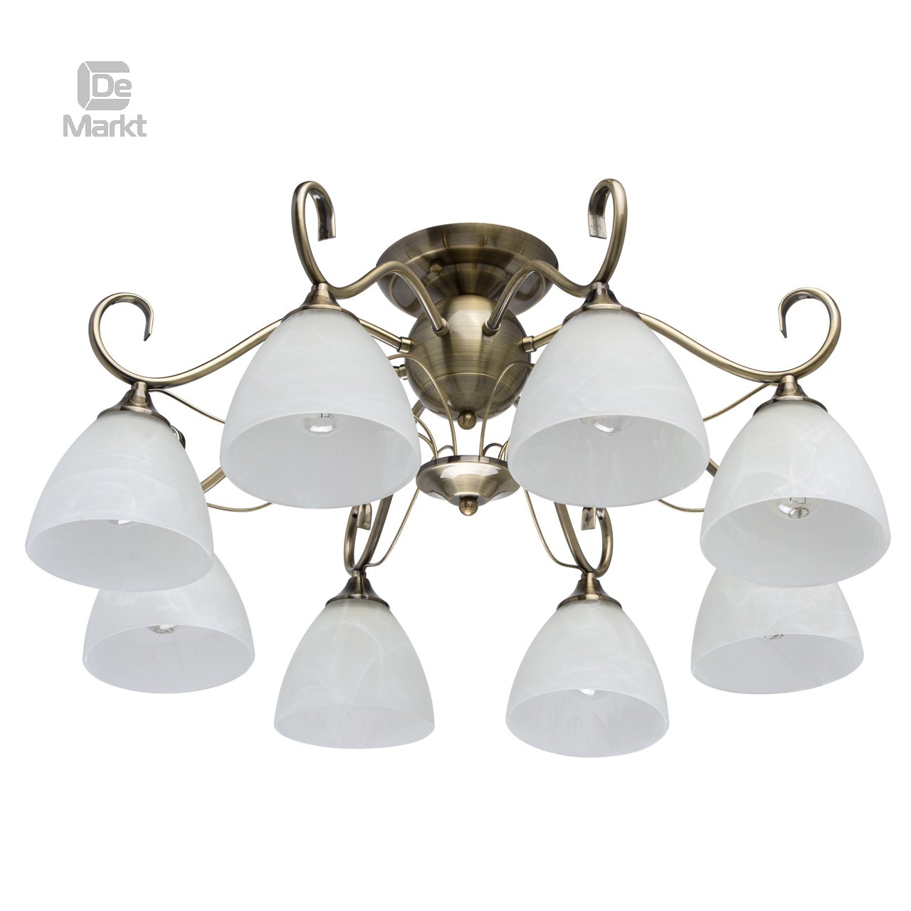 Потолочная люстра 315013008 немецкого производителя DeMarkt из коллекции Блеск выполнена в классическом стиле. Арматура светильника выполнена из металла цвета античная бронза. Поверхность арматуры глянцевая. Плафон изготовлен из стекла белого цвета, имеет форму колокола и матовую поверхность. Направлен вниз. Осветительный прибор рассчитан на освещение пространства площадью 24 кв. м. Тип цоколя используемых ламп E27. Производитель рекомендует использовать лампы мощностью не более 60 Вт. Суммарная мощность светильника составляет 480 Вт. Лампочки входят в комплект. Защита от попадания влаги и пыли внутрь изделия не предусмотрена. Цвет свечения нейтральный белый (4200K-4500K). Рекомендуем к применению в гостиной, кабинете, спальне.