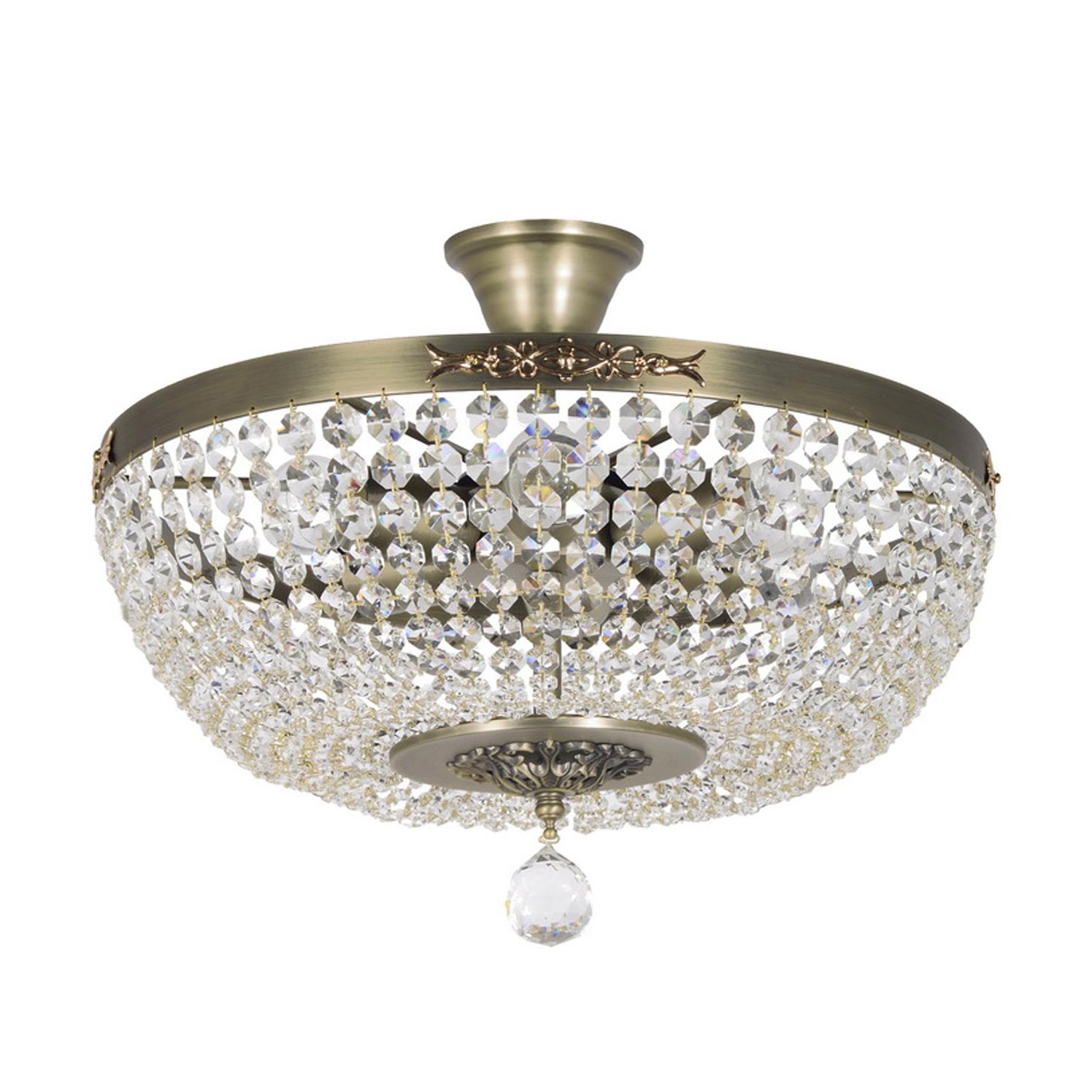 латуни цвета античная латунь. Поверхность арматуры матовая. Плафон изготовлен из хрусталя прозрачного цвета. с глянцевой поверхностью. Декоративные элементы выполнены из прозрачного хрусталя. Осветительный прибор рассчитан на освещение пространства площадью 18 кв. м. Тип цоколя используемых ламп E27. Производитель рекомендует использовать лампы мощностью не более 60 Вт. Суммарная мощность светильника составляет 360 Вт. Лампочки в комплект не входят. Защита от попадания влаги и пыли внутрь изделия не предусмотрена. Рекомендуем к применению в гостиной, кабинете, спальне.