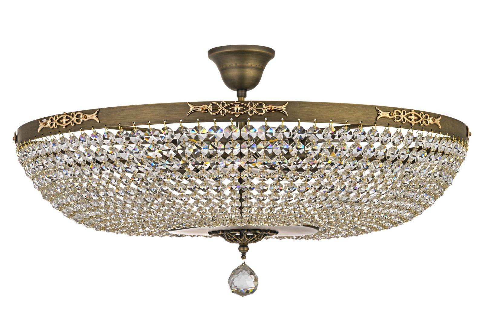 латуни цвета античная латунь. Поверхность арматуры глянцевая. Плафон изготовлен из хрусталя прозрачного цвета. с глянцевой поверхностью. Декоративные элементы выполнены из прозрачного хрусталя. Осветительный прибор рассчитан на освещение пространства площадью 18 кв. м. Тип цоколя используемых ламп E27. Производитель рекомендует использовать лампы мощностью не более 60 Вт. Суммарная мощность светильника составляет 360 Вт. Лампочки в комплект не входят. Защита от попадания влаги и пыли внутрь изделия не предусмотрена. Рекомендуем к применению в гостиной, кабинете, спальне.