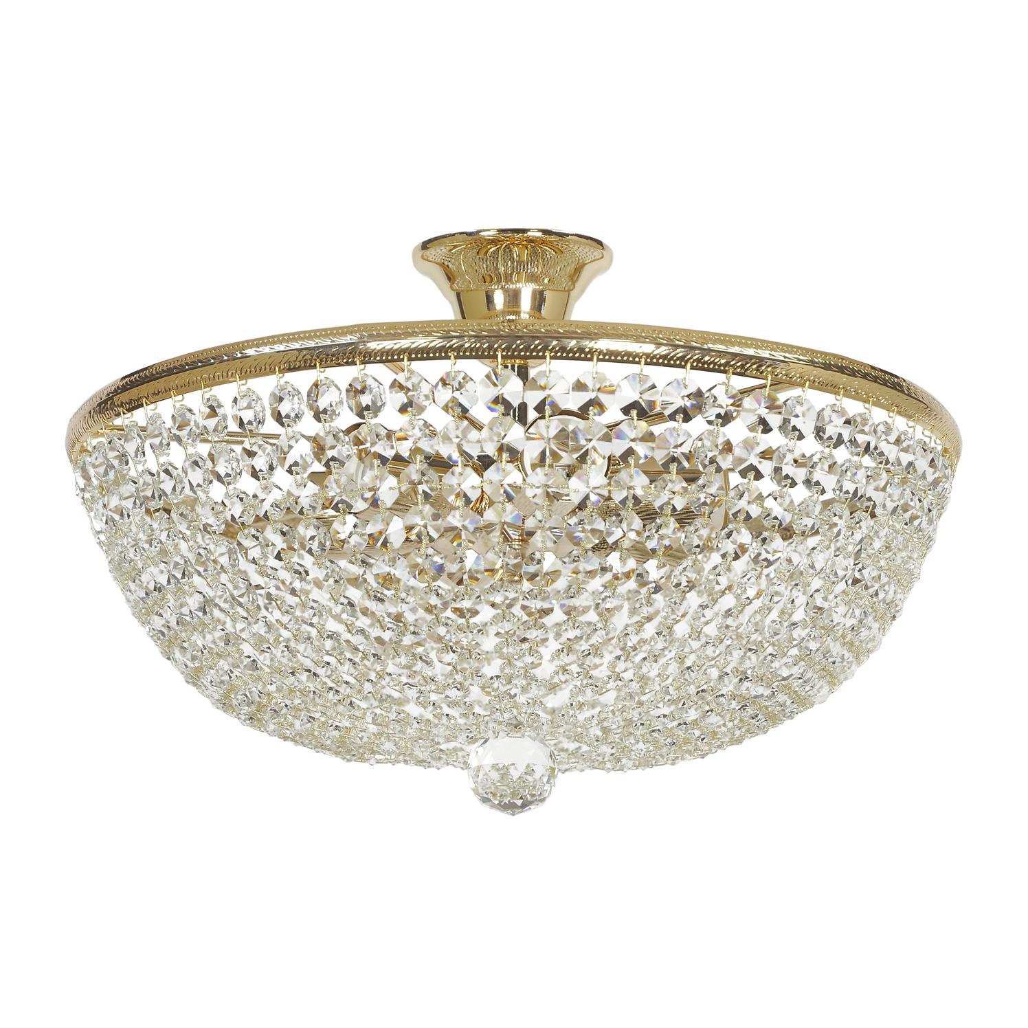 латуни золотого цвета. Поверхность арматуры матовая. Плафон изготовлен из хрусталя прозрачного цвета. с глянцевой поверхностью. Декоративные элементы выполнены из прозрачного хрусталя. Осветительный прибор рассчитан на освещение пространства площадью 12 кв. м. Тип цоколя используемых ламп E14. Производитель рекомендует использовать лампы мощностью не более 40 Вт. Суммарная мощность светильника составляет 240 Вт. Лампочки в комплект не входят. Защита от попадания влаги и пыли внутрь изделия не предусмотрена. Рекомендуем к применению в гостиной, кабинете, спальне.