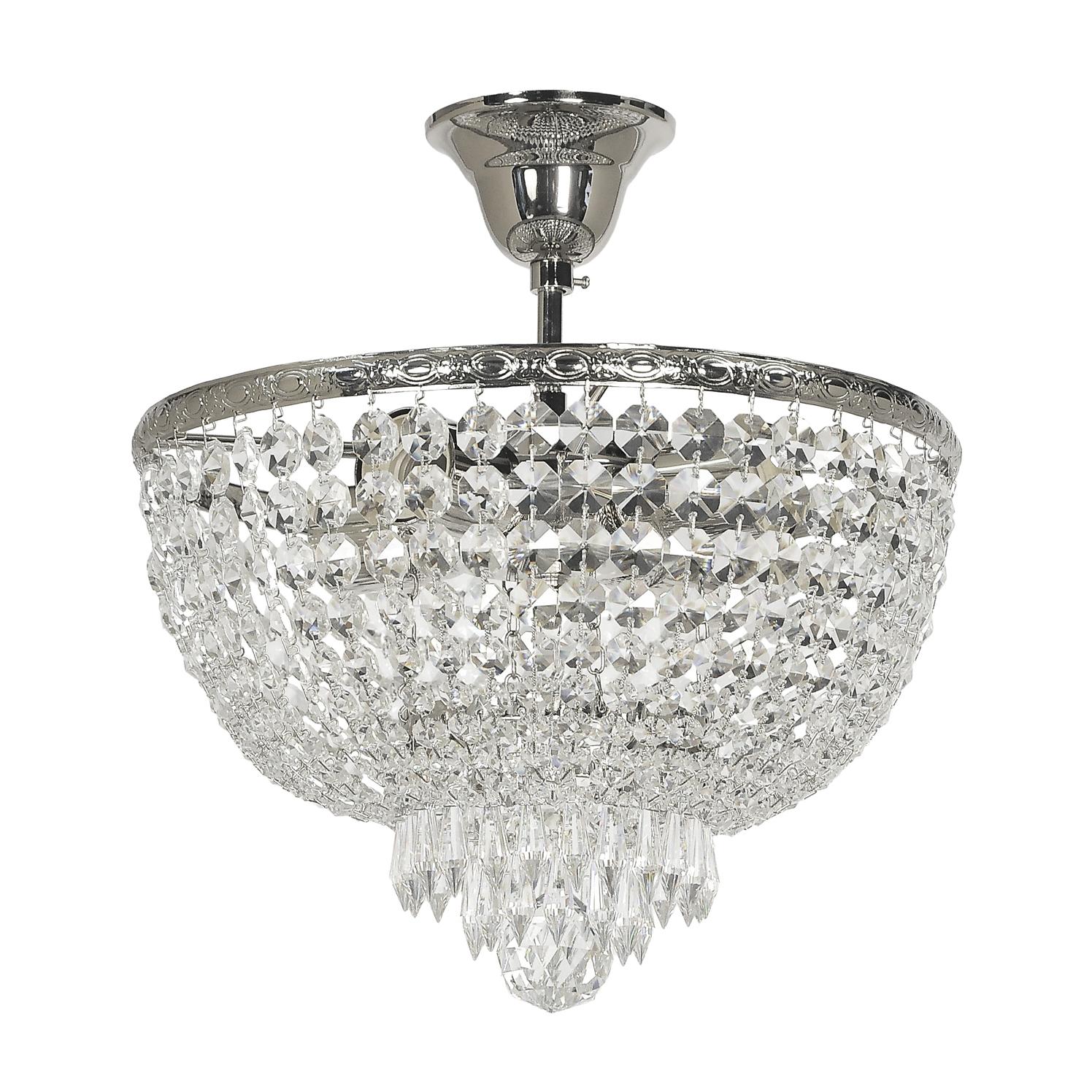 латуни цвета никель. Поверхность арматуры глянцевая. Плафон изготовлен из хрусталя прозрачного цвета. с глянцевой поверхностью. Декоративные элементы выполнены из прозрачного хрусталя. Осветительный прибор рассчитан на освещение пространства площадью 12 кв. м. Тип цоколя используемых ламп E27. Производитель рекомендует использовать лампы мощностью не более 60 Вт. Суммарная мощность светильника составляет 240 Вт. Лампочки в комплект не входят. Защита от попадания влаги и пыли внутрь изделия не предусмотрена. Рекомендуем к применению в гостиной, кабинете, спальне.