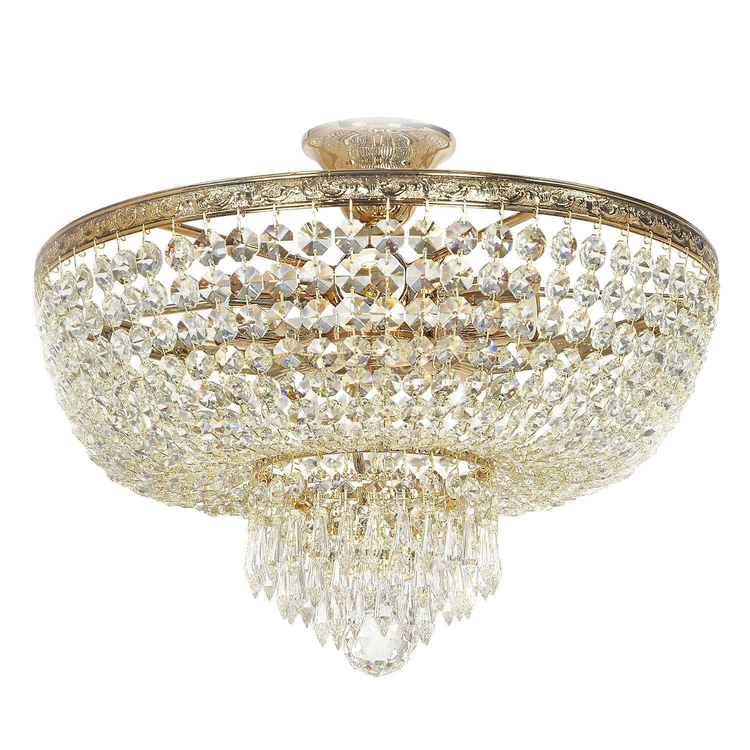 латуни золотого цвета. Поверхность арматуры глянцевая. Плафон изготовлен из хрусталя прозрачного цвета. с глянцевой поверхностью. Декоративные элементы выполнены из прозрачного хрусталя. Осветительный прибор рассчитан на освещение пространства площадью 15 кв. м. Тип цоколя используемых ламп E27. Производитель рекомендует использовать лампы мощностью не более 60 Вт. Суммарная мощность светильника составляет 300 Вт. Лампочки в комплект не входят. Защита от попадания влаги и пыли внутрь изделия не предусмотрена. Рекомендуем к применению в гостиной, кабинете, спальне.