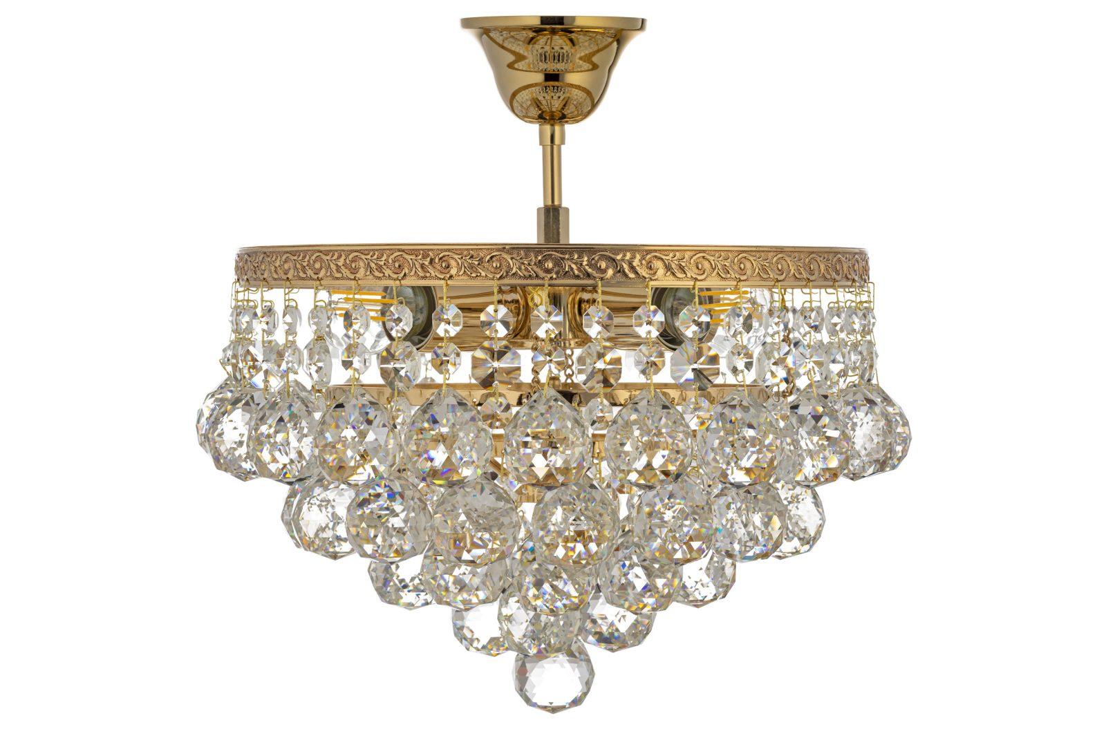 латуни золотого цвета. Поверхность арматуры глянцевая. Плафон изготовлен из хрусталя прозрачного цвета. с глянцевой поверхностью. Декоративные элементы выполнены из прозрачного хрусталя. Осветительный прибор рассчитан на освещение пространства площадью 12 кв. м. Тип цоколя используемых ламп E27. Производитель рекомендует использовать лампы мощностью не более 60 Вт. Суммарная мощность светильника составляет 240 Вт. Лампочки в комплект не входят. Защита от попадания влаги и пыли внутрь изделия не предусмотрена. Рекомендуем к применению в гостиной, кабинете, спальне.