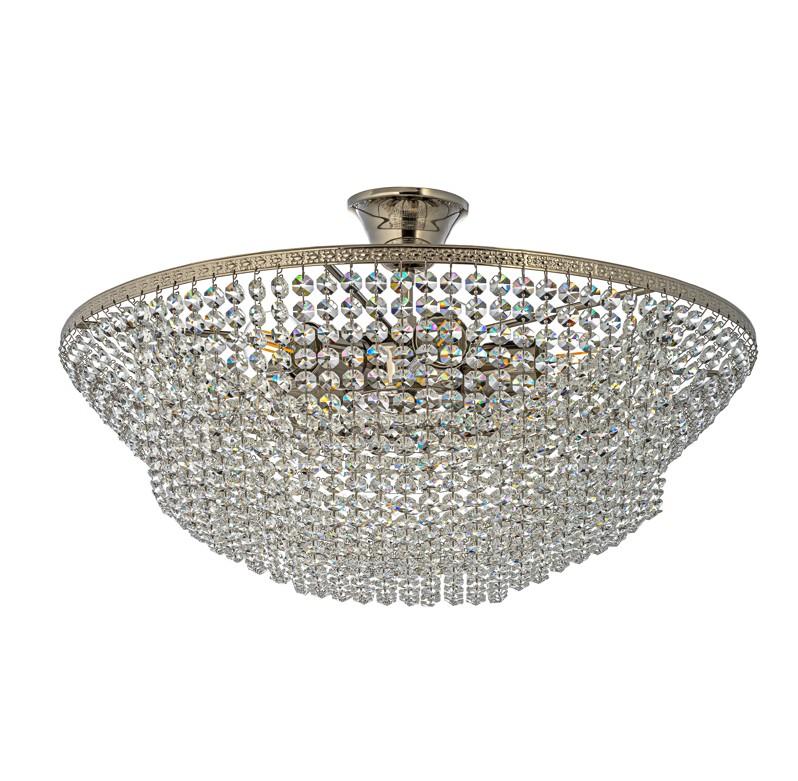 латуни цвета никель. Поверхность арматуры глянцевая. Плафон изготовлен из хрусталя прозрачного цвета. с глянцевой поверхностью. Декоративные элементы выполнены из прозрачного хрусталя. Осветительный прибор рассчитан на освещение пространства площадью 18 кв. м. Тип цоколя используемых ламп E27. Производитель рекомендует использовать лампы мощностью не более 60 Вт. Суммарная мощность светильника составляет 360 Вт. Лампочки в комплект не входят. Защита от попадания влаги и пыли внутрь изделия не предусмотрена. Рекомендуем к применению в гостиной, кабинете, спальне.