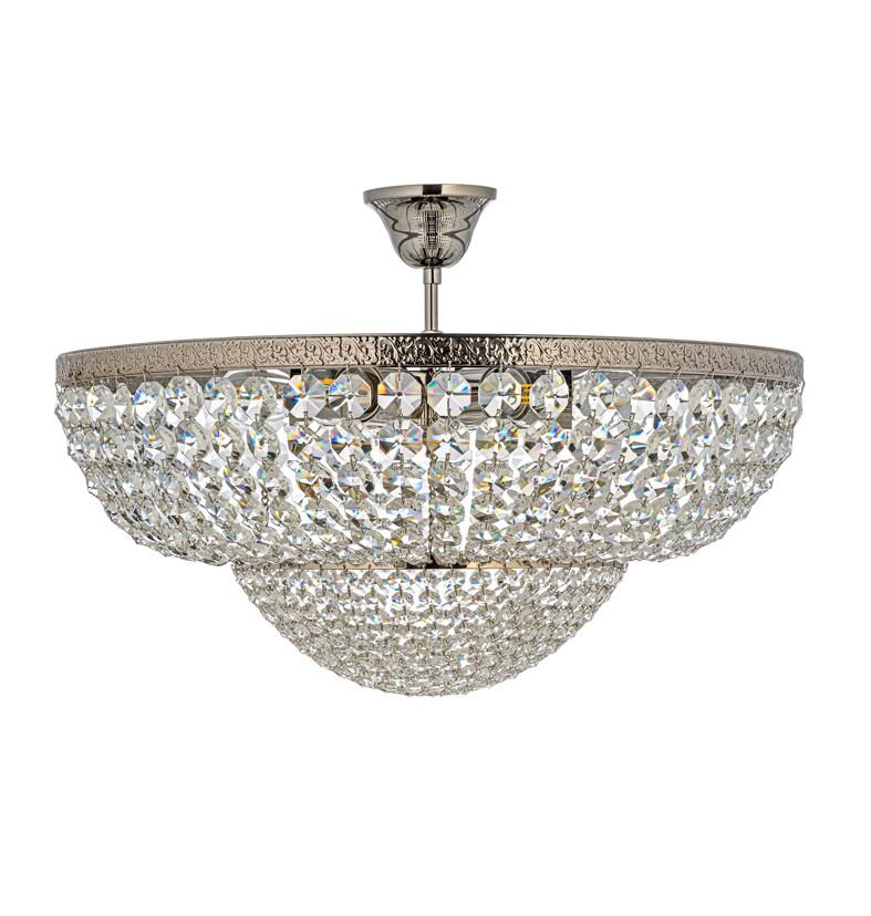 латуни цвета никель. Поверхность арматуры глянцевая. Плафон изготовлен из хрусталя прозрачного цвета. с глянцевой поверхностью. Декоративные элементы выполнены из прозрачного хрусталя. Осветительный прибор рассчитан на освещение пространства площадью 18 кв. м. Тип цоколя используемых ламп E27. Производитель рекомендует использовать лампы мощностью не более 60 Вт. Суммарная мощность светильника составляет 360 Вт. Лампочки в комплект не входят. Защита от попадания влаги и пыли внутрь изделия не предусмотрена. Рекомендуем к применению в гостиной, кабинете, спальне.